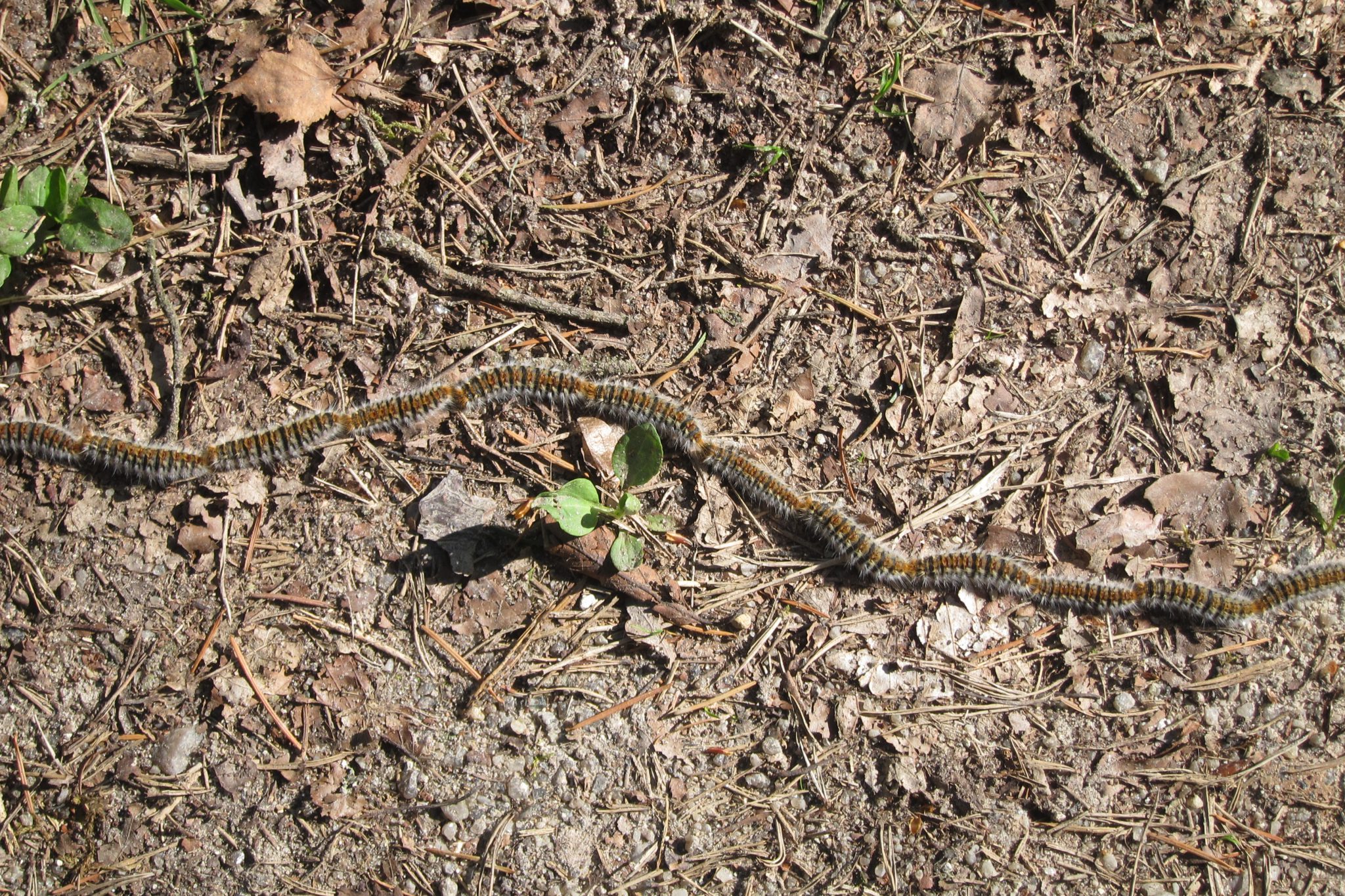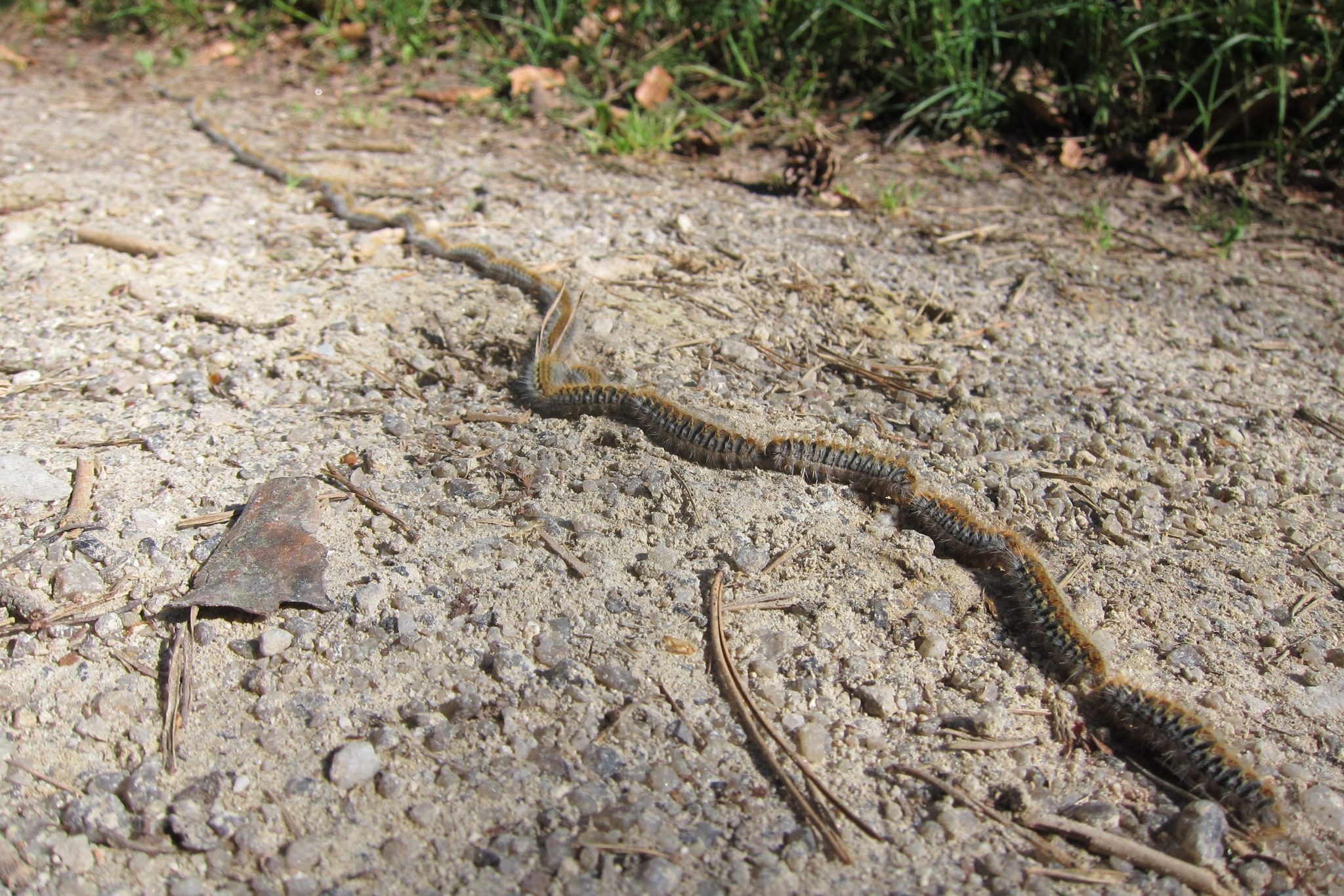 Vispār mana rīta doma par vēju un aukstumu nemaz nebija tik muļķīga. Lai arī rīts jau krietni iesilis, joprojām iet ir auksti. Ceļā atkal sastopu vienu kāpurķēdi. Šoreiz tā nav ieslēpusies lapās un kādu brīdi vēroju smieklīgo karavānu. Skatos, ka viens kāpurs tāds sagumis guļ, bet citi lokās uz priekšu. Nodomāju, ka tā izskatās dabiskā atlase. Bet nē – kolīdz garām slīd pēdējā kāpura dibens, viņš “caps” – ieķeras astē un lokās līdzi. Varbūt, ka viņi dara tāpat kā putni – kolīdz priekšējais velkonis sagurst, to nomaina kāds cits un tā viņi pēc kārtas var atpūsties.
