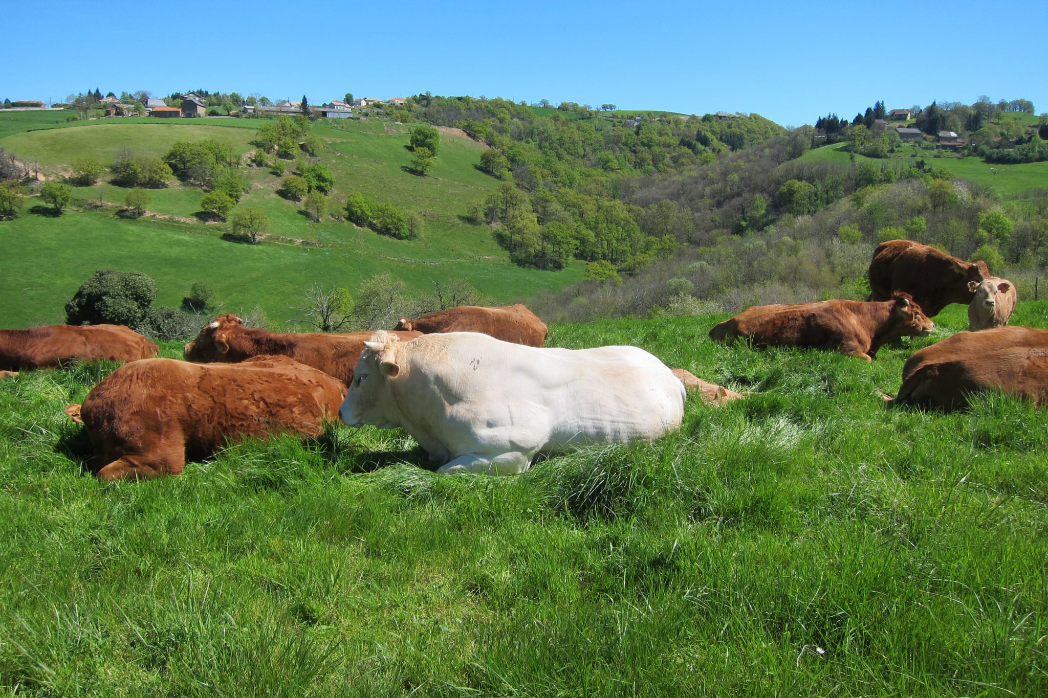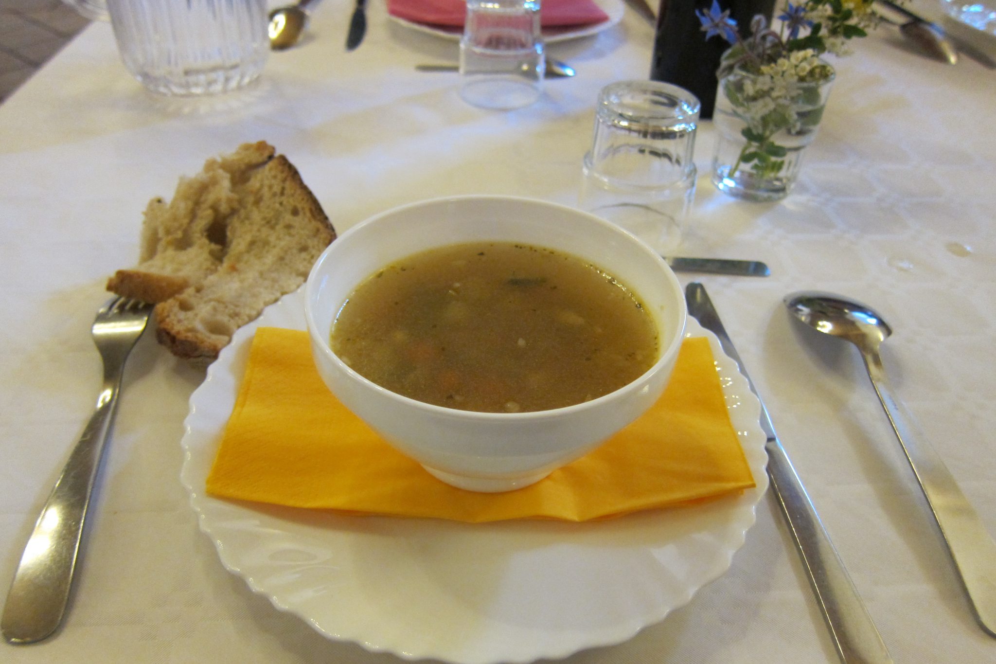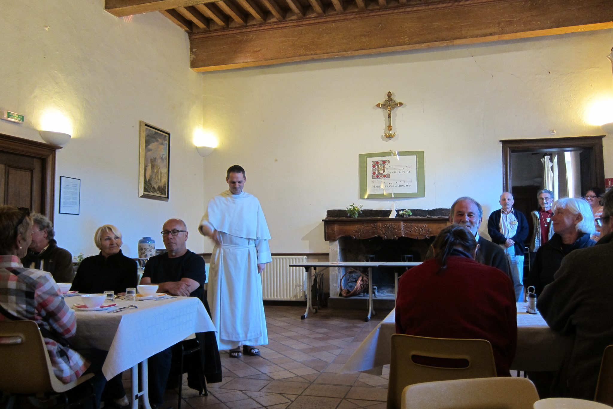 Vakariņas sākas ar ievadu, ko saka vīrs baltā talārā. Divās valodās. Franciski viņš runā kādas trīs minūtes, pēc tam to pašu izsaka ar trim angļu vārdiem. Un kopā ar brīvprātīgajiem uzdzied Santjago ceļa himnu “Utreia”. Tad tiek nesti ēdieni – zupa, tai seko salāti, tad lazanjai līdzīgs ēdiens, tad fromage, noslēgumā torte. Visi gabaliņi dzelteni ar kādu džemu viducī, bet viens – ar avenēm. Sēžu galda malā un man visu sanāk izvēlēties pirmajai. Skatos ar kāru skatienu, ko nevar nepamanīt, uz aveņu gabaliņu. Galda biedri sāk smieties – nu ņem, ņem! Paņēmu arī. Labs bija.