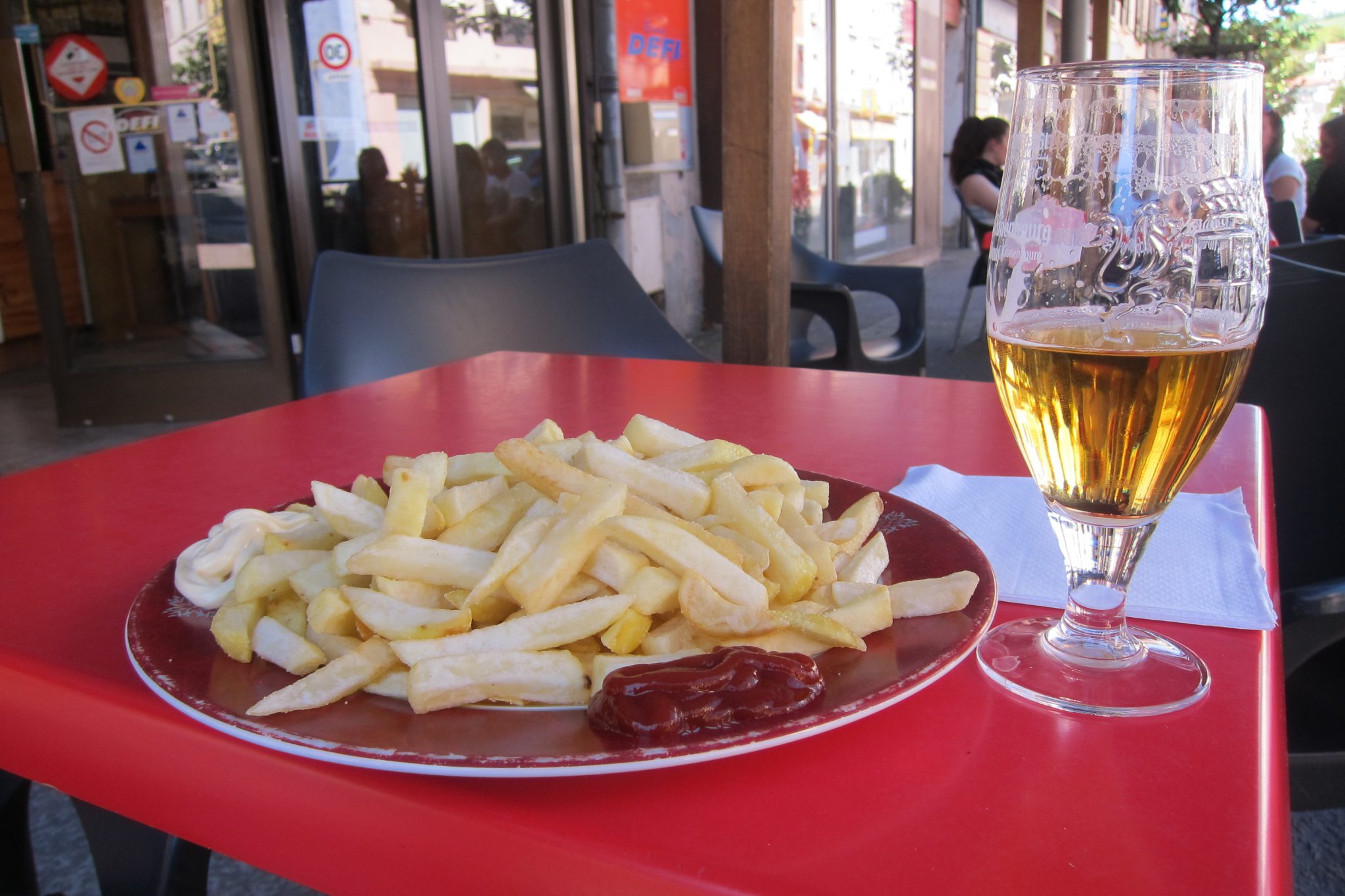 Man tiek atnests milzīgs šķīvis, pilns ar kartupeļiem un malās simetriski uzspiestām čupiņām – kečups, majonēze, sinepes. Vai būšot labi? Protams, lieliski. Malkoju savu alu, graužu frī un domāju, cik viņš man par šo neordināro joku noplēsīs. Nu, zinot cik te maksā pasūtīt ēdienu, nospriežu, ka par kartupeļiem šķiršos no kādiem 7 eiro. Kad viņš jau trešo reizi apvaicājas – vai viss labi garšo un vai nevajag papildināt kādu mērci, sāk rasties aizdoma, ka ar tiem septiņiem eiro varbūt nemaz netikšu cauri. Tomēr, kad tieku pie maksāšanas, esmu patīkami pārsteigta – maltīte izmaksā vien 3,60.