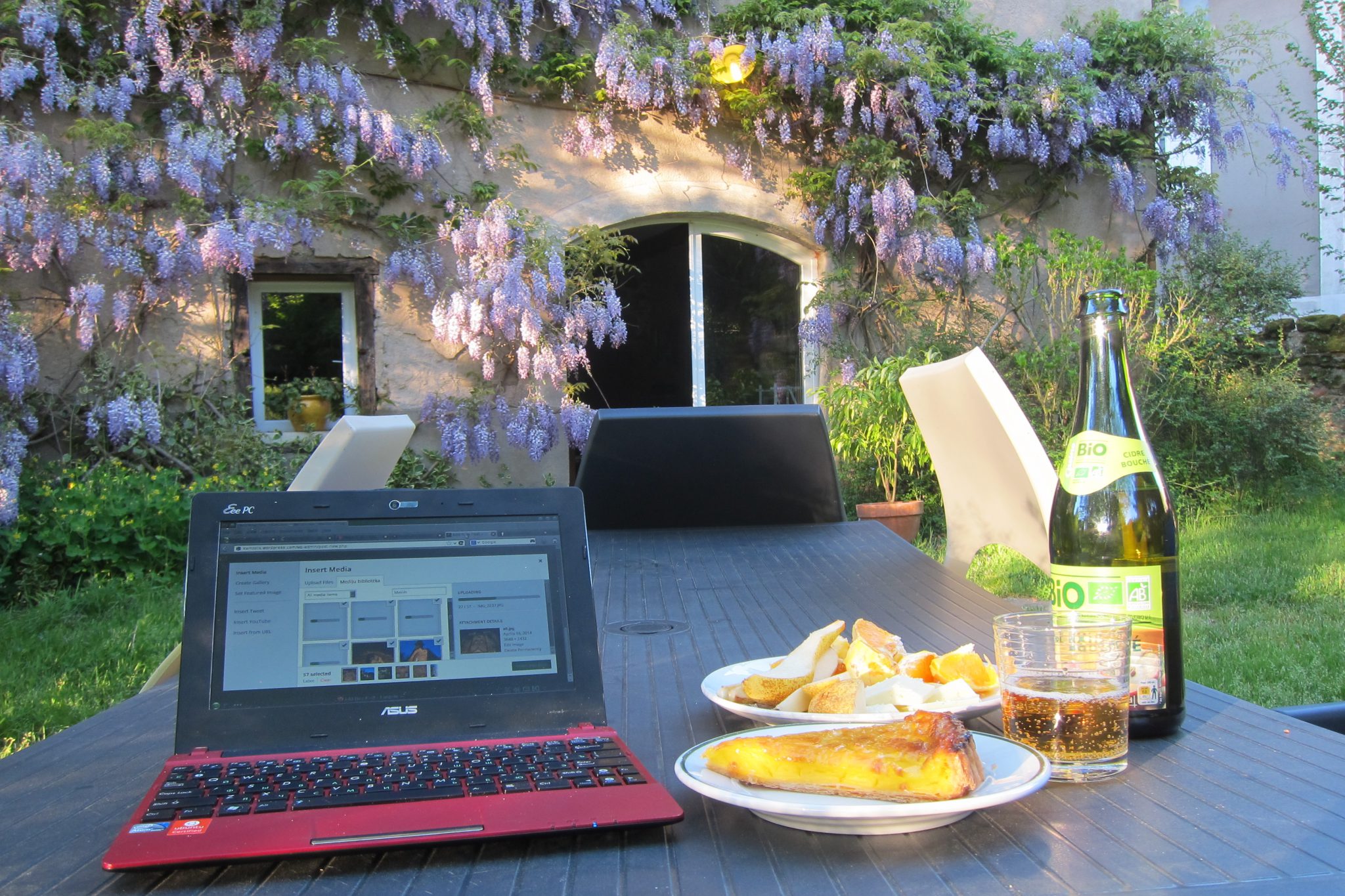 Iekārtojos ar visu proviantu un atkorķēju sidru. Garšīgs, bet kā limonāde. Paskatos grādus – ok, 3%. Labi vien ir, rīt nebūs nekāda slaistīšanās. Rakstu un našķojos, līdz atkal pie apvāršņa parādās saimniece. Piedāvāju glāzi sidra un man par lielu prieku, viņa piekrīt. Tā nu mēs sēžam dārzā, malkojam dzērienu un pļāpājam par dzīvi. Visticamāk, šis ir mans pēdējais Ceļa vakars un tas šoreiz ir tieši tāds, kādu to šoreiz vēlos.