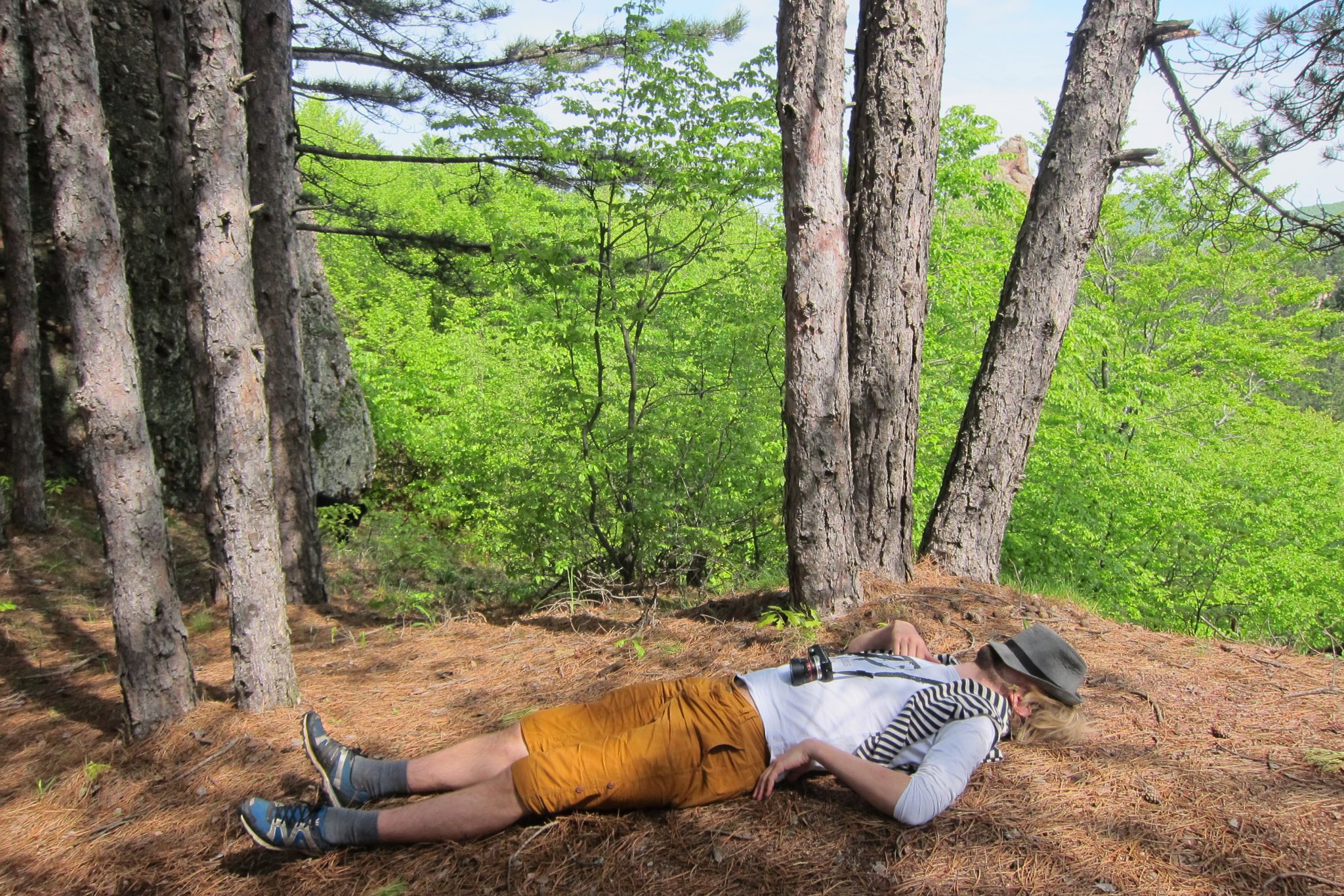 Izbraucam 11 minūtes pēc deviņiem, gandrīz kā plānots. Esam paēduši pieklājīgas brokastis un gatavi kāpelēšanai pa Belogradčikas klinšu takām. Pirmajās takās mūs iesauc slēpnis un, nedaudz pakāpušies, jau varam sākt novērtēt apkaimes daiļumu – no zaļā meža paklāja ik pa vietai spraucas ārā sarkanīgi akmens klinšu stabi.