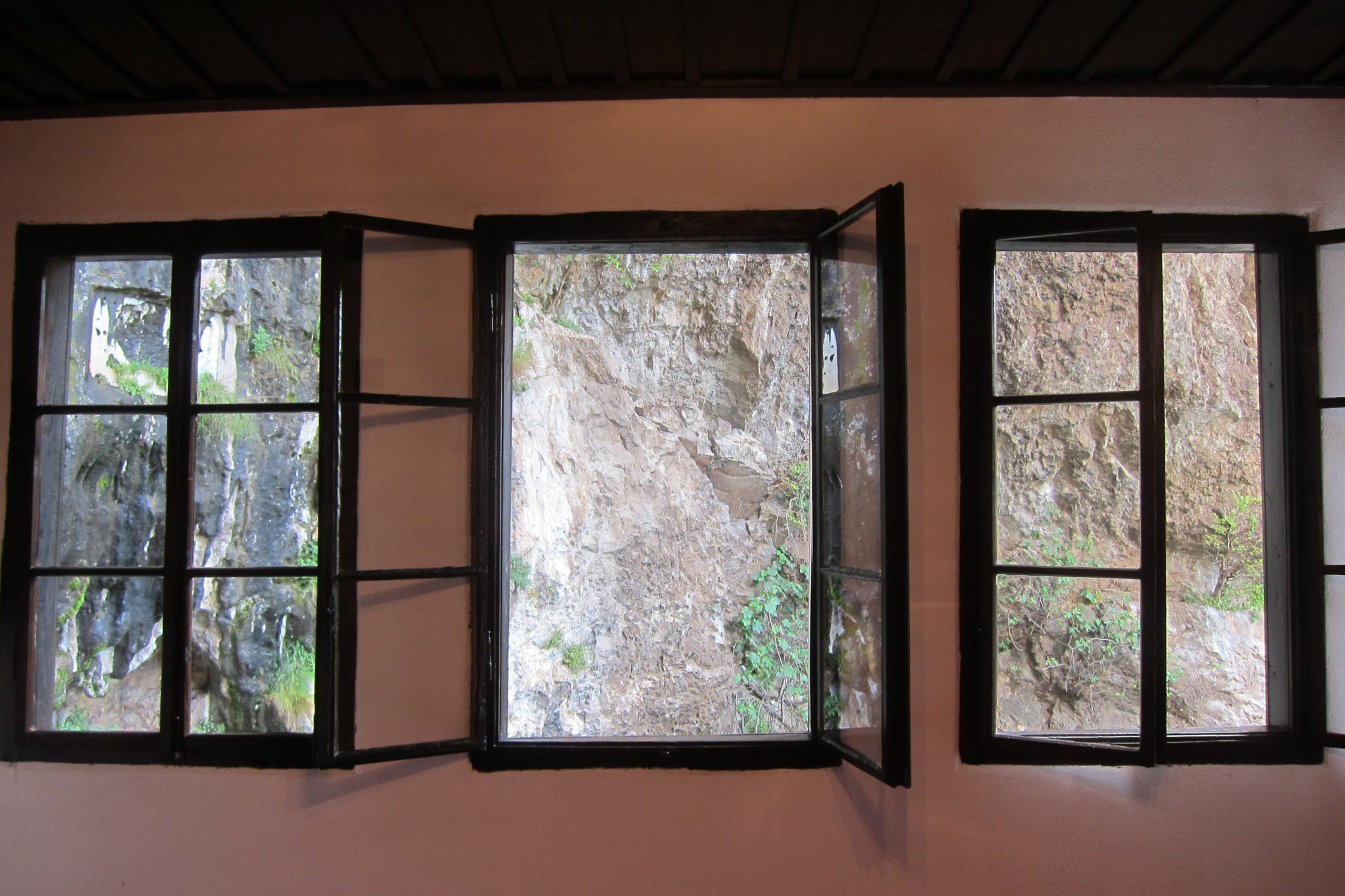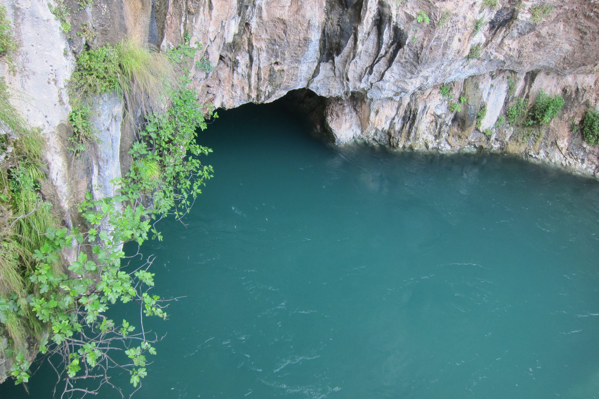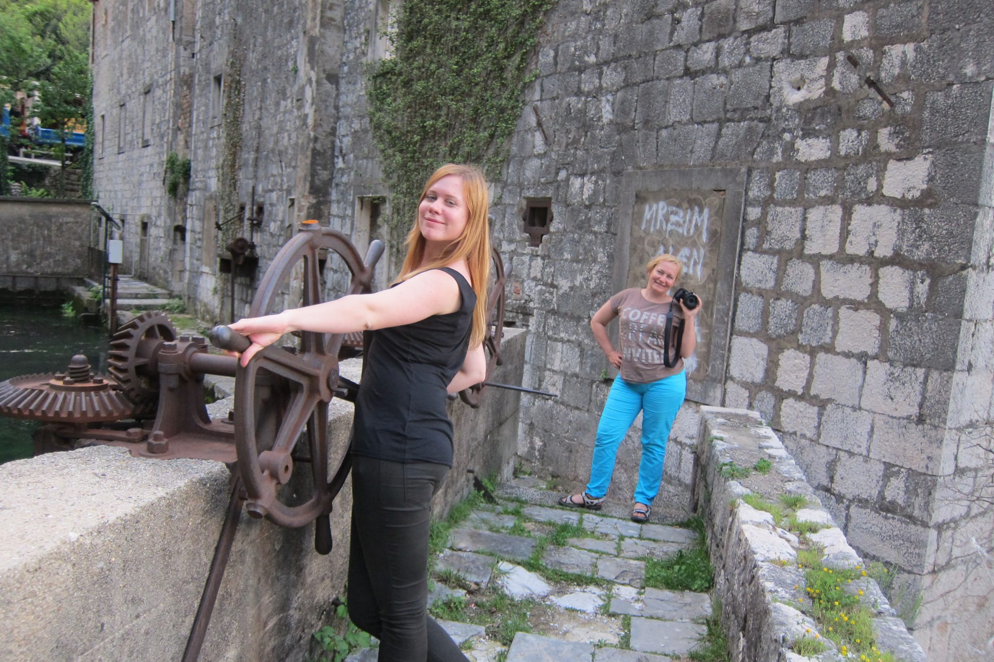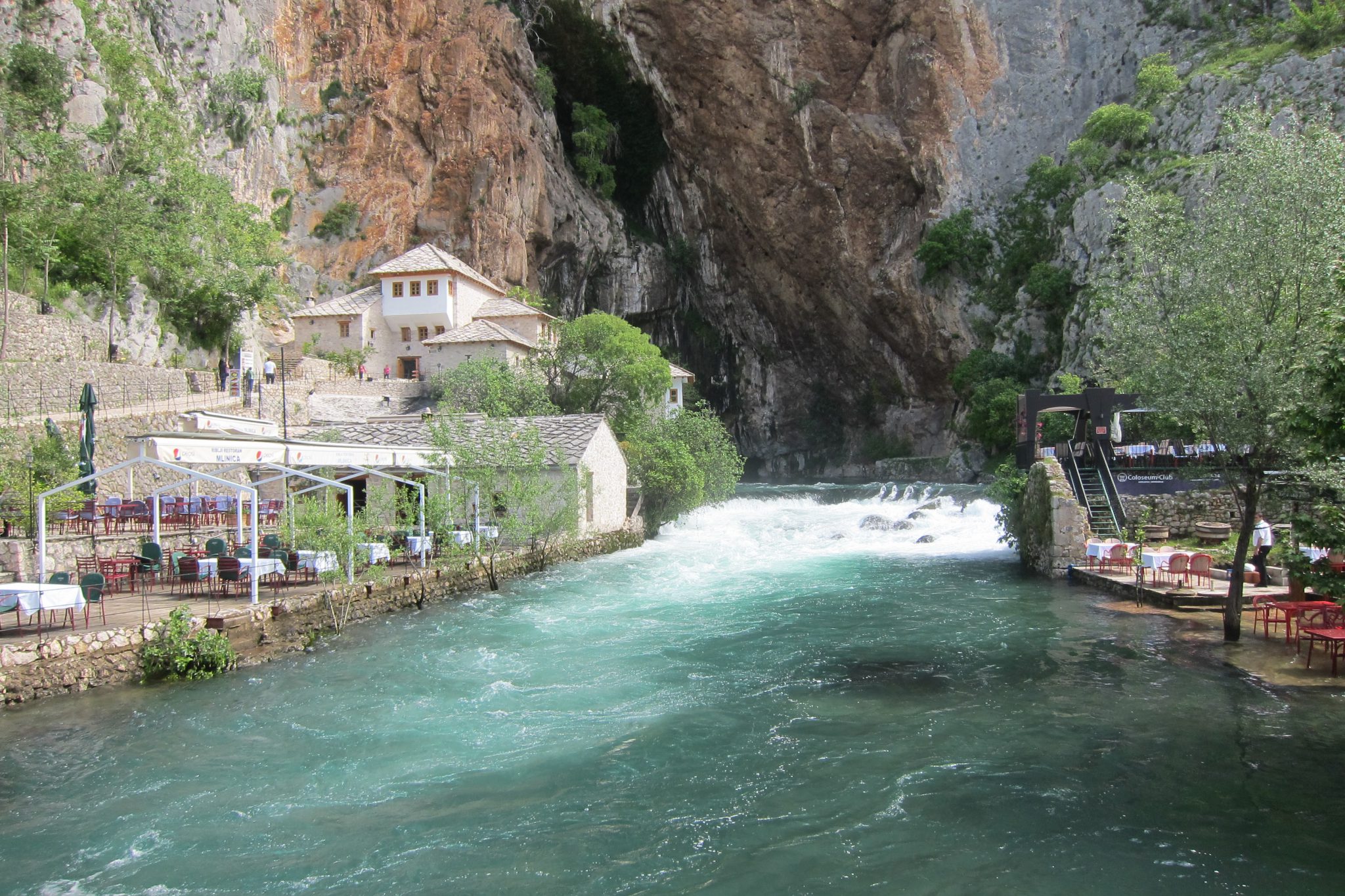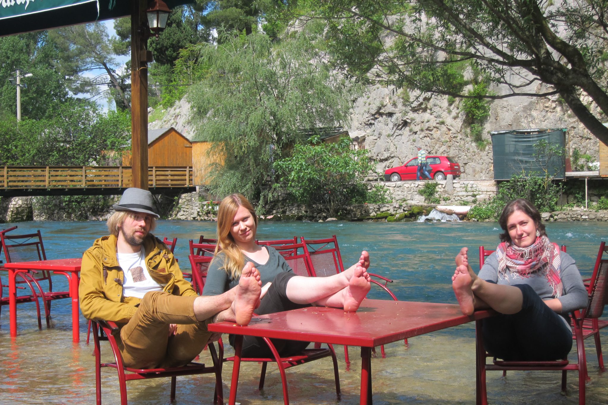 Šķērsojam straujo upi pa gājēju tiltiņu, un mūsu uzmanību piesaista kafejnīca, kurā daļa galdiņu un krēslu atrodas uz akmens paaugstinājuma tieši upē un sausām kājām pie tiem tikt nevar. Novelkam apavus, uzlokām bikses un rāpjamies upē. Ūdens ir ledaini auksts, bet karstā laikā šeit malkot alu varētu būt tīkami. Šoreiz gan īpaši nekavējamies – uztaisām vien nelielu fotosesiju.