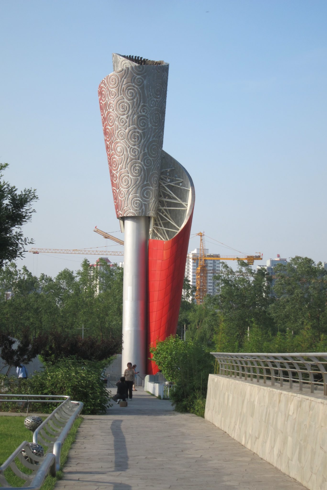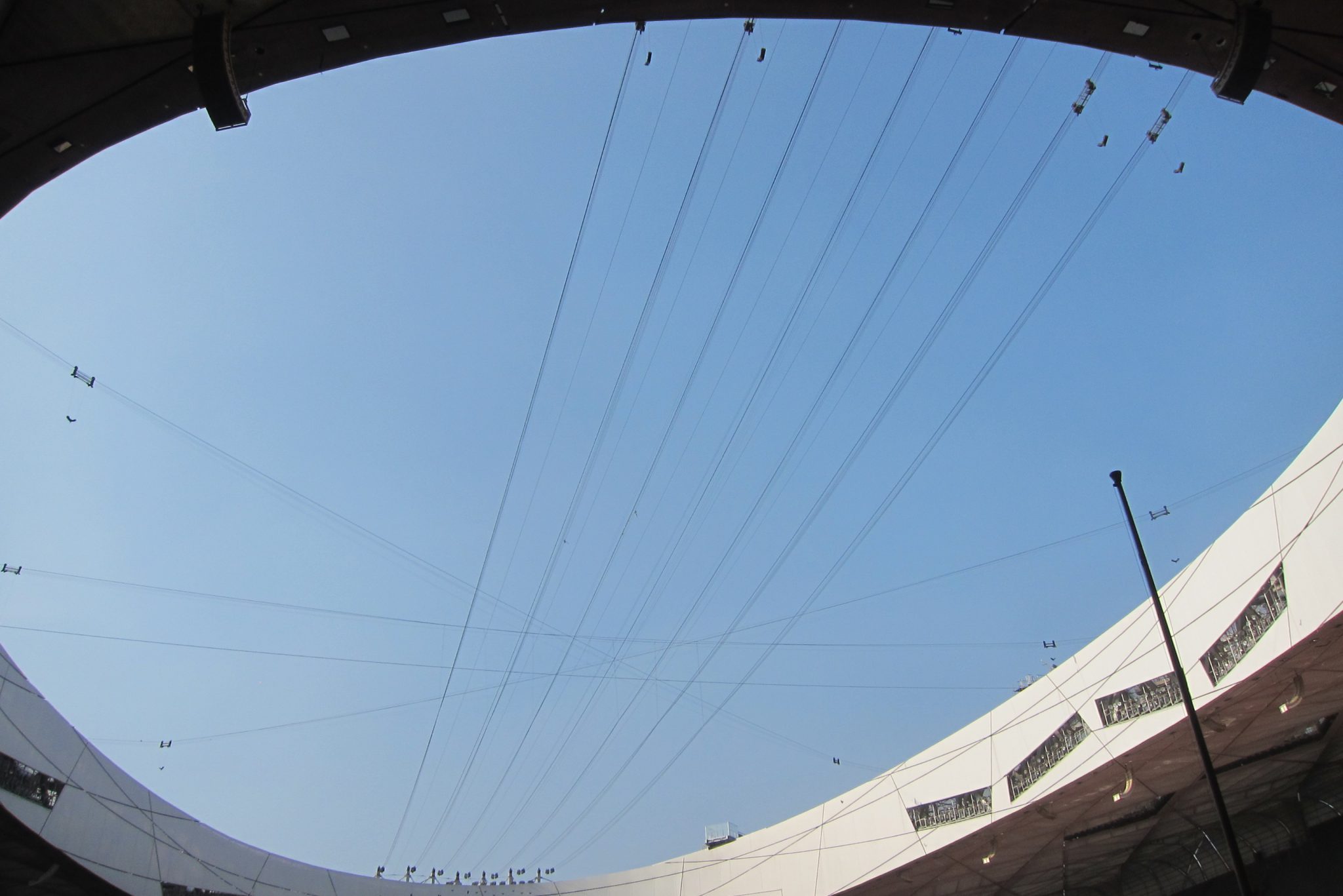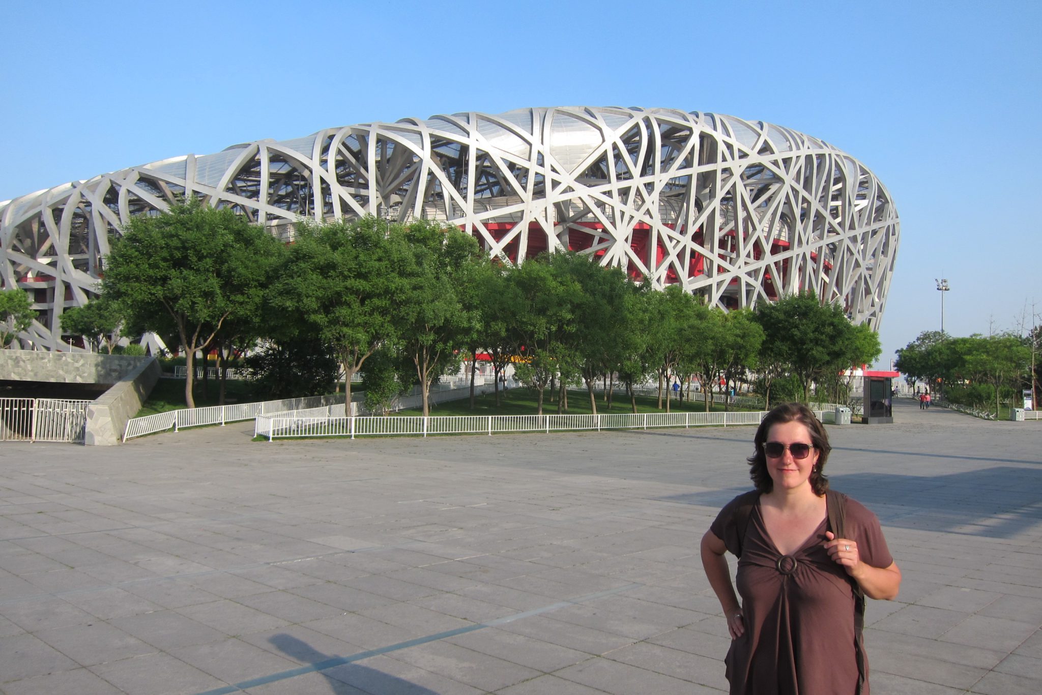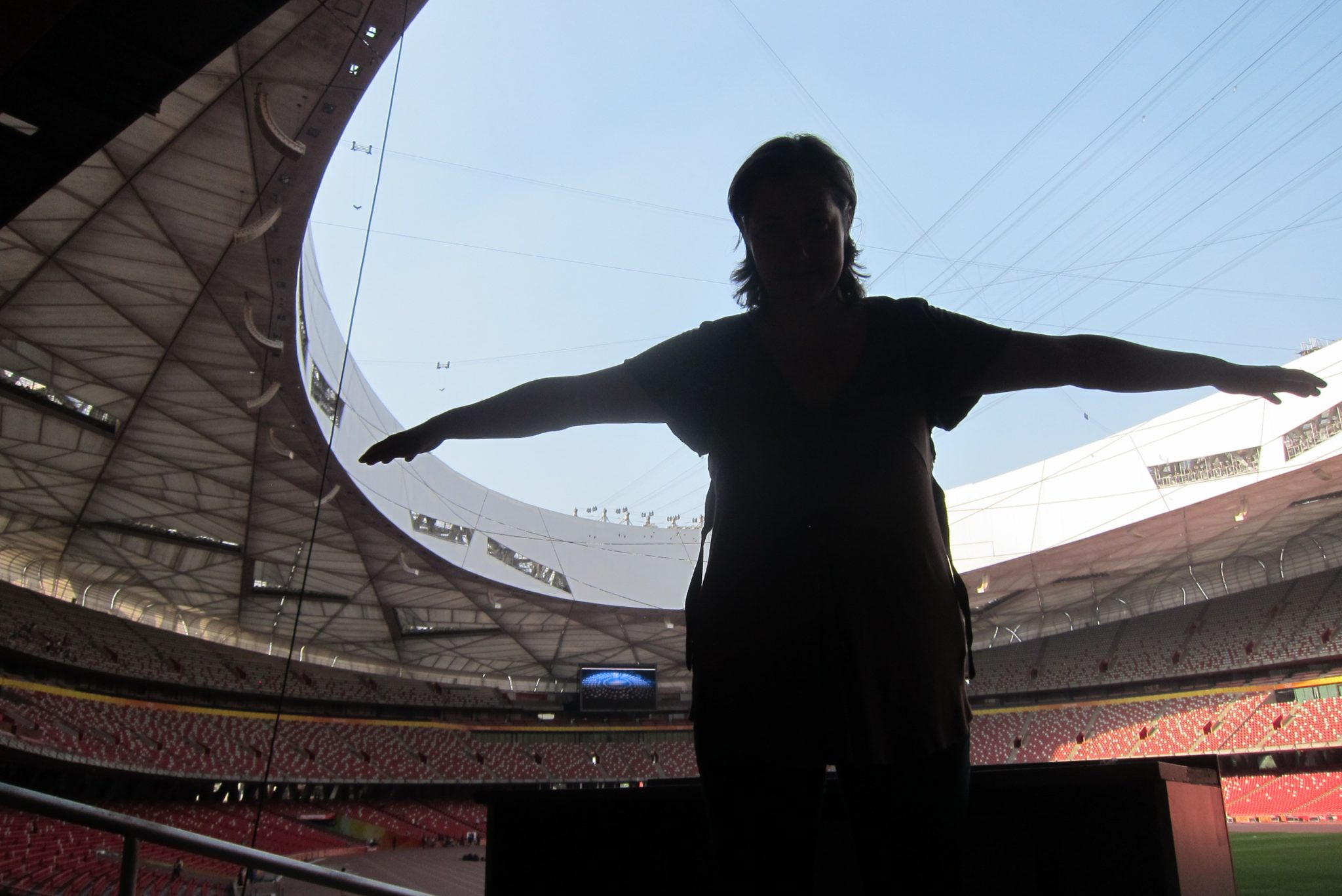 Paēduši gardas pusdienas, kas arī ietilpst tūres cenā, dodamies atpakaļceļā. Kad nonākam pilsētā, es kopā ar pāris kolumbiešu jauniešiem izlecu netālu no olimpiskā stadiona un dodos aplūkot putna ligzdu, kurā pirms sešiem gadiem norisinājās olimpiskās spēles. Arī šejienes biļešu tirdzniecības darbinieki faktiski nerunā angliski un iegādāties biļeti ir vesels piedzīvojums. Pati tūre notiek spiedzošas ķīnietes pavadījumā, kas arī nesaprot nevienu vārdu angliski. Toties mēs ar kolumbiešiem safočējamies ar stadionu priekšā un, atvainojiet, pakaļā.