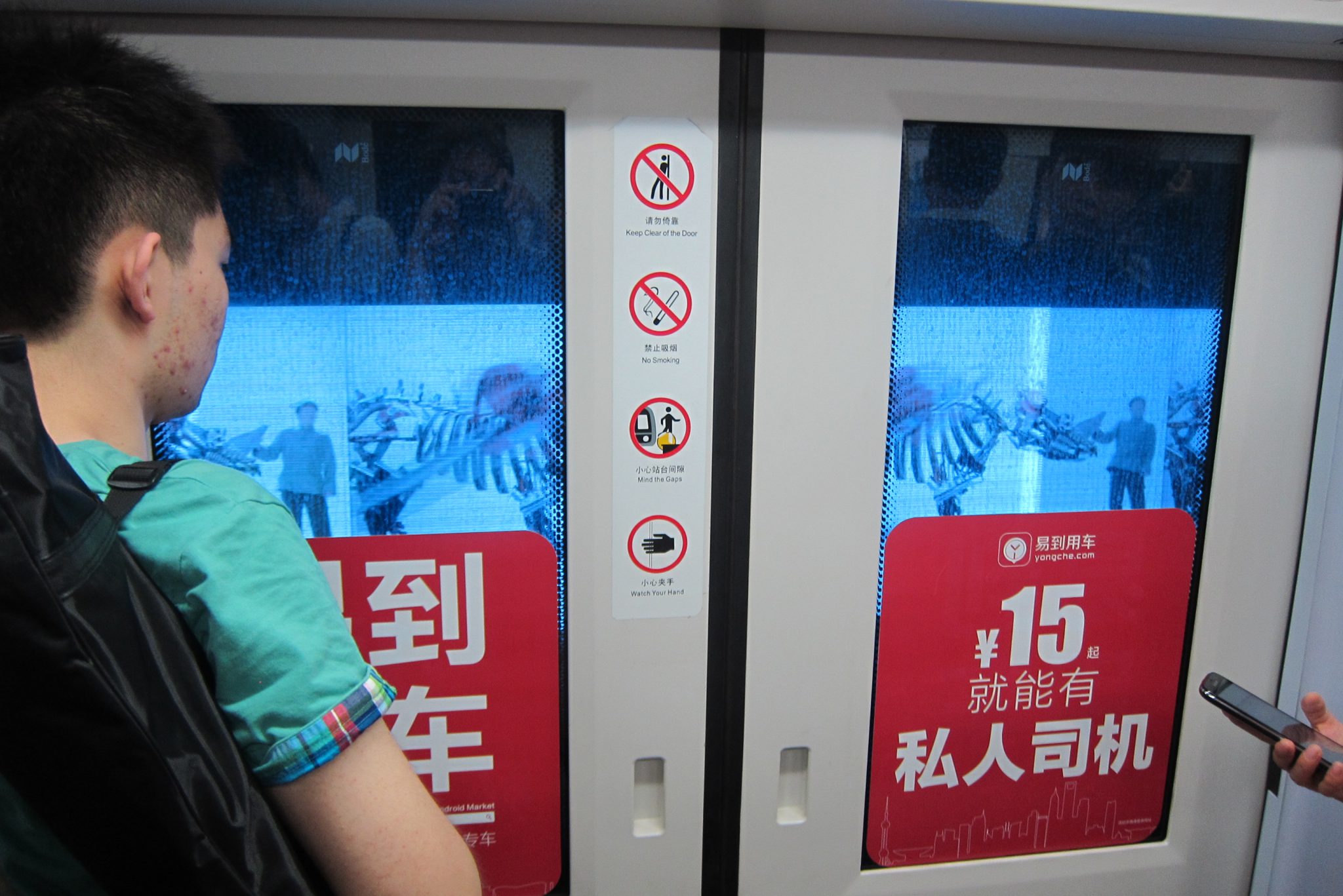 Arī metro Pekinā ir lielisks – viss norādīts arī angļu valodā. Savu staciju, trīs reizes pārsēžoties, atrodu bez liekām problēmām. Vienā no maršrutiem novēroju īpatnēju reklamēšanās veidu – video tiek rādīts uz sienas starp vagonu un tuneli – Džekijs Čans tur kaut ko cenšas pārdot kopā ar resnu degunradzi.