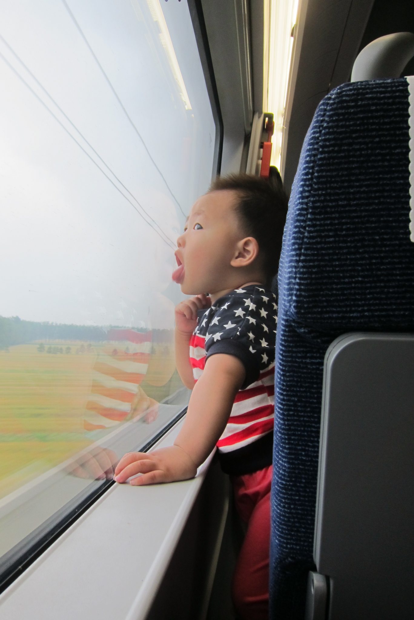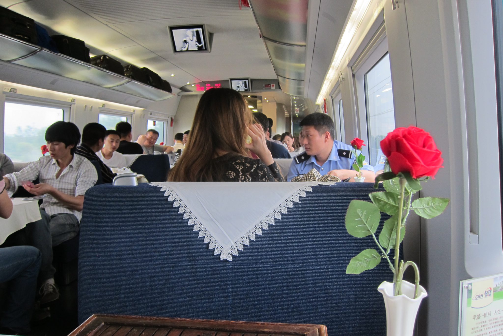 Vilciens ir ērts un ātrs – traucas ar ātrumu virs 300 km/h. Tā kā nepaspēju paēst brokastis, paviesojos restorāna vagonā un krietni ieturos. Tad dodos atpakaļ uz savu vietu un cenšos pagulēt – ja aiz manis sēdošās indiešu ģimenītes sievietes nesistu ar elkoņiem pa galvu (netīšām) un bērni nekliegtu (tīšām), varētu pat iemigt. Priekšējā beņķī sēž ķīniešu mazulis, kas visu laiku kāpelē pa krēsliem un koķetē ar mani. Kad viņš nedara to, tad aizrautīgi laiza loga stiklu. Dzimumu man tā arī neizdevās noteikt – pēc sejas izskatījās pēc puisieša, bet spriežot pēc rozā zeķbiksēm ar zaķīšiem, tai tomēr teorētiski vajadzētu būt meitenei.
