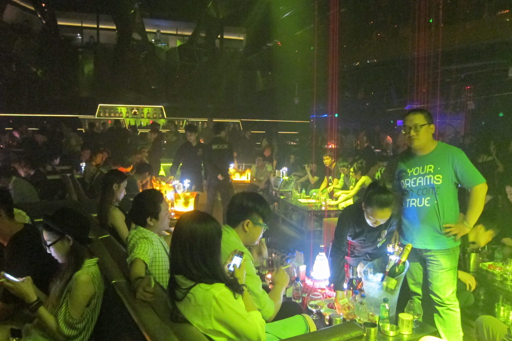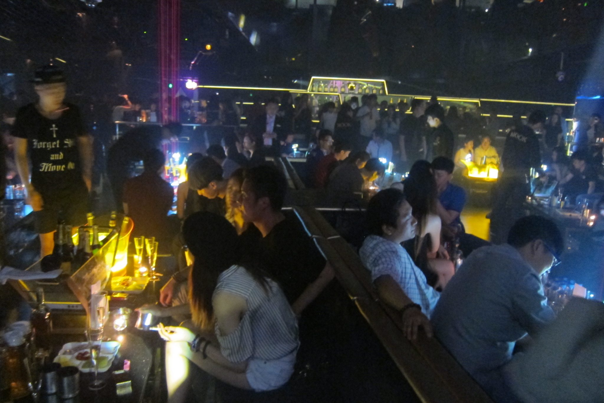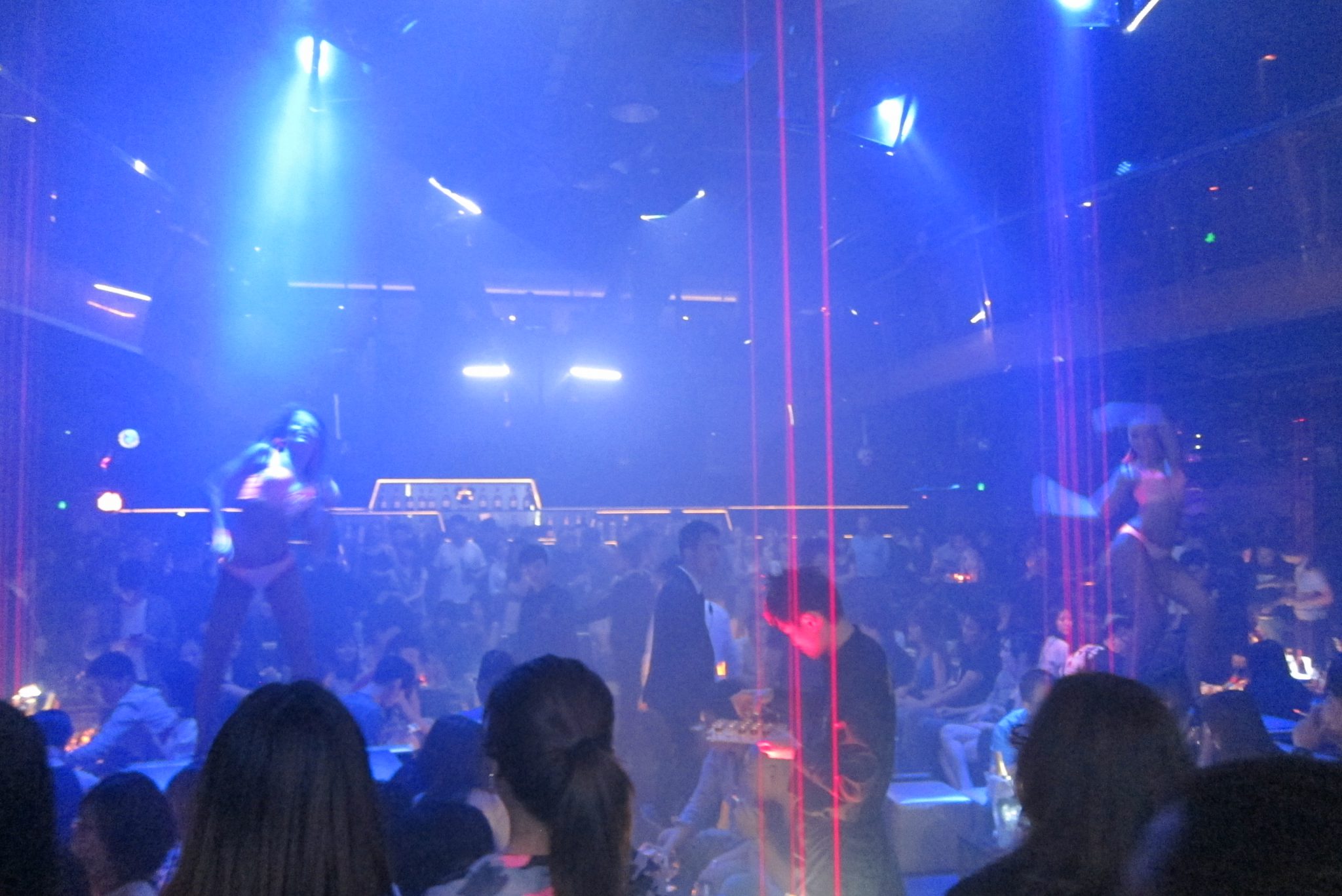 Meitene vervē ļautiņus uz dažādiem klubiem, šonakt ir kārta ķīniešu klubam. Milzīgā zālē dārd deju mūzika, vairums ļautiņu sēž pie galdiņiem – uz tiem ir uzkodas un vannas ar smalkiem šampaniešiem ledū vai konjakiem, kas tiek izgaismoti ar lāzera stariem no griestiem. Izskatās kā filmās. Šķiet, ka tūlīt kāds nobērs uz spīdīgajām virsmām baltus kokaīna ceļus un sašņauksies uz nebēdu. To nu es neredzu, bet pīpē gan visi un visur. Uz skatuves, kurai blakus esmu piemetusies, ik pa laikam tiek demonstrēts šovs – baltas un melnas viegli ģērbtas meitenes lokās deju soļos, puiši ar. Otrajā priekšnesumā puisis ģērbies baltās ādas biksēs, mirdzošās botās un auro popsu pilnā sparā. Izskatās, ka ļautiņiem patīk. Lai arī man ir aizdoma par fotografēšanas aizliegumu, nevaru atturēties fiksēt šeit notiekošo jautrību. Pēc otrā aizrādījuma no kluba apsargiem tomēr pārtraucu – negribas pārāk uzprasīties. Pēc priekšnesuma, izstāvējusi rindu uz labierīcībām, konstatēju, ka kopā ar mani to gaidījis arī mazs prusaciņš, ērti iekārtojies uz manas kājas. Izrīkojos ar šo visai brutāli. Tad nolemju, ka eksotika ir gana baudīta un laiks doties atceļā. Zinot, cik maksā taksis, neiespringstu – parādu šim hosteļa istabas durvju karti, uz kuras ir arī adrese ķīniešu valodā, un izbaudu naksnīgo braucienu mājup.