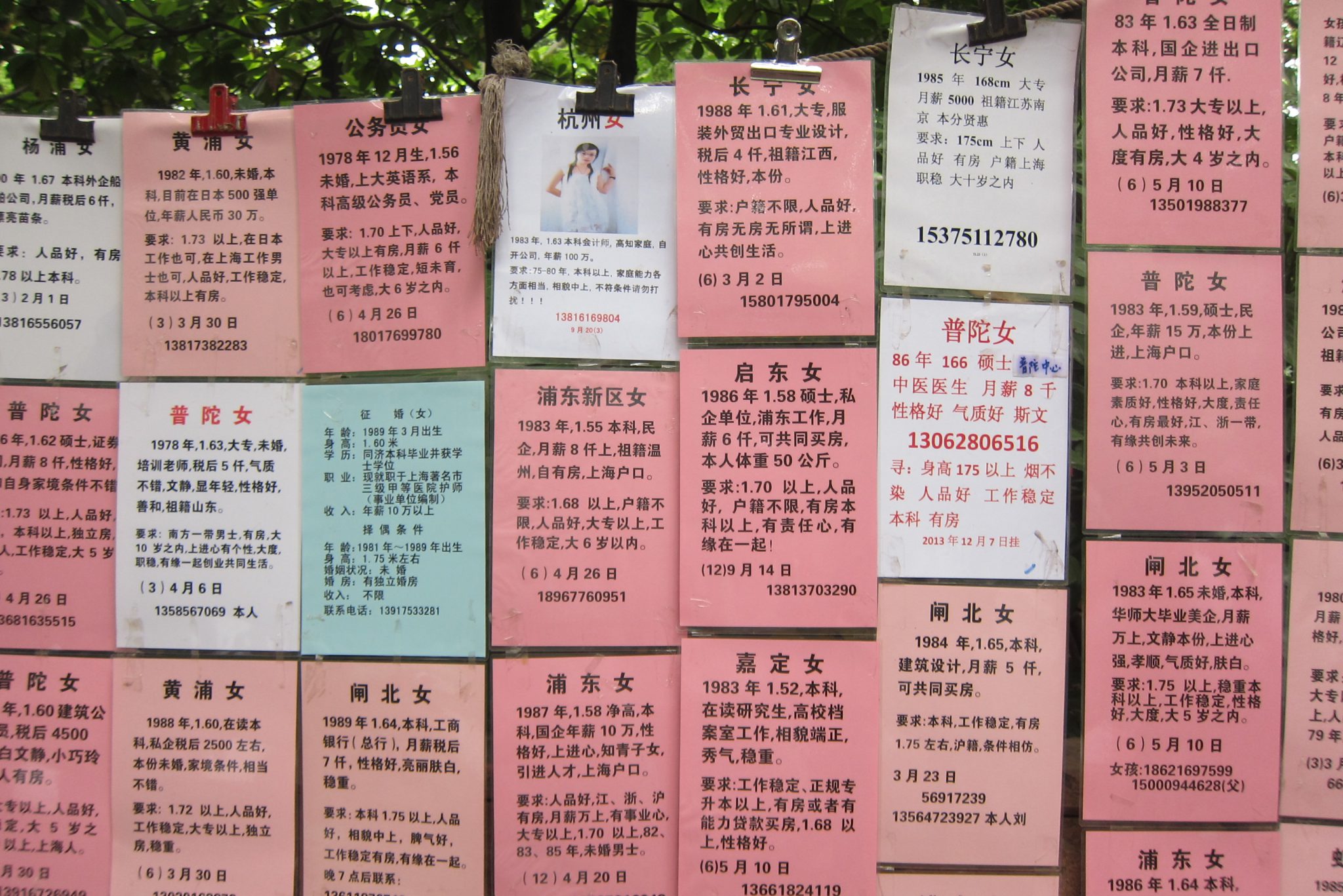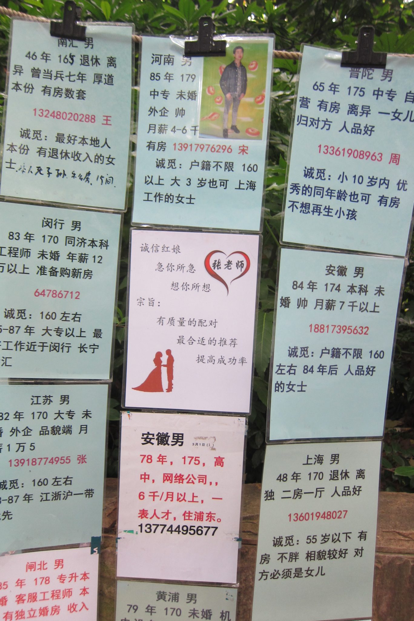 Rītu pavadu hostelī – atvelkot elpu un rakstot. Tad dodos tālākā Šanhajas izpētē – sāku ar iemīļotu nodarbi – klīšanu pa ielām uz labu laimi. Pieredze rāda, ka šādi var atrast daudzas interesantas vietas un lietas. Var arī neatrast. Šoreiz manu uzmanību piesaista cilvēku drūzmēšanās parkā – nez kas tur notiek. Arī piegājusi tuvāk, netieku gudra. Izskatās pēc sludinājumu gadatirgus. Cilvēki piesprauduši lapiņas ar tekstu uz zemē stāvošiem atvāztiem lietussargiem, citiem ir lielāki plakāti. Mana pirmā doma ir, ka šeit tiek sludināti mājokļi, bet tad pamanu, ka pie atsevišķiem sludinājumiem redzamie cipari atbilst cilvēku parametriem – augums, vecums, uz dažām lapiņām piespraustas arī bildes. Sāk izskatīties pēc offline iepazīšanās portāla. Ieraudzījusi vēl pāris ārzemniekus, pieeju pie viņiem un prasu, kas šeit notiek. Viņi apstiprina manas aizdomas – šis ir “marriage market” – precību tirgus. Vecāki un vecvecāki šeit meklē otru pusīti savām atvasēm. Prasu, vai pašas atvases zina, ka atrodas uz sludinājumu dēļa – daļa zinot, daļa nē. Atsevišķās vietās var vērsties pie savedējiem, kas ar šo rūpalu nodarbojas profesionālā līmenī. Staigājot pa ielām, man gan nav radusies sajūta, ka jauniešiem šeit būtu problēmas pašiem iepazīties. Pārīši, tai skaitā ļoti jauni, šeit uz ielām redzami biežāk kā Eiropā.
