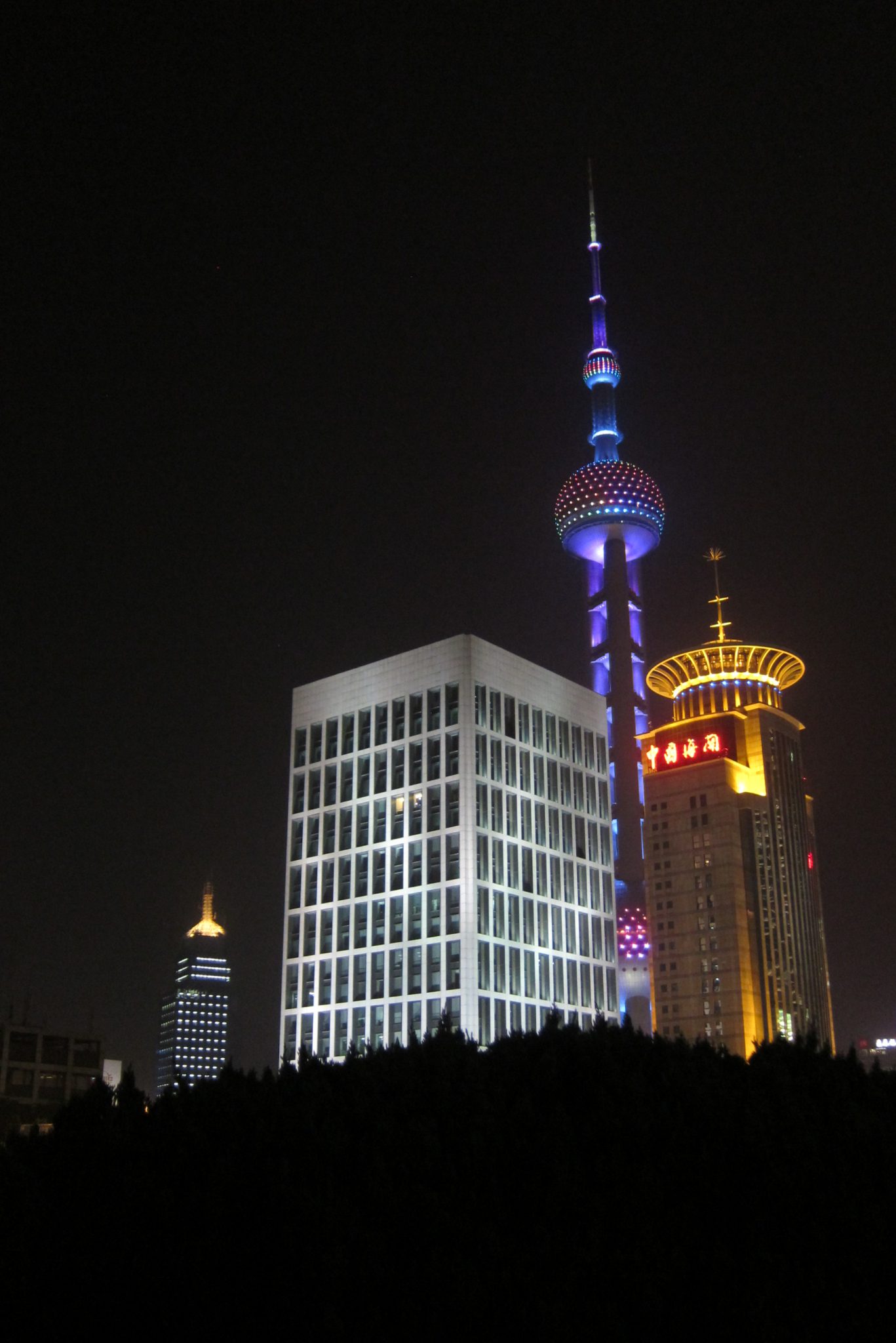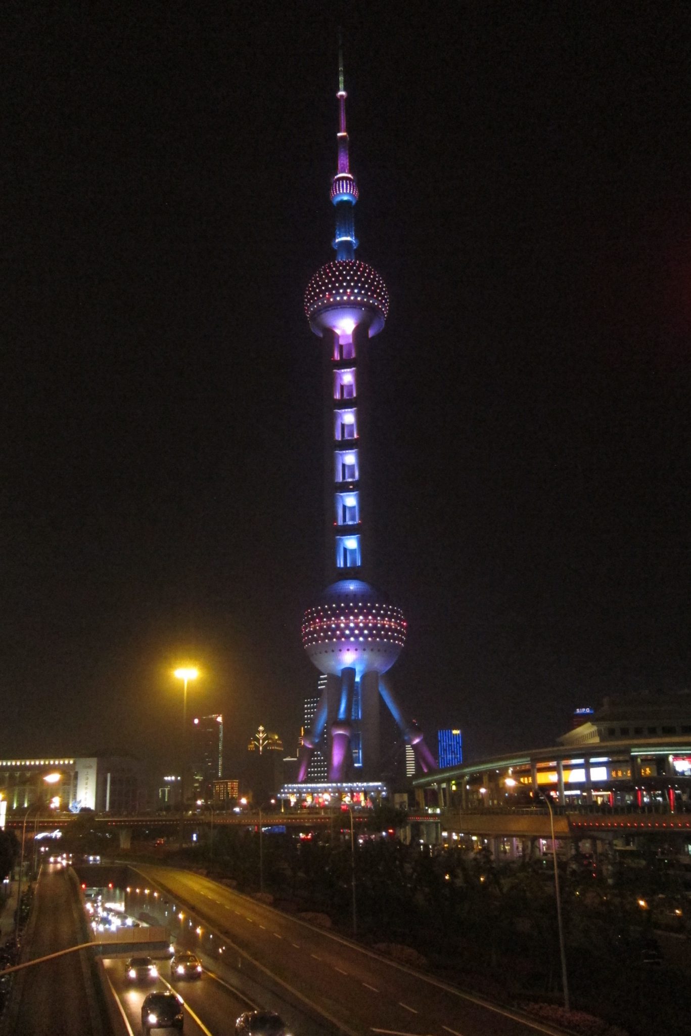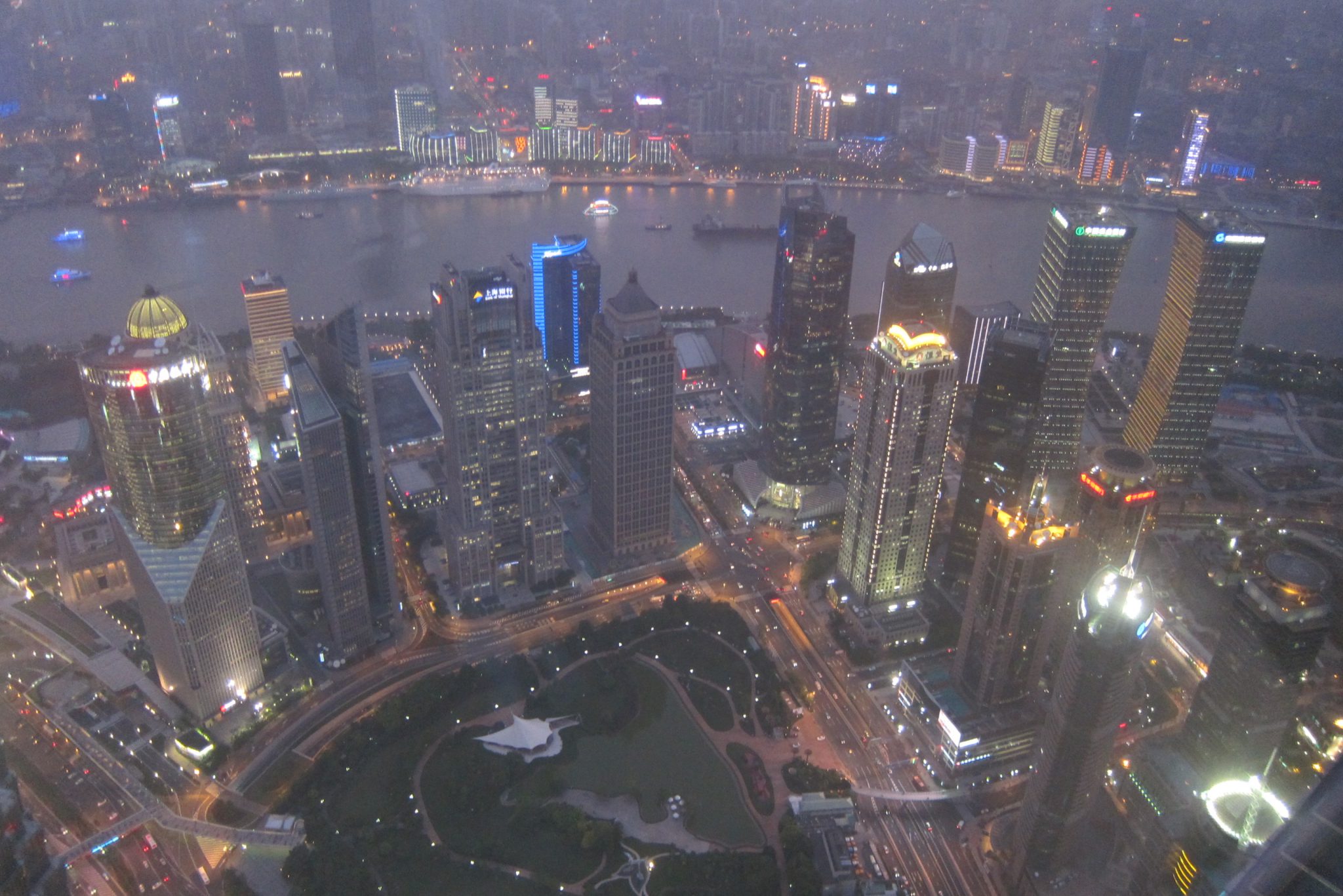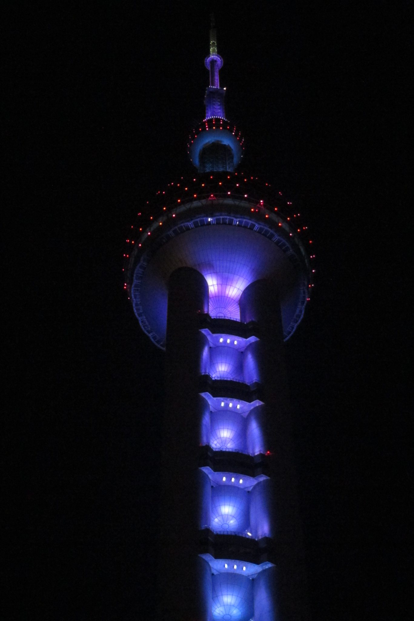 Lēnām parādās krēsla un līdz ar to arī ugunis. Tagad pilsēta izskatās jau šarmantāk – slavenais TV tornis “Austrumu pērle” zibina visdažādāko krāsu lampiņas, arī citas jaunās un vecās ēku madāmas izgreznojušās kā nu mācēdamas. Cenšamies šo krāšņumu iemūžināt, bet diez ko labi nesanāk – īpaši traucē viena debesskrāpja pārlieku spilgti izgaismotā smaile. Gana saskatījušies pilsētu no augšas, laižamies lejā.