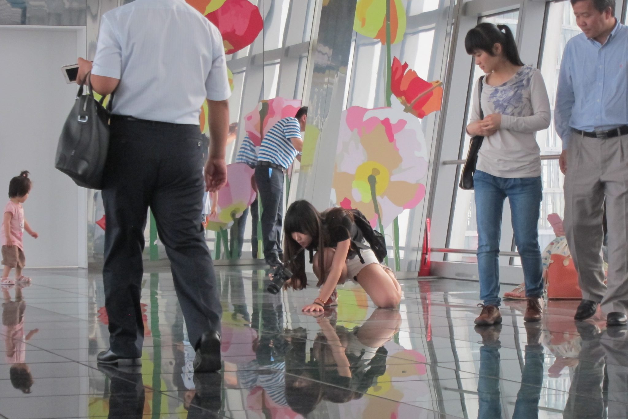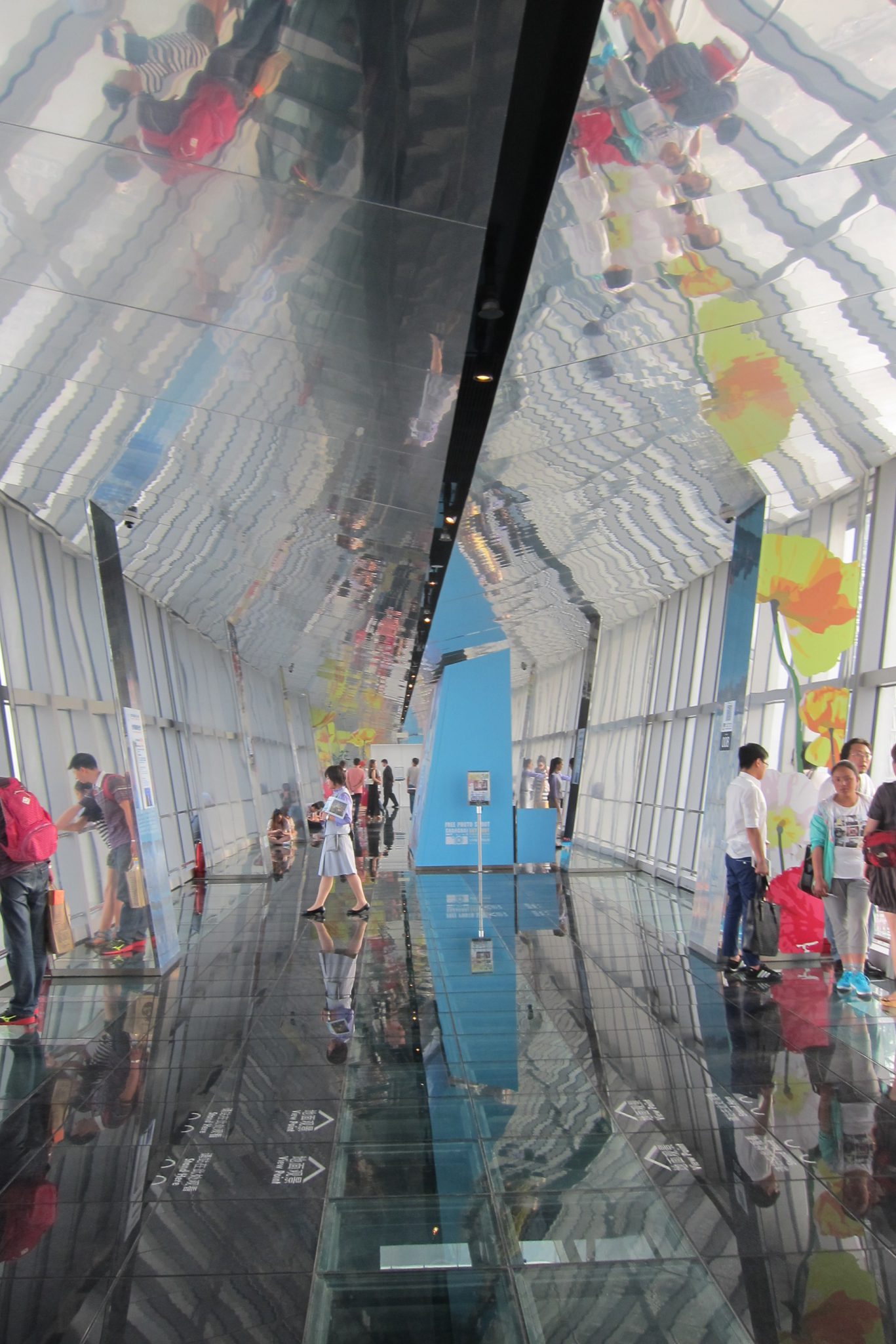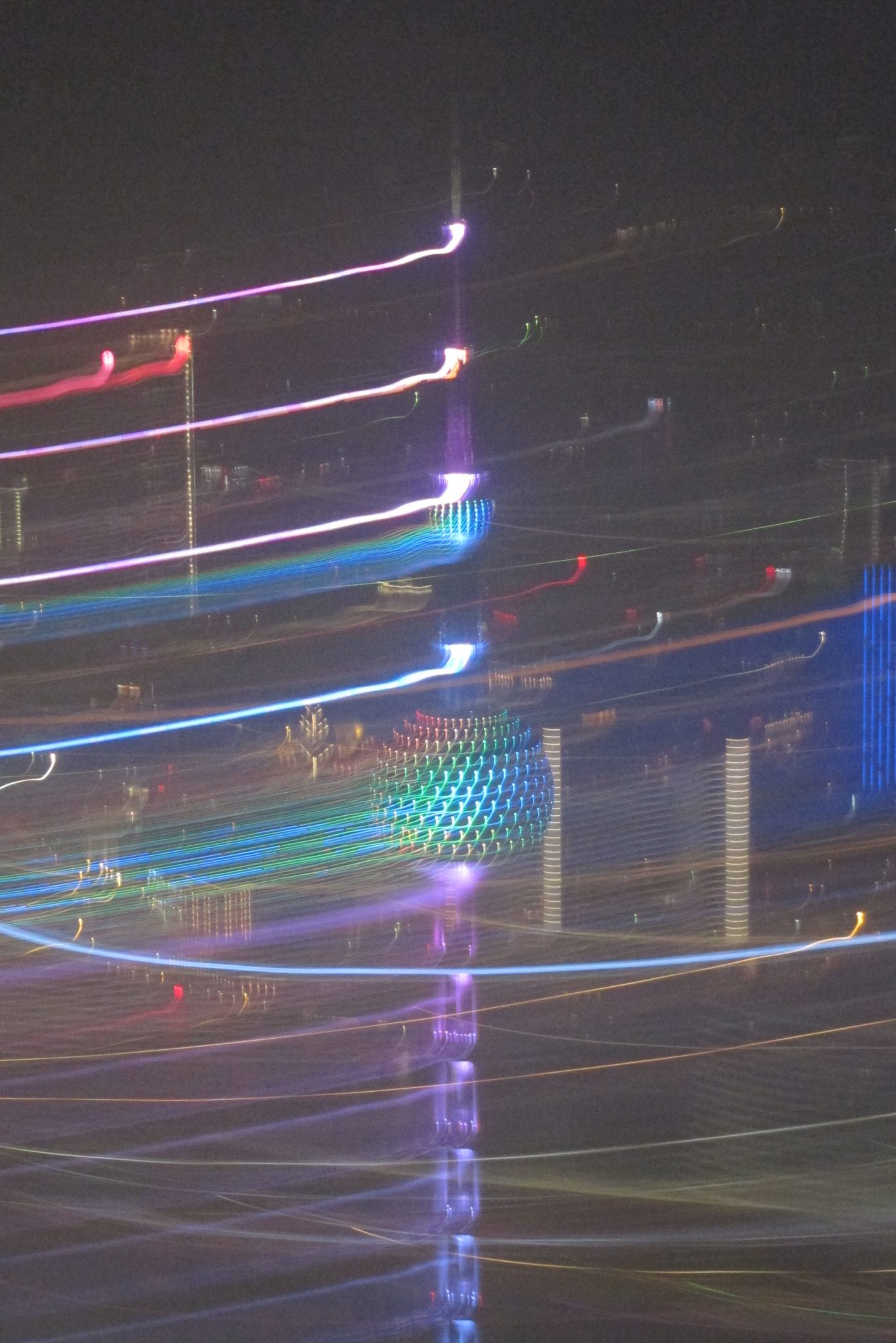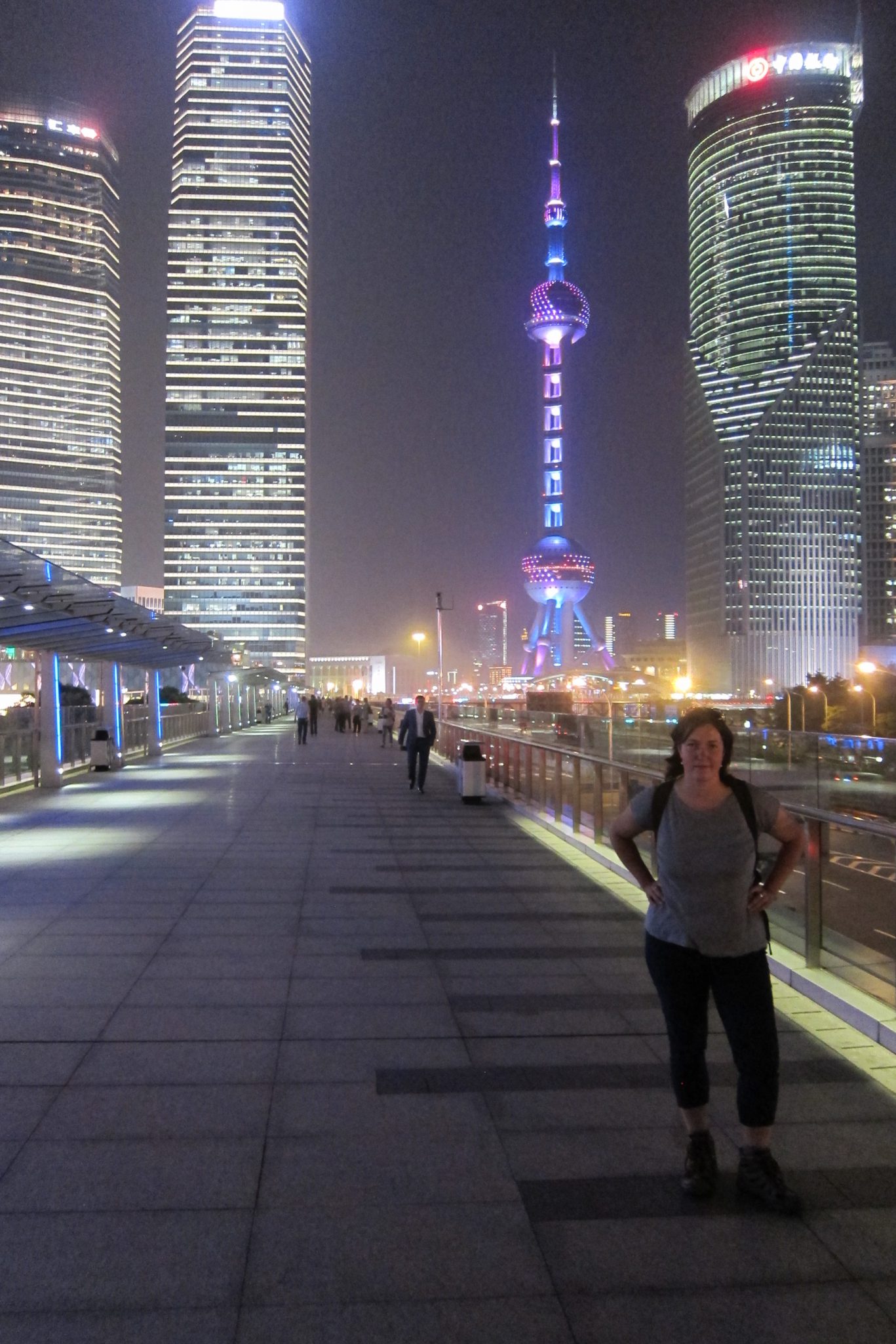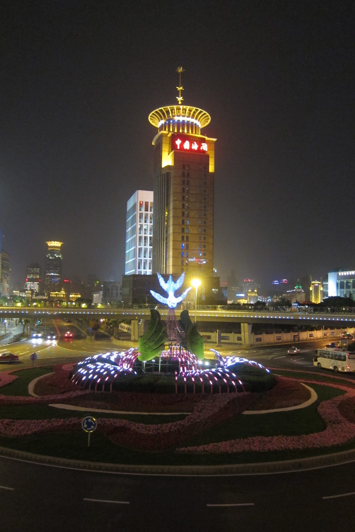 Lēnām parādās krēsla un līdz ar to arī ugunis. Tagad pilsēta izskatās jau šarmantāk – slavenais TV tornis “Austrumu pērle” zibina visdažādāko krāsu lampiņas, arī citas jaunās un vecās ēku madāmas izgreznojušās kā nu mācēdamas. Cenšamies šo krāšņumu iemūžināt, bet diez ko labi nesanāk – īpaši traucē viena debesskrāpja pārlieku spilgti izgaismotā smaile. Gana saskatījušies pilsētu no augšas, laižamies lejā.