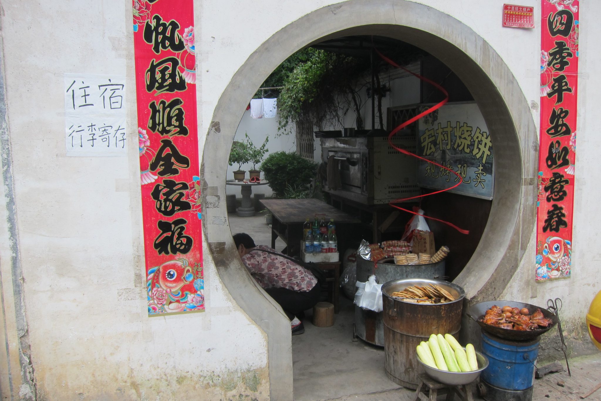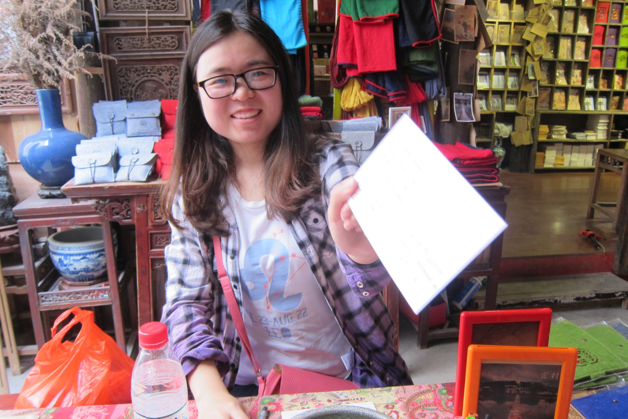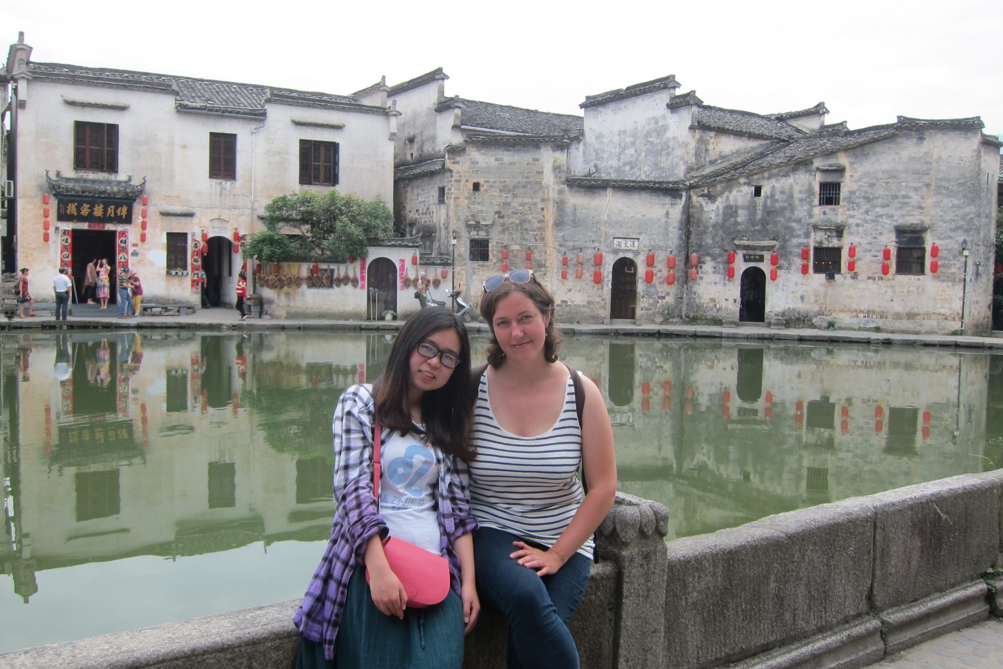 Izkāpjot no busa, sāku komunicēt ar meiteni, kas man paskaidroja par šejienes vēsturiskajām vērtībām. Rezultātā ejam tās iepazīt kopā. Mija ir nesen juristus beigusi jauniete no Šanhajas, kas šeit atbraukusi brīvdienās. Viņa salīdzinoši labi runā angliski un ir man lielisks palīgs, kad gribu ko nopirkt vai paprasīt. Arī par atpakaļceļa autobusa atrašanu man tagad galva nesāp. Apskatām senās ēkas, templi, nopērkam pāris klozītes un pat nosūtām pastkartes (ak, šis lipīgais balkāniešu paradums). Cilvēks, kuram to sūtu, nekad neuzminēs, no kā tā ir :).