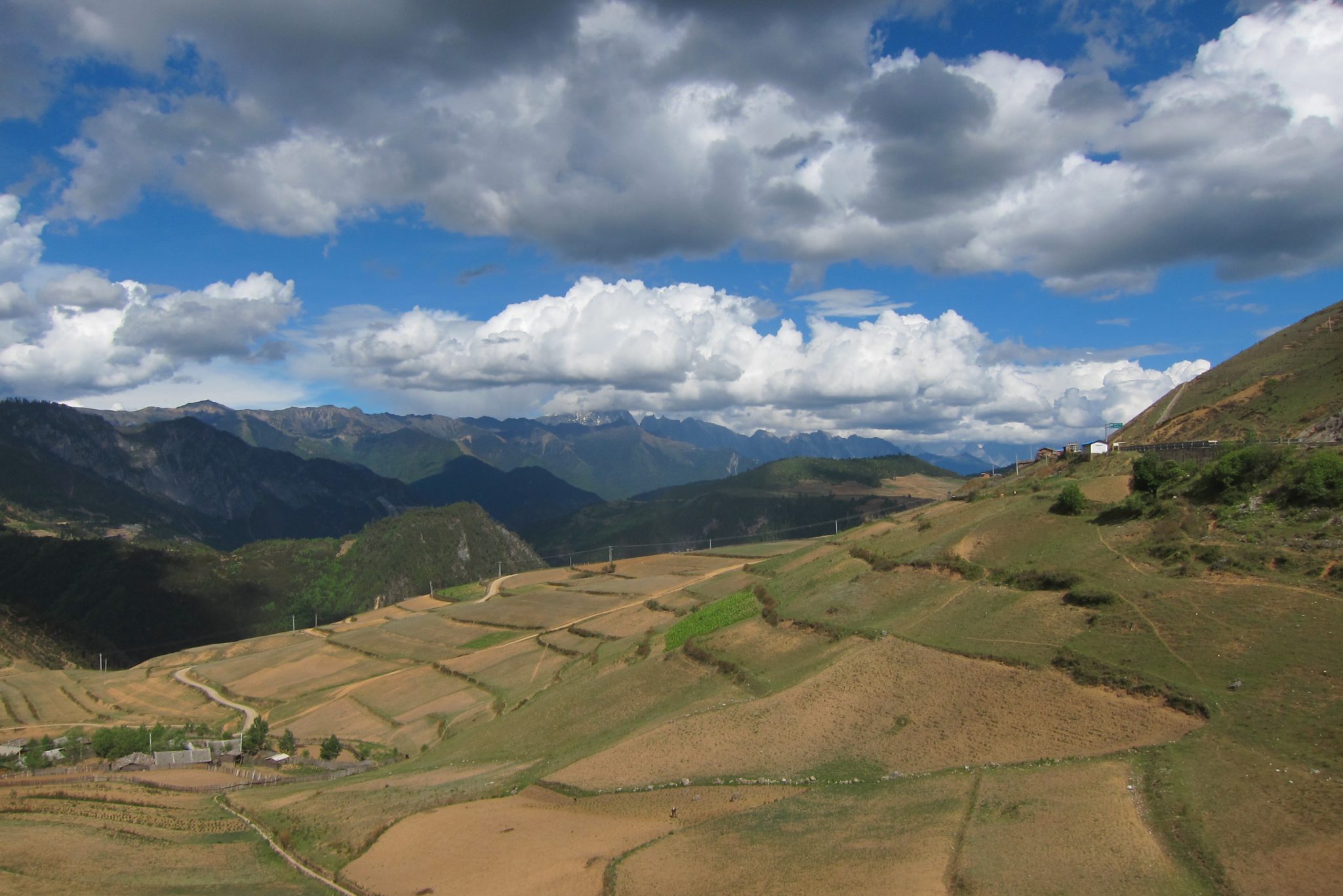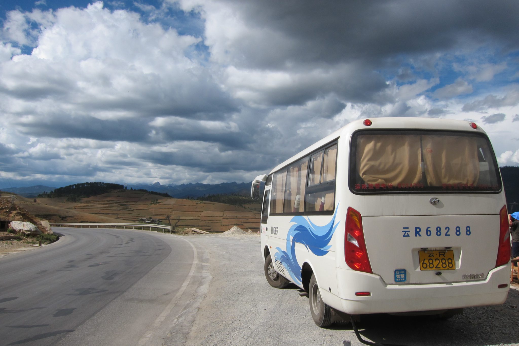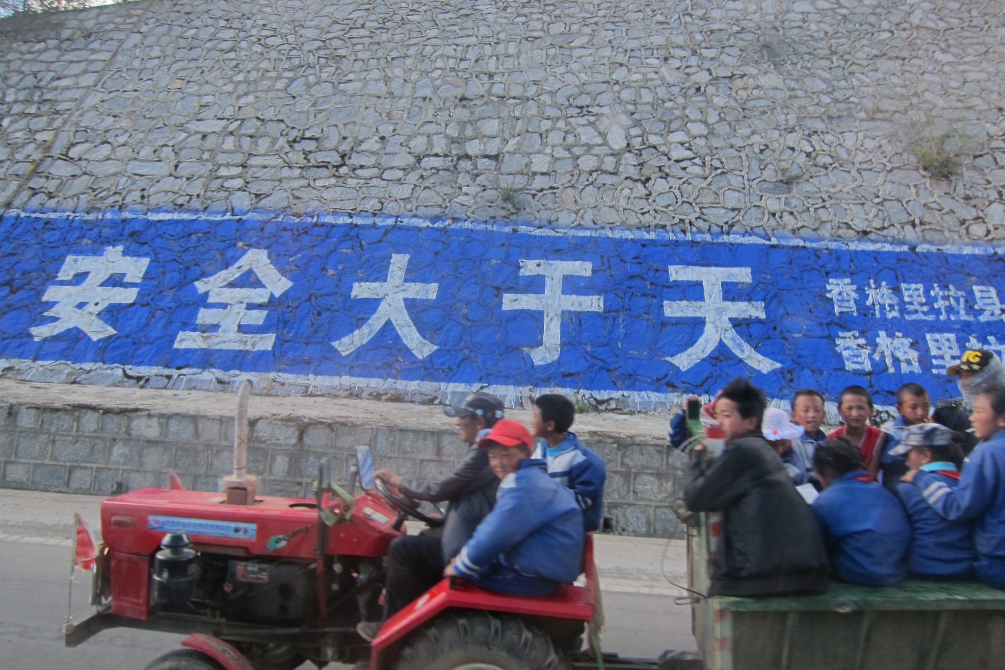 Pusčetros atvadāmies no zviedriem – viņi dodas vienā virzienā, bet mēs ar Čongu kāpjam autobusā uz Šangrilai. Biju cerējusi autobusā parakstīt vai pagulēt, bet pie stūres sēž tāds džigits, ka nav iespējams padarīt ne vienu, ne otru. Tomēr tas nemaz nav slikti – apkārtne ir vērošanas vērta. Krāšņa upe, nelieli ciemati un, protams, kalni. Šangrilai apkaime atrodas pie pašas Tibetas robežas un runā, ka šeit pat esot autentiskāk kā Tibetā. Jo – pirmkārt, Tibeta pēdējos gados tapusi pārāk tūristu pilna, otrkārt, šai provincei esot mazāka kontrole.