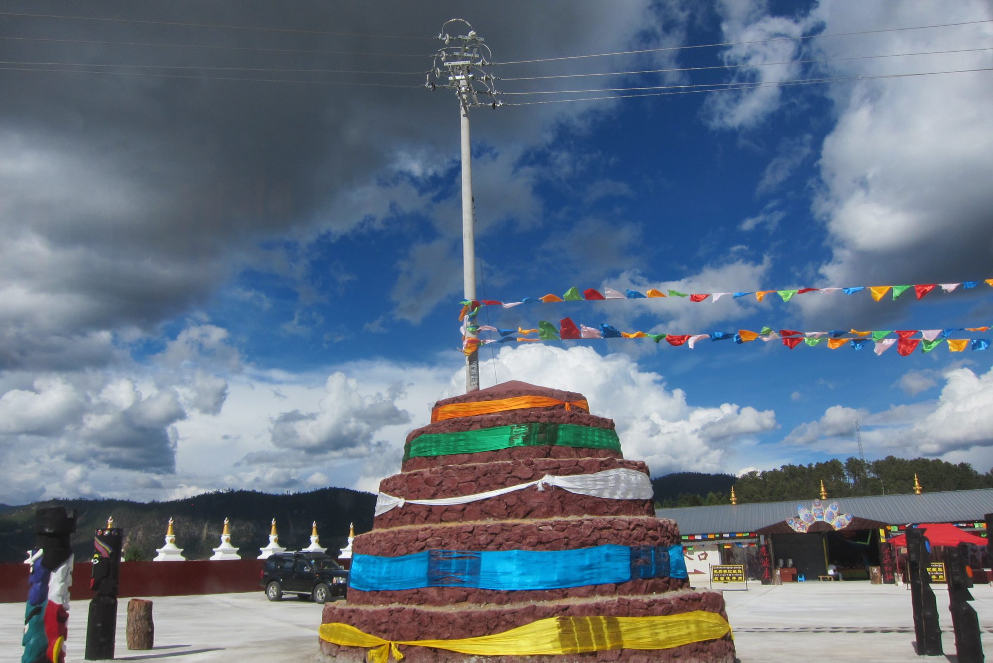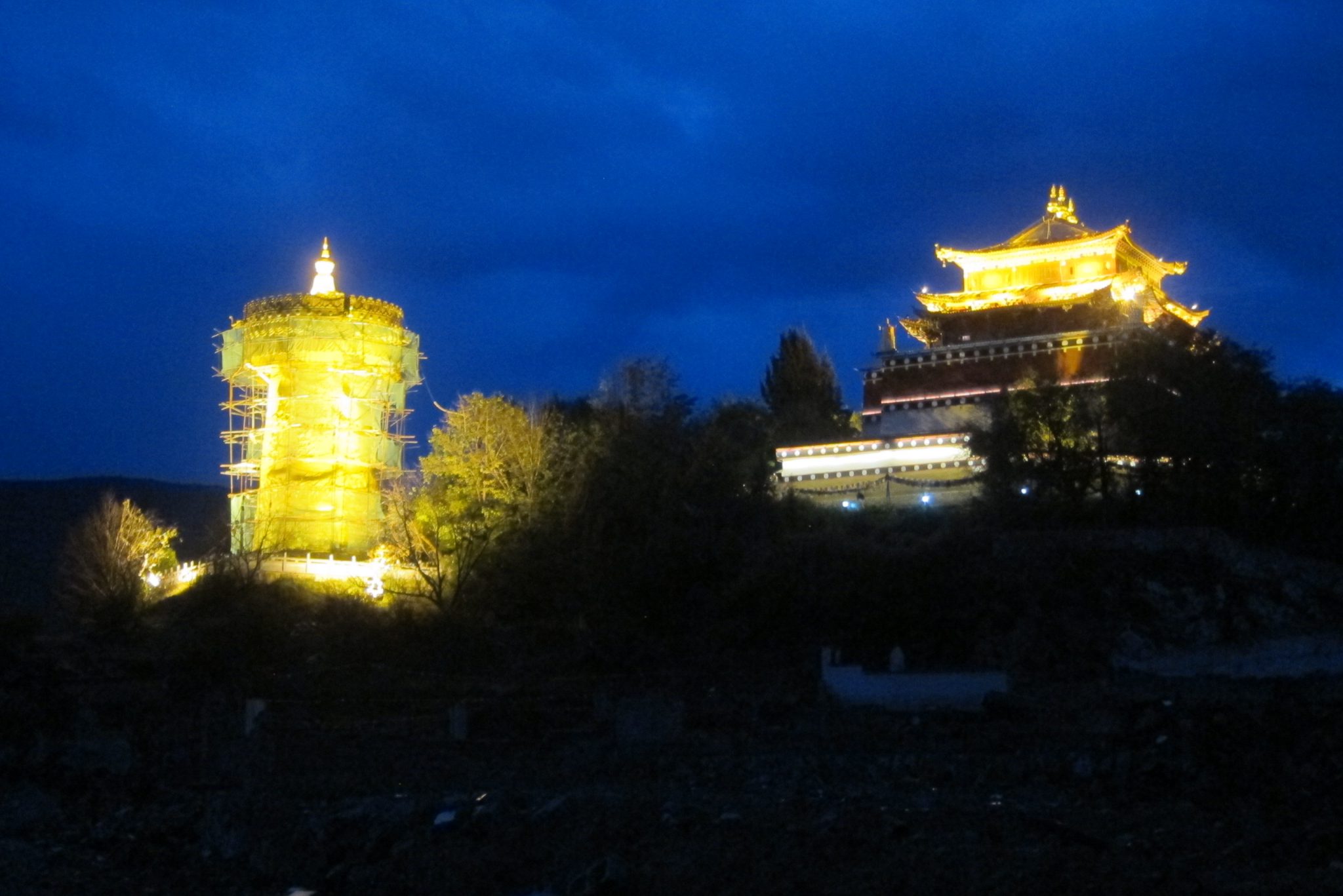 Kad iebraucam Šangrilai, gāž kā ar spaiņiem. Drīz vien pārliecinos, ka mans jaunais lietusmētelis ir tikai nosaukuma pēc tāds – esmu slapja pēc dažām minūtēm, kamēr noķeram taksi līdz hostelim. Šoreiz neesam neko rezervējuši, bet Ķīnā tā ir normāla prakse. Mūsu hostelis atrodas vecpilsētā, kādreizējā centra vidū, bet tagad drupu kaudzes malā – būtisku vecpilsētas daļu janvārī nopostījis ugunsgrēks. Pasūtām katrs gultasvietu kopējā telpā un pārsteigti tiekam pie istabiņas ar trim gultām – šitādas kopmītnes mums patīk. Iekārtojušies, dodamies meklēt bankomātu. Man nauda pietiek maksimums vienai dienai, tāpēc esmu diezgan norūpējusies – vai šai pilsētā ir bankomāti un ja ir – vai manas bankas kartes stādās. Pa ceļam satieku zilacaino blondīnu un pateicos viņam par labo padomu pie upes – Čongs tikai aizdomīgi noskatās – tu atkal kādu pazīsti?