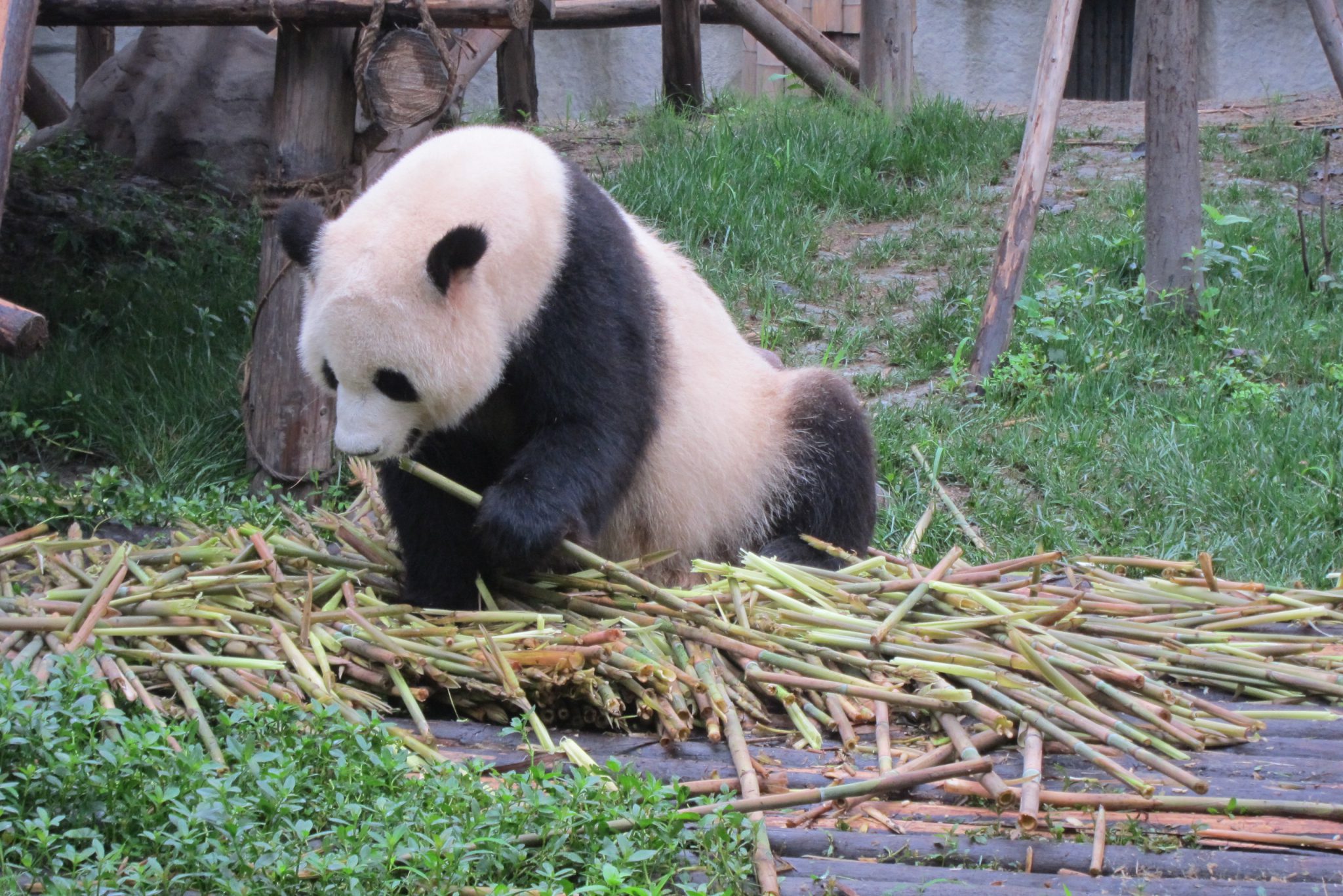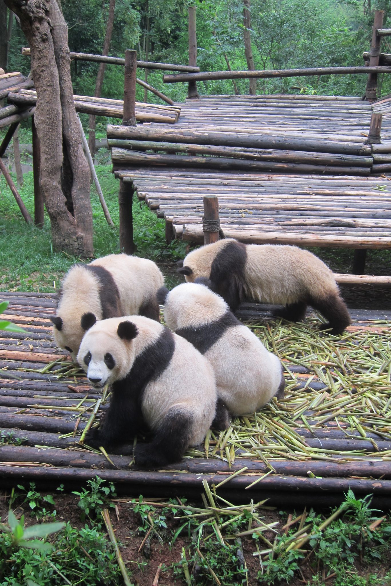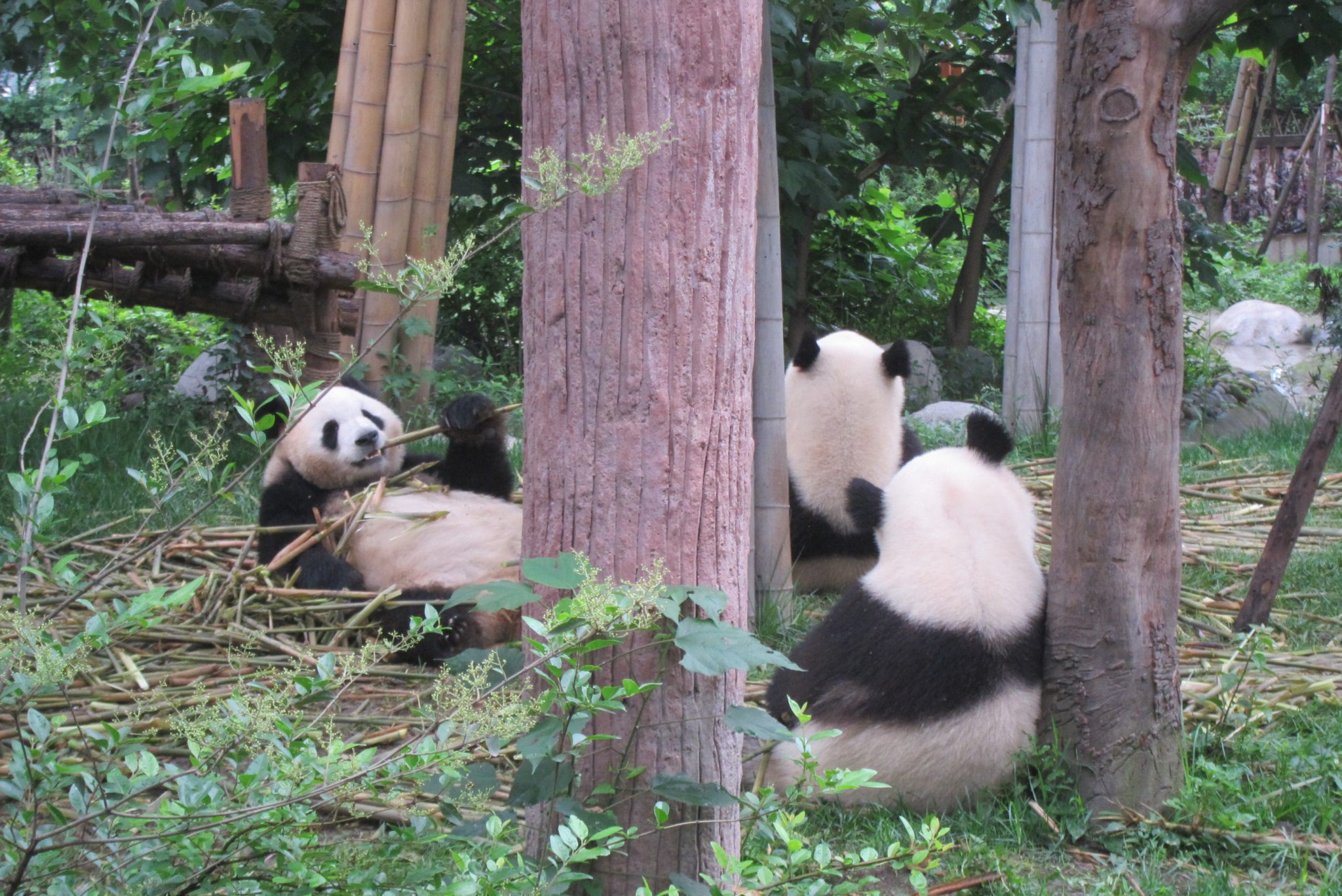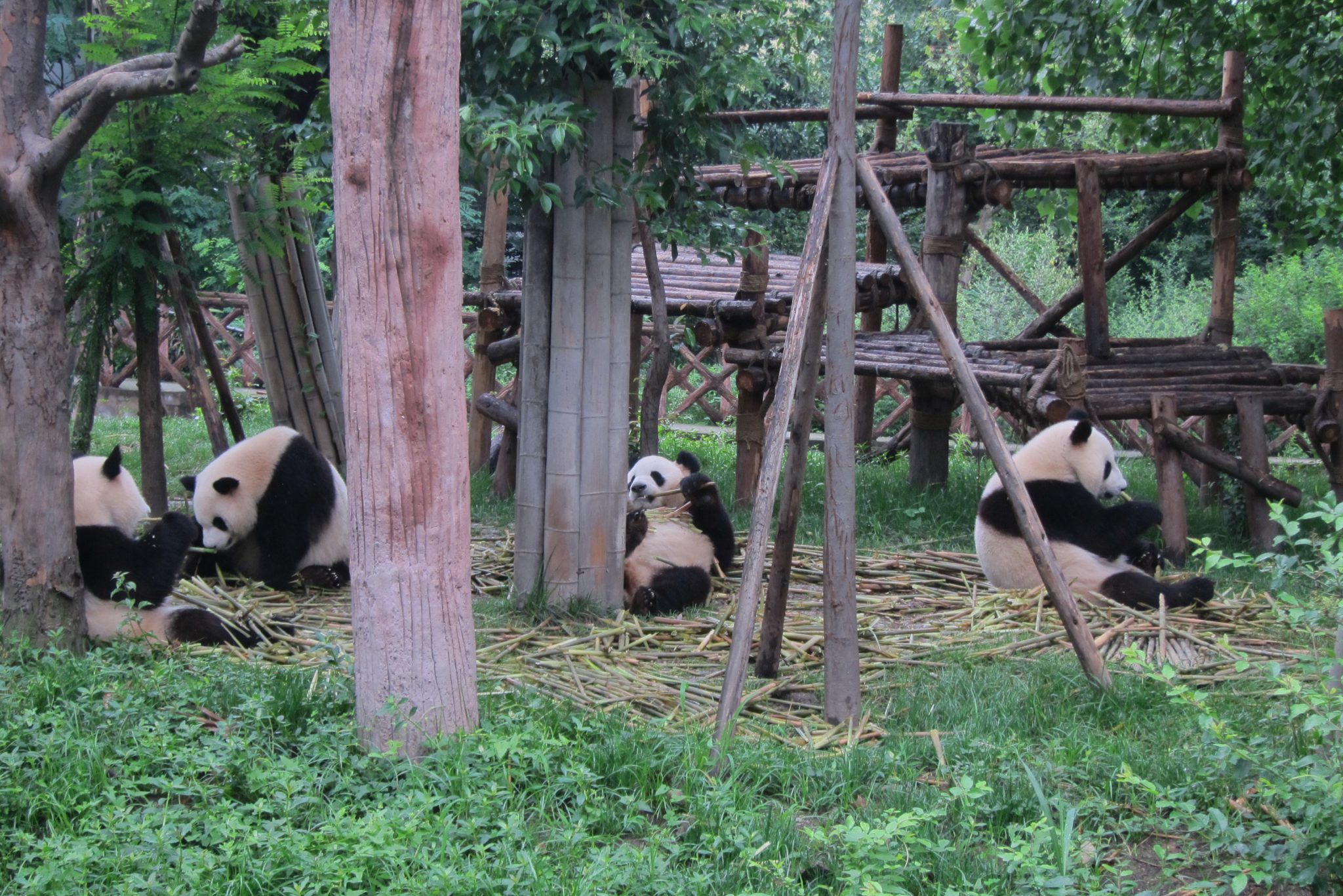 Jāsaka, ka šī tūre galīgi nebija slikta doma. Šoferis, kas pandu parku pārzina kā savu kabatu, izvadā mūs efektīvākajā veidā pa visu teritoriju. Šis ir labākais laiks, kad apciemot pandas – viņas ietur brokastis. Apsēdušās vai atlaidušās uz muguras, pandas veikli paķer kārtējo bambusa dzinumu, noloba liekās lapas, tad nokož sulīgo mīkstumu, tad atkal noloba lapas un tā joprojām. Man, skatoties uz šo maltīti, arī sāk gribēties brokastis. Tāpat var vērot jauno pandu ālēšanos kokā, savstarpējo ņemšanos un rāpšanos. Vietējā kinoteātrī tiek demonstrēta dokumentālā filma par pandām, kā arī var apmeklēt pandu muzeju. Un, protams, iegādāties visus iespējamos suvenīrus ar pandām.