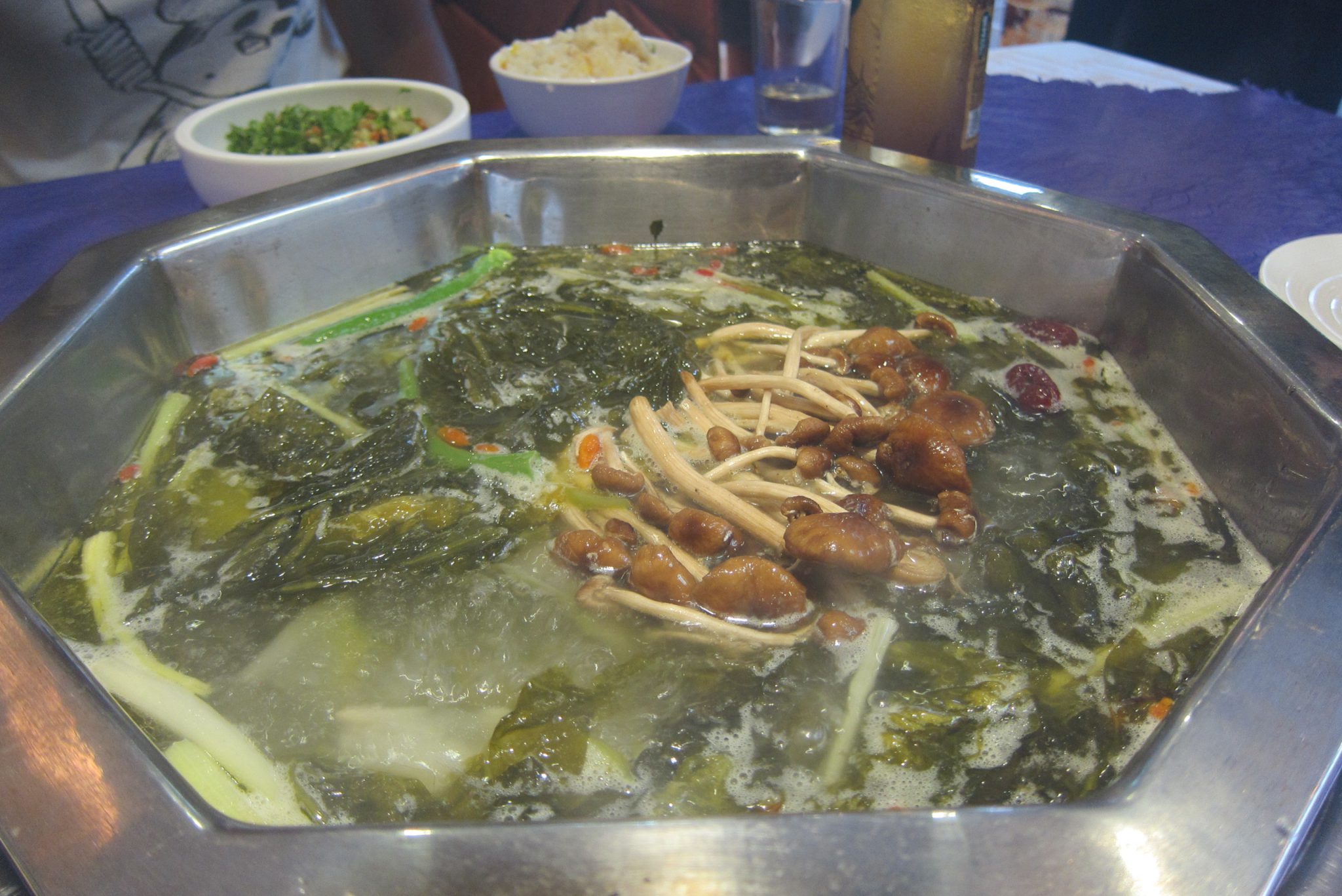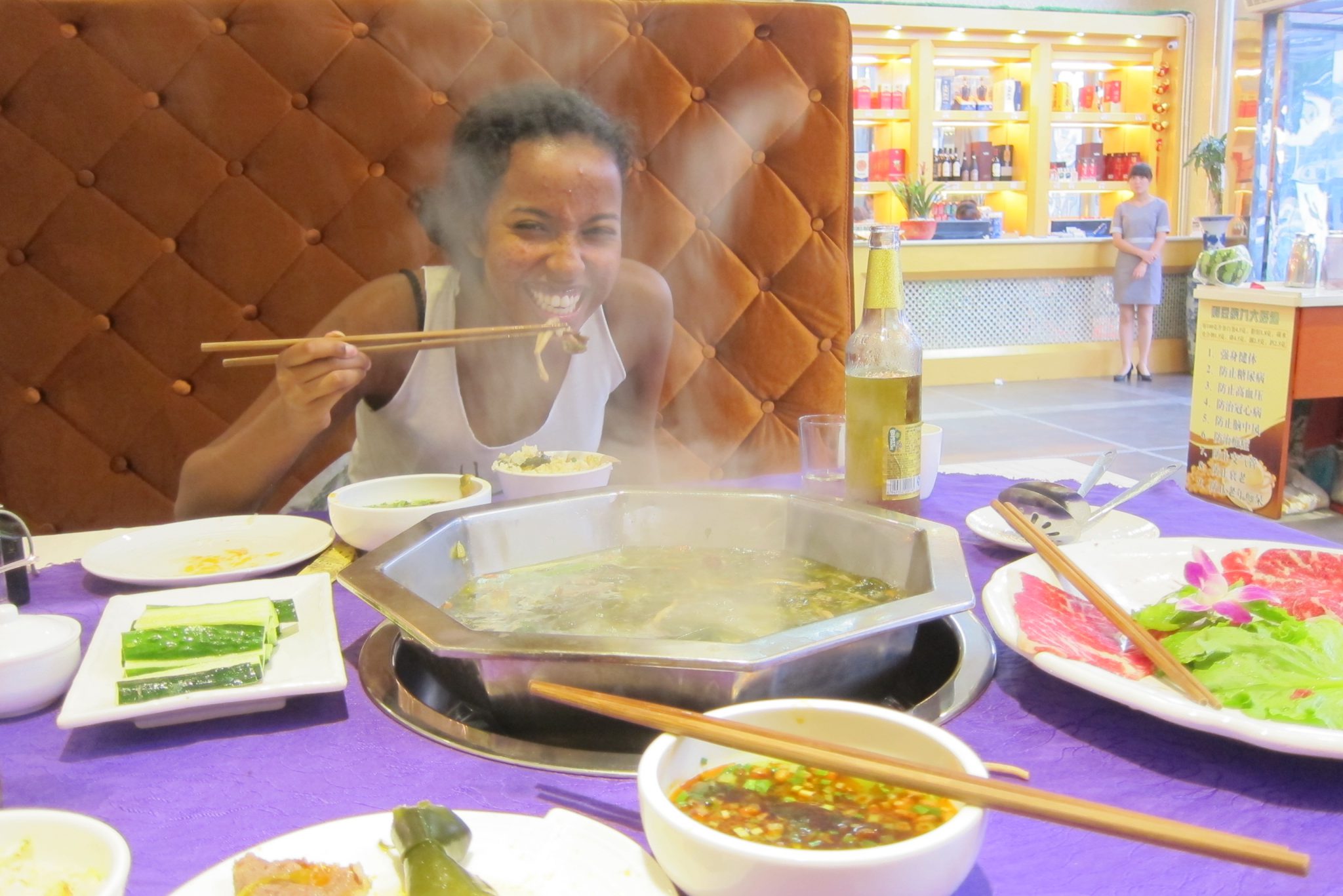 Izvēlētais muzejs gan jau ir slēgts, bet mēs aizkātojam uz blakus esošu klusu parku un apmeklējam tajā esošu kulturālu iestādījumu – uzkāpjam tornī, apskatām pāris izstādes, bet, galvenokārt, klačojamies – stāstām viena otrai ceļošanas un kaučsērfinga piedzīvojumus. Pēc krietnas pastaigas ejam vakariņās – ir jānogaršo šejienes izslavētais karstais pods. Sākumā Meklaita, kas mazliet runā ķīniešu valodā, cenšas tulkot ēdienkartes saturu, tad es saku, lai met mieru un uz labu laimi ievelku vairākus krustiņus pie sastāvdaļām – ko dos, to ēdīs. Finālā esam atzīmējušas visādus gardus dārzeņus, sēnes un liellopa gaļu. Pašas priecājamies par savu lielisko izvēli.