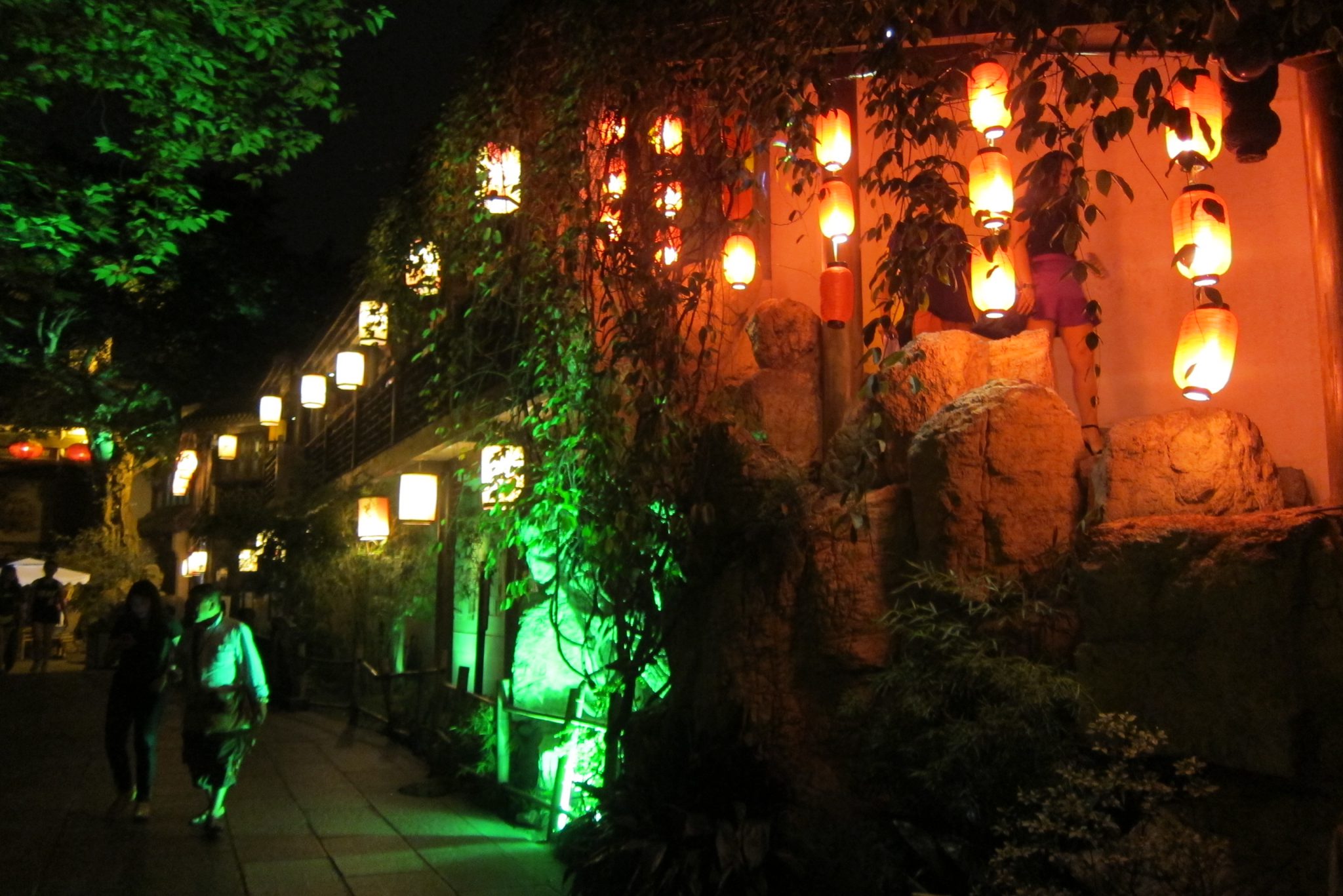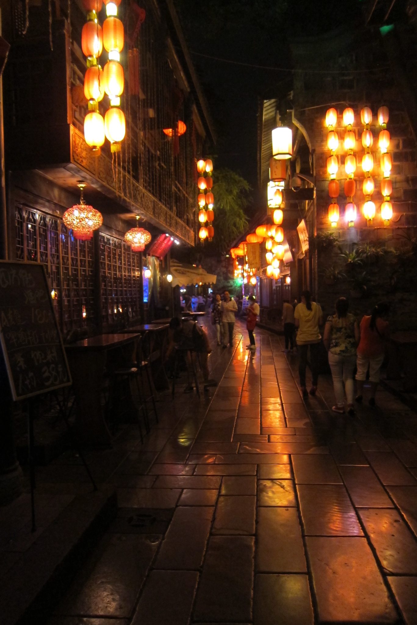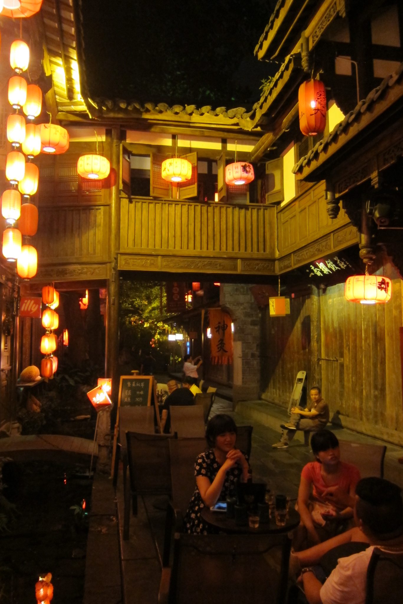 Paēdušas paņemam taksi uz Čendu rajonu, kas izslavēts dēļ šaurām ieliņām, kurās ir krodziņi un dzīvā mūzika. Vienā āra kafejnīcā meitene tik burvīgi spēlē ģitāru un dzied, ka nolemjam piesēst uz vienu alu. Kamēr tā sēžam, pamanām, ka vairums cilvēku pazūd blakus durvīs un no turienes sāk skanēt laba mūzika. Jāiet izpētīt. Atveram durvis un nokļūstam klubā – uz skatuves uzstājas grupas, bārmeņi mētā kausus un pudeles, gaismas žibinās. Labi, lai būtu viens kokteilis šeit. Maklaita pasūta zināmu dzērienu, bet es izvēlos kokteili ar nosaukumu “Apkārt pasaulei”, nenojaušot tā sastāvdaļas. Kad pagaršoju to, Maklaita skatās uz manu seju un smejas. Kokteilis ir briesmīgs. Bet tas maksā bargu naudu (Ķīnas cenās) un saviebusies turpinu vien to malkot. Pie dzēriena beigām blakus sēdošās meitenes mūs pacienā ar glāzi Martini Asti, patīkama pārmaiņa. Vienā brīdī sāk skanēt rietumu mūzika un mēs abas, kā arī vēl viens importa kungs pie bāra letes, aizrautīgi dziedam līdzi un visādi citādi izrādām savu patikšanu. Uz dziesmas beigām pa gabalu saskandinām ar kungu – ārzemnieku kopības sajūta. Ārzemnieki, kas Ķīnā dzīvo ilgi, vairs nesveicinās ar citiem, bet viesi parasti samājas.