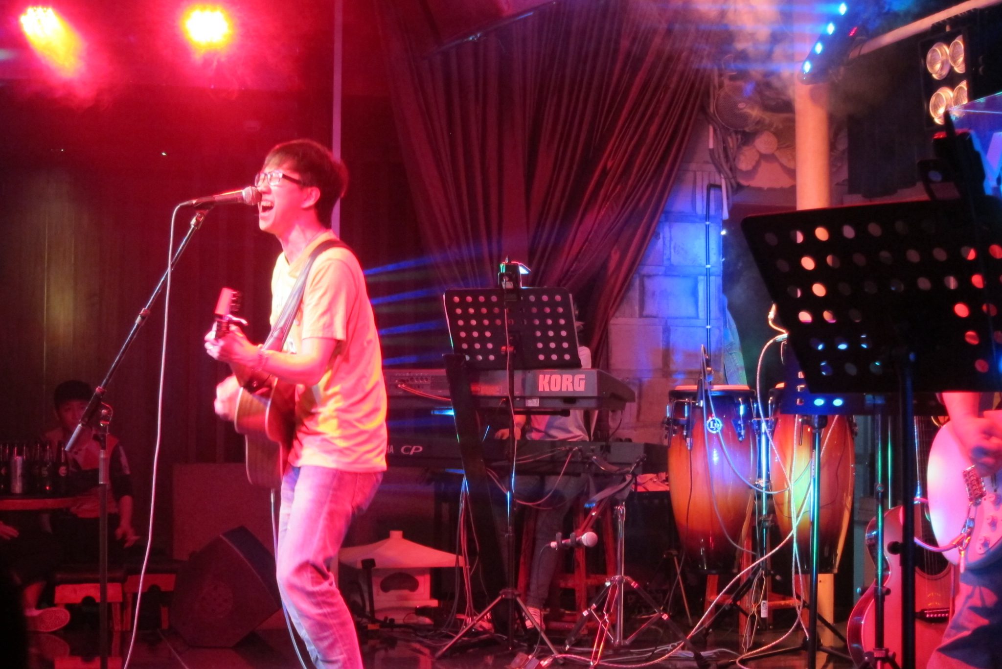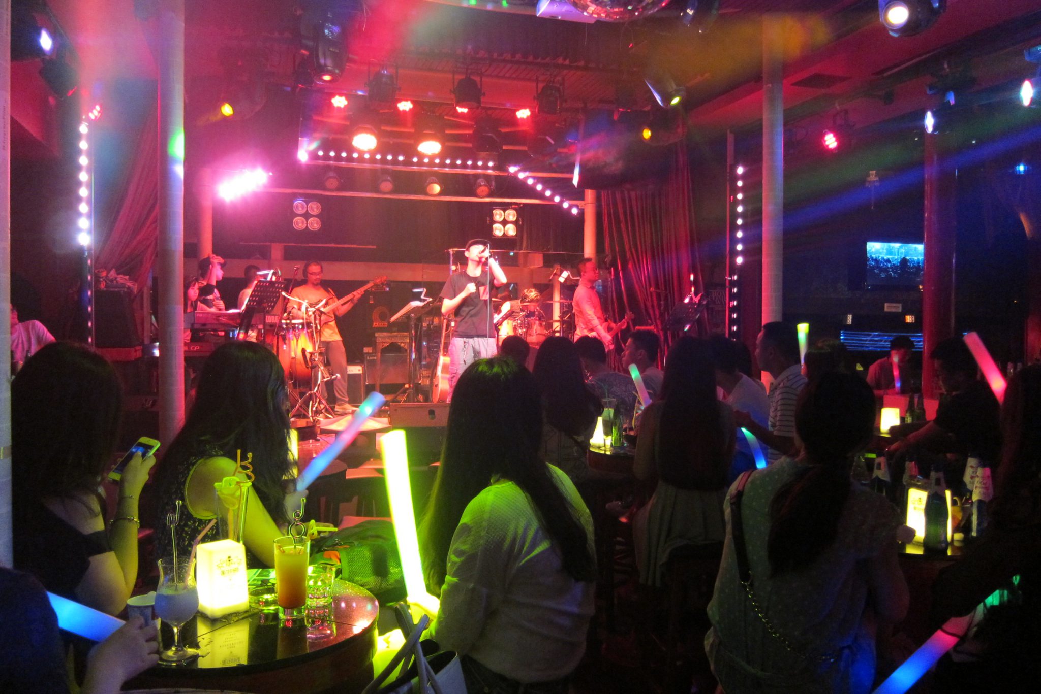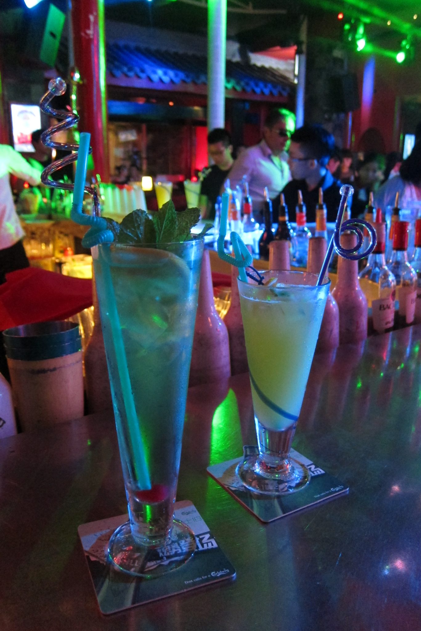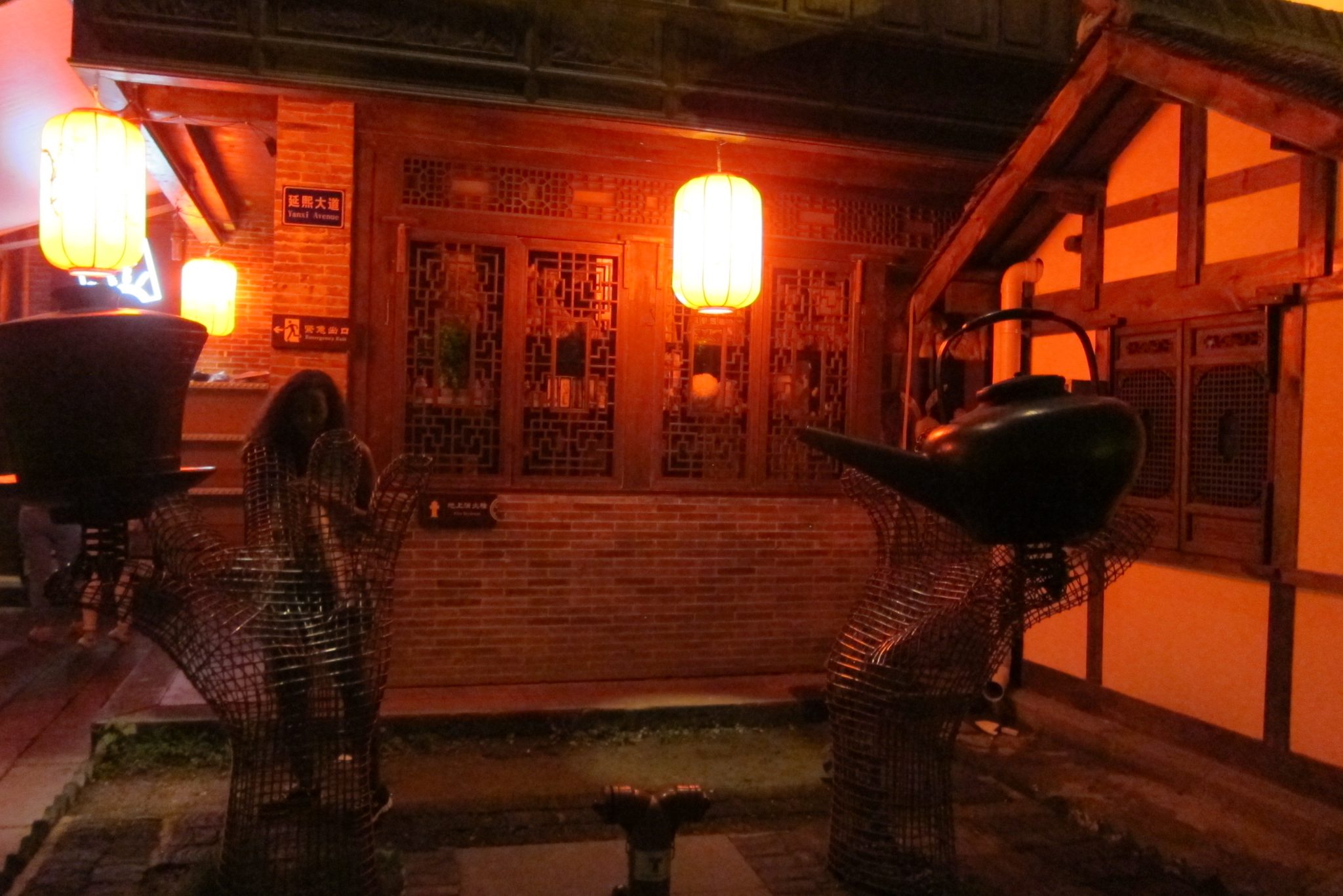 Paēdušas paņemam taksi uz Čendu rajonu, kas izslavēts dēļ šaurām ieliņām, kurās ir krodziņi un dzīvā mūzika. Vienā āra kafejnīcā meitene tik burvīgi spēlē ģitāru un dzied, ka nolemjam piesēst uz vienu alu. Kamēr tā sēžam, pamanām, ka vairums cilvēku pazūd blakus durvīs un no turienes sāk skanēt laba mūzika. Jāiet izpētīt. Atveram durvis un nokļūstam klubā – uz skatuves uzstājas grupas, bārmeņi mētā kausus un pudeles, gaismas žibinās. Labi, lai būtu viens kokteilis šeit. Maklaita pasūta zināmu dzērienu, bet es izvēlos kokteili ar nosaukumu “Apkārt pasaulei”, nenojaušot tā sastāvdaļas. Kad pagaršoju to, Maklaita skatās uz manu seju un smejas. Kokteilis ir briesmīgs. Bet tas maksā bargu naudu (Ķīnas cenās) un saviebusies turpinu vien to malkot. Pie dzēriena beigām blakus sēdošās meitenes mūs pacienā ar glāzi Martini Asti, patīkama pārmaiņa. Vienā brīdī sāk skanēt rietumu mūzika un mēs abas, kā arī vēl viens importa kungs pie bāra letes, aizrautīgi dziedam līdzi un visādi citādi izrādām savu patikšanu. Uz dziesmas beigām pa gabalu saskandinām ar kungu – ārzemnieku kopības sajūta. Ārzemnieki, kas Ķīnā dzīvo ilgi, vairs nesveicinās ar citiem, bet viesi parasti samājas.