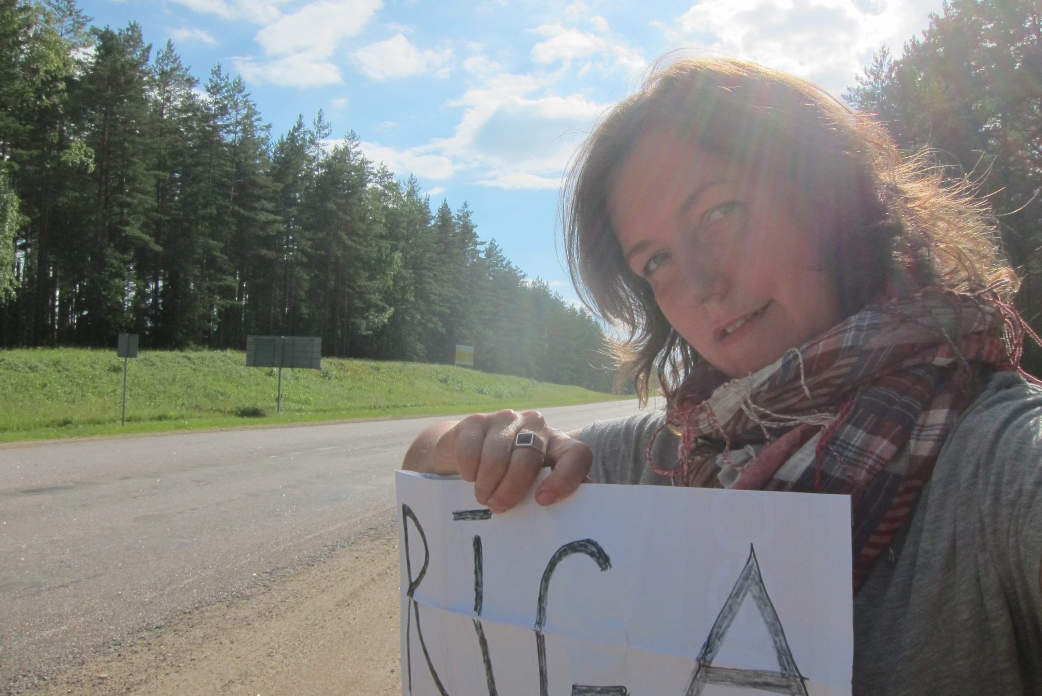 Izeju šosejas malā, paceļu roku un turu mašīnā uzzīmēto šilti „Rīga”. Nepaiet minūtes piecas, kad pietur tumšzils džips ar „mazo uzņēmēju” pie stūres, kas aizvizina mani līdz Bērzkrogam. Visu ceļu izklaidēju jaunieti ar stāstiem par kaušcērfingu un ceļošanu kā tādu, šis tīri priecīgs klausās un beigās nospriež, ka izklausās dulli, bet varētu kaut ko no tā visa izmēģināt.
