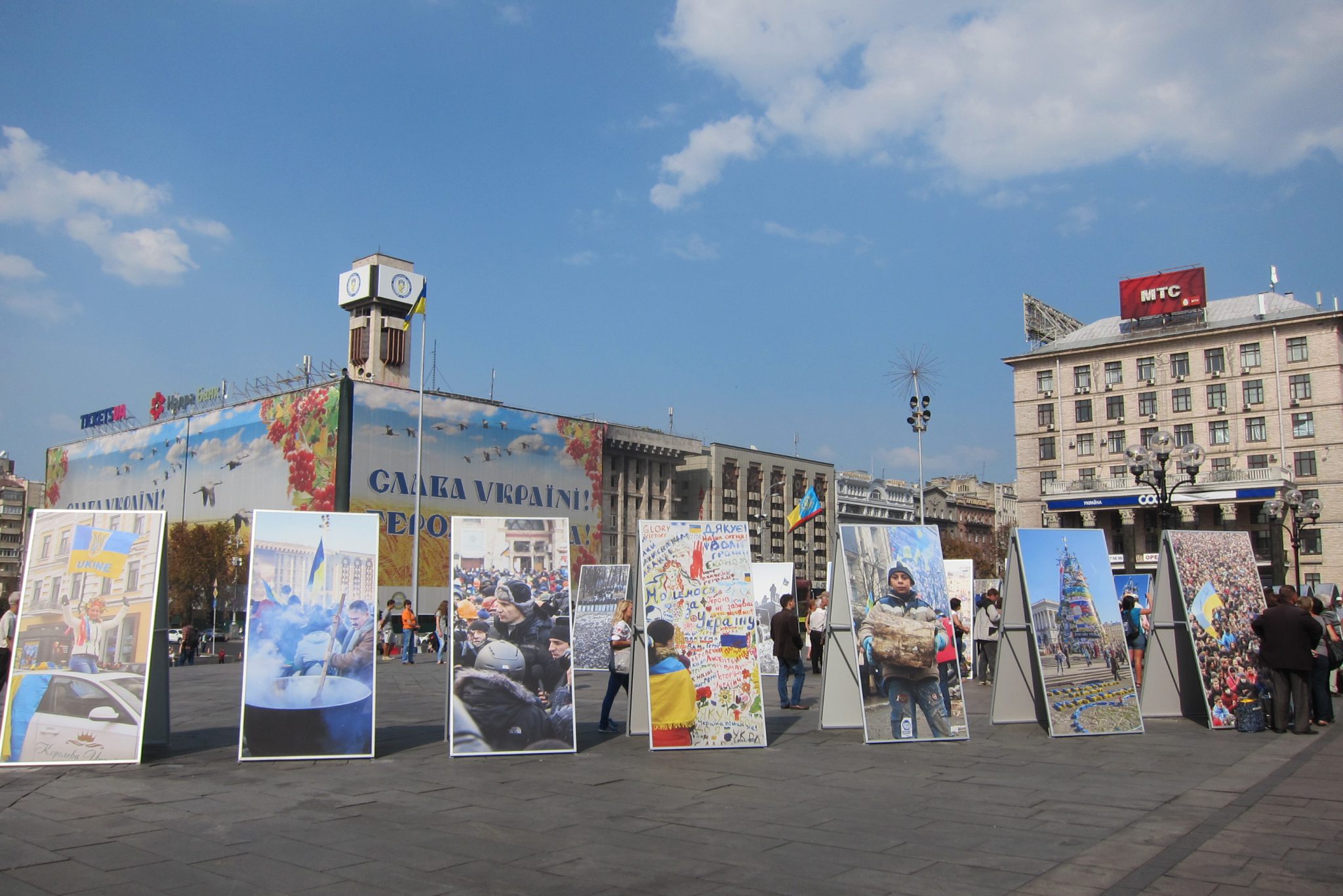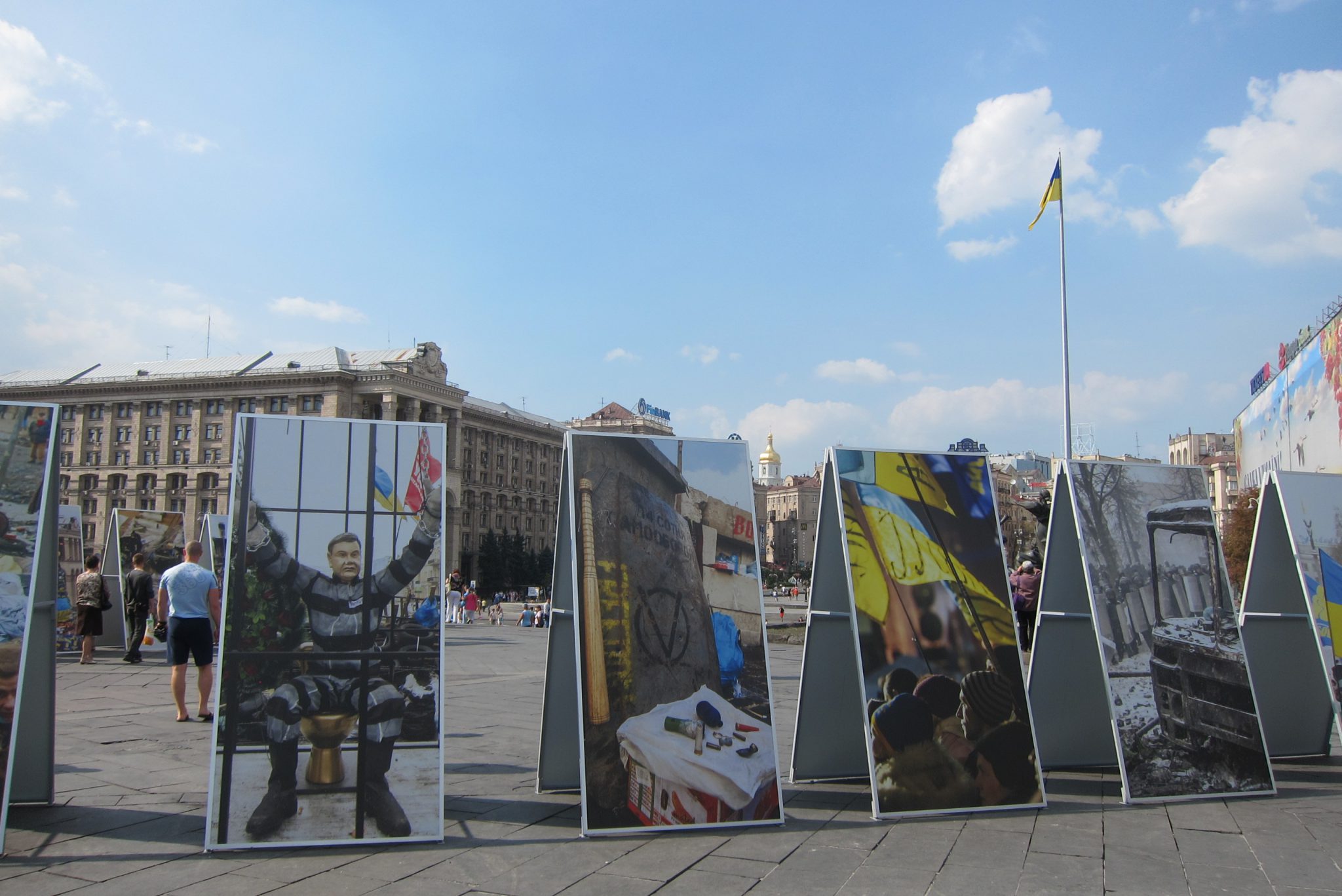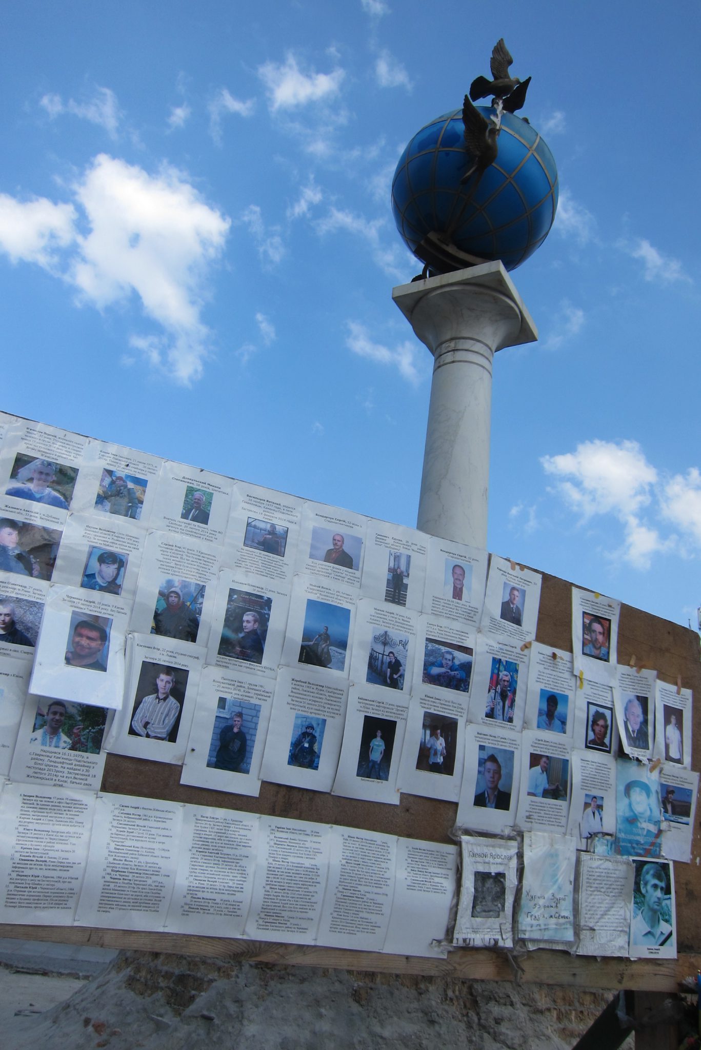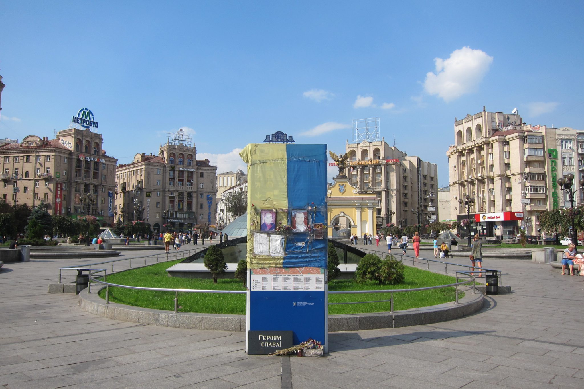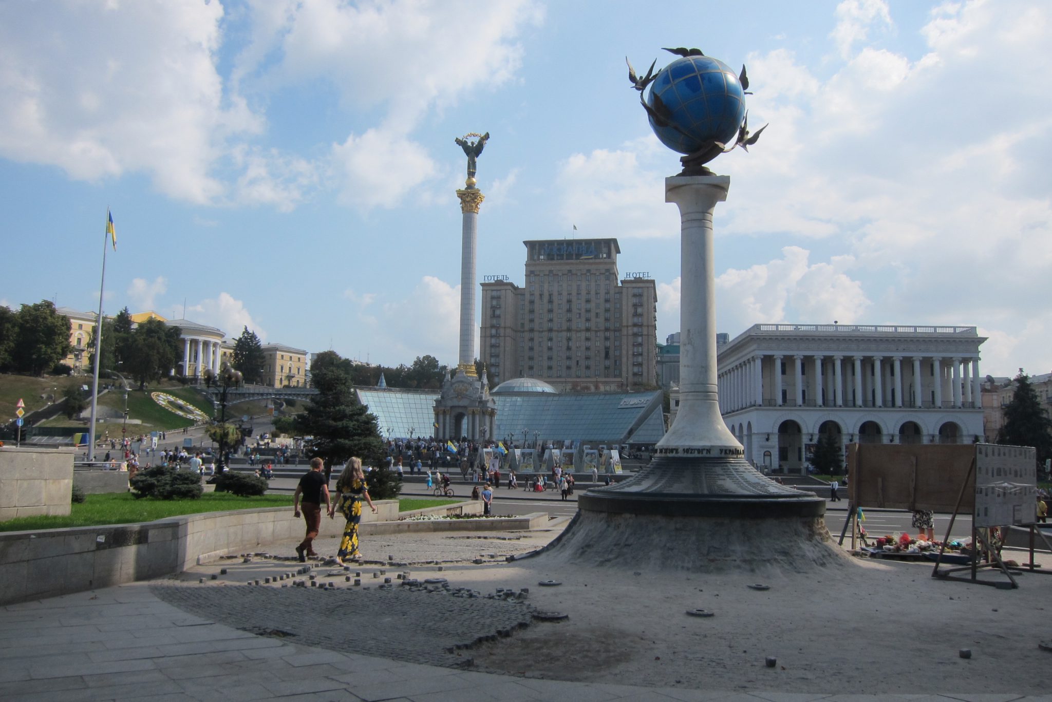 Iesākumā dodos uz Maidanu. Apsēžos tieši tai vietā, kur sēdēju pirms dažiem gadiem, kad iepriekšējo reizi te viesojos. Pie globusa ir kilometru norādes līdz daudzām pasaules un Ukrainas pilsētām. Pamanu, ka sēžu tieši starp Doņecku un Luhansku. Apaļais izliekumus, pa kuru iepriekš sīkie skrēja augšup uz globusa apmales, vairs neeksistē, vismaz lielākā tā daļa. Kādreiz akurātais bruģis ir izdauzīts un tā gabali joprojām mētājas, atgādinot par notikušo. Tāpat kā bojā gājušo bildes, kuras ir daudzviet pilsētā. Bet sīkie te skaida arī tagad, arī baloži ir atgriezušies. Te atkal valda ikdienas dzīve, tomēr par notikušo liecina daudz kas. Vienu no centrālajām laukuma ēkām, kas cietusi visvairāk, tagad klāj milzu reklāmas plakāti, godinot kritušos. Tomēr plakāts nenosedz visu ēku, un vienas tās mala joprojām skatās uz laukumu tukšām logu acīm. Arī vārgi sadīgusī zālīte apstādījumos neslēpj stikla lauskas un melnās sprādzienu pēdas. Laukumu sedzošās flīzes ir ar daudzām plaisām, stikla māju konstrukcijās – caurumi. Laukumā arī izvietoti daudzi plakāti – daļa veltīta neseno notikumu hronikām, daļā atspoguļoti pierādījumi, kas apstiprina Krievijas darbības Ukrainā.