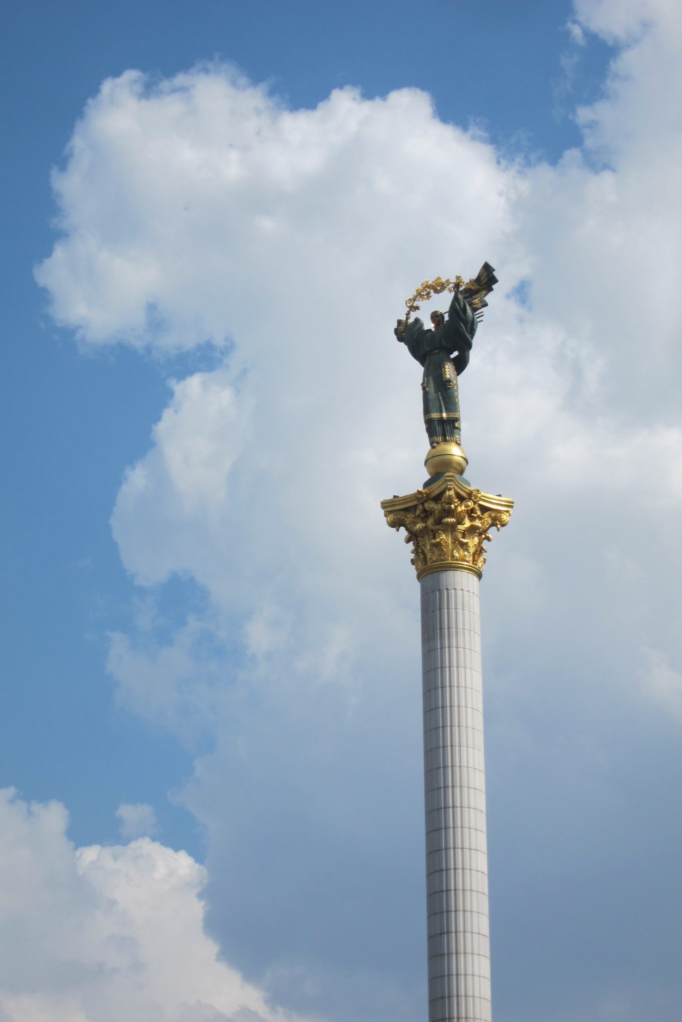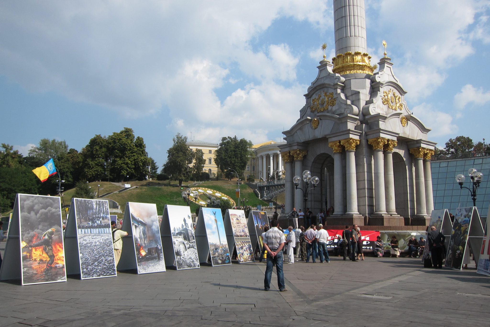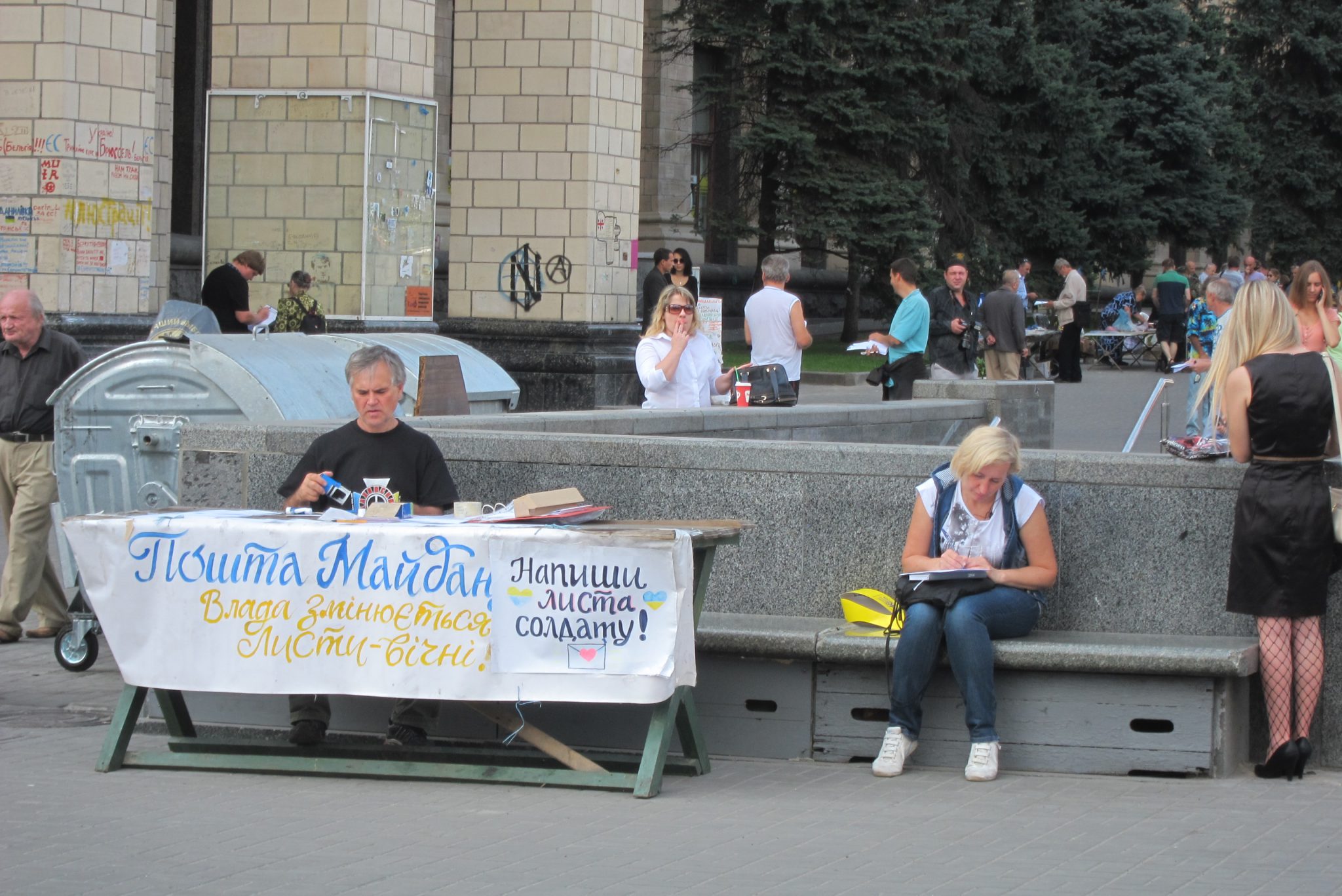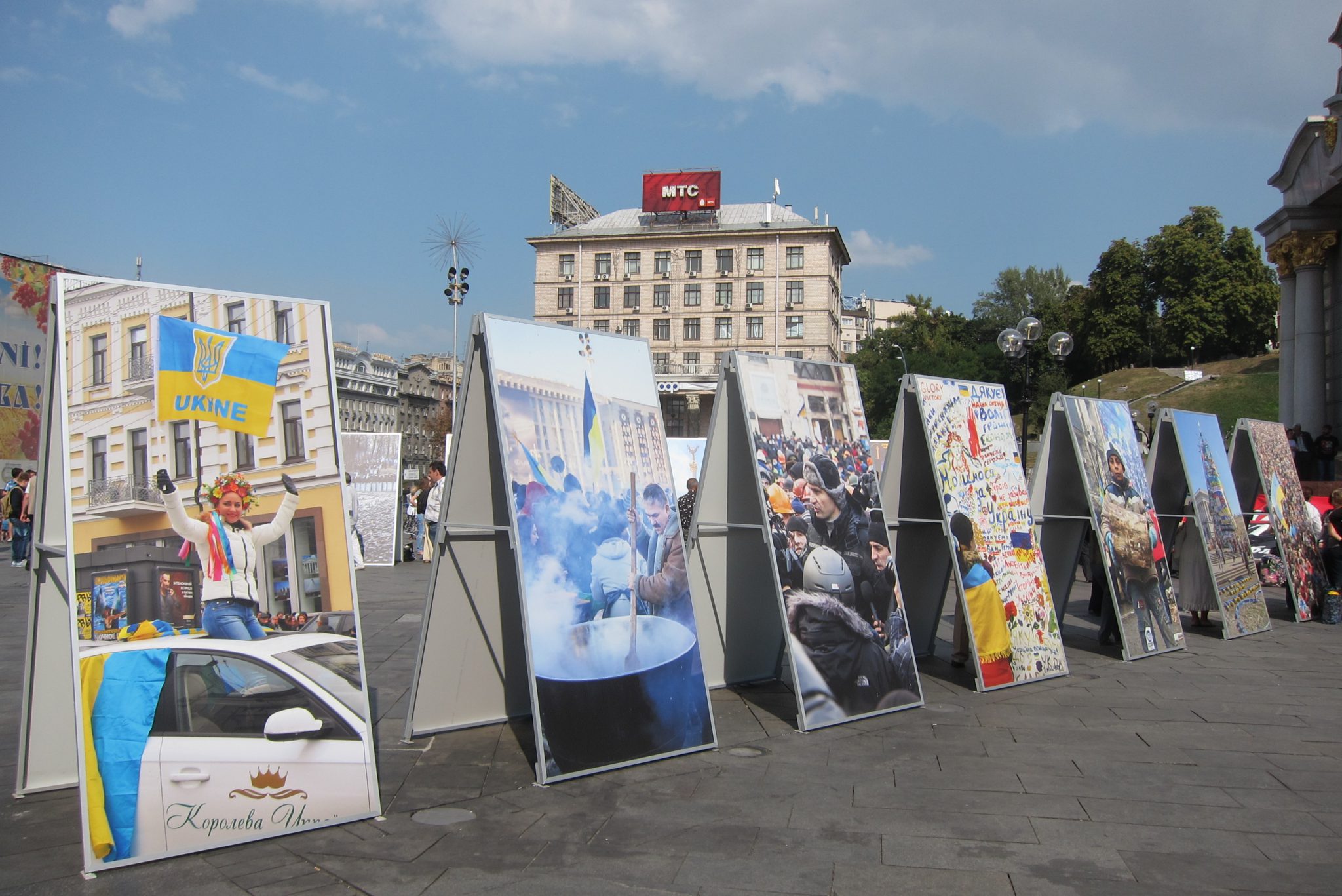 Iesākumā dodos uz Maidanu. Apsēžos tieši tai vietā, kur sēdēju pirms dažiem gadiem, kad iepriekšējo reizi te viesojos. Pie globusa ir kilometru norādes līdz daudzām pasaules un Ukrainas pilsētām. Pamanu, ka sēžu tieši starp Doņecku un Luhansku. Apaļais izliekumus, pa kuru iepriekš sīkie skrēja augšup uz globusa apmales, vairs neeksistē, vismaz lielākā tā daļa. Kādreiz akurātais bruģis ir izdauzīts un tā gabali joprojām mētājas, atgādinot par notikušo. Tāpat kā bojā gājušo bildes, kuras ir daudzviet pilsētā. Bet sīkie te skaida arī tagad, arī baloži ir atgriezušies. Te atkal valda ikdienas dzīve, tomēr par notikušo liecina daudz kas. Vienu no centrālajām laukuma ēkām, kas cietusi visvairāk, tagad klāj milzu reklāmas plakāti, godinot kritušos. Tomēr plakāts nenosedz visu ēku, un vienas tās mala joprojām skatās uz laukumu tukšām logu acīm. Arī vārgi sadīgusī zālīte apstādījumos neslēpj stikla lauskas un melnās sprādzienu pēdas. Laukumu sedzošās flīzes ir ar daudzām plaisām, stikla māju konstrukcijās – caurumi. Laukumā arī izvietoti daudzi plakāti – daļa veltīta neseno notikumu hronikām, daļā atspoguļoti pierādījumi, kas apstiprina Krievijas darbības Ukrainā.