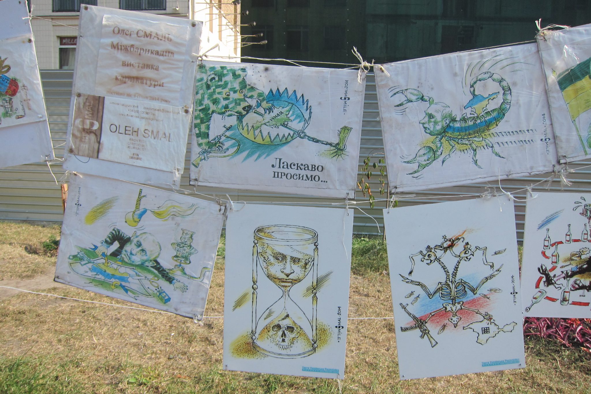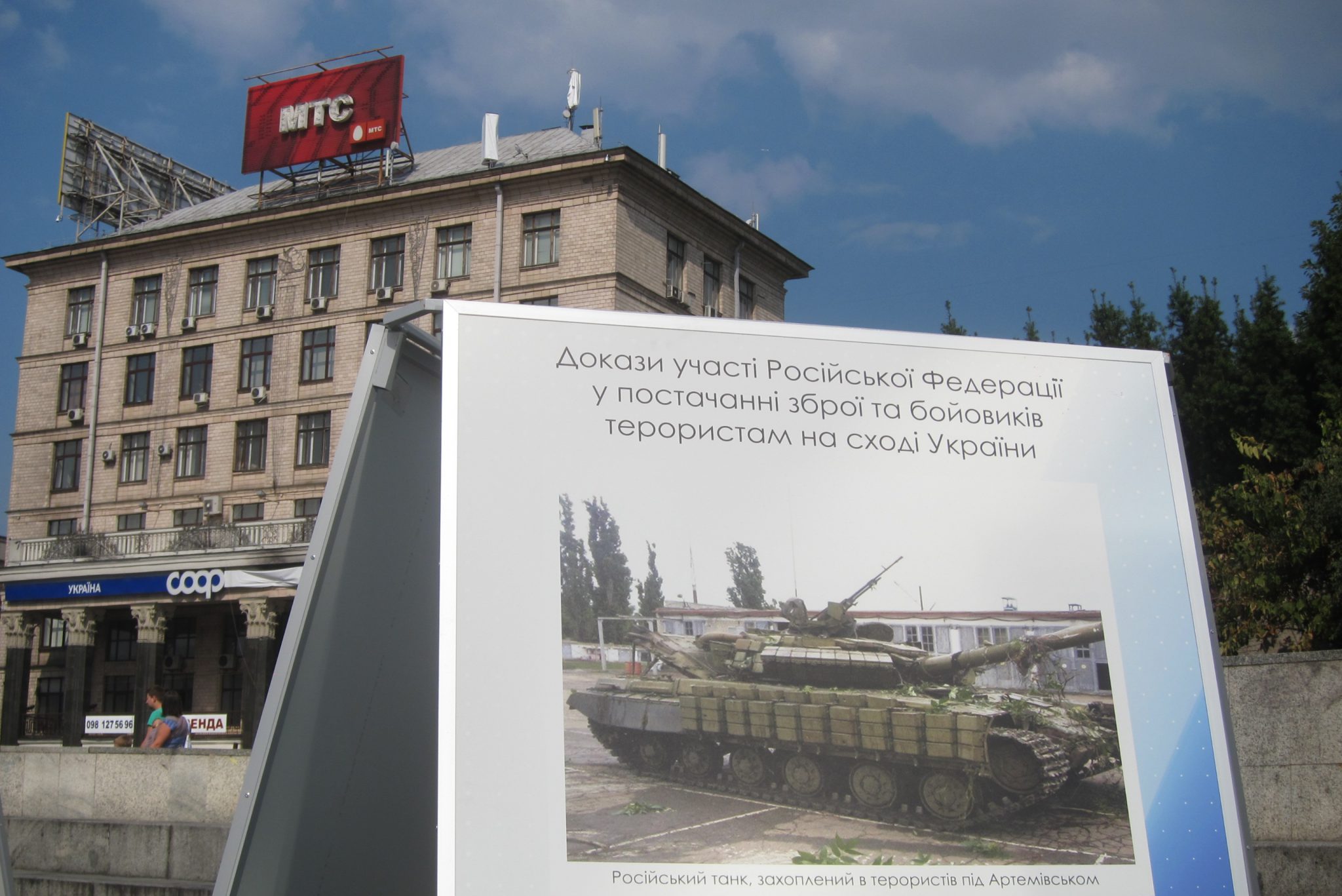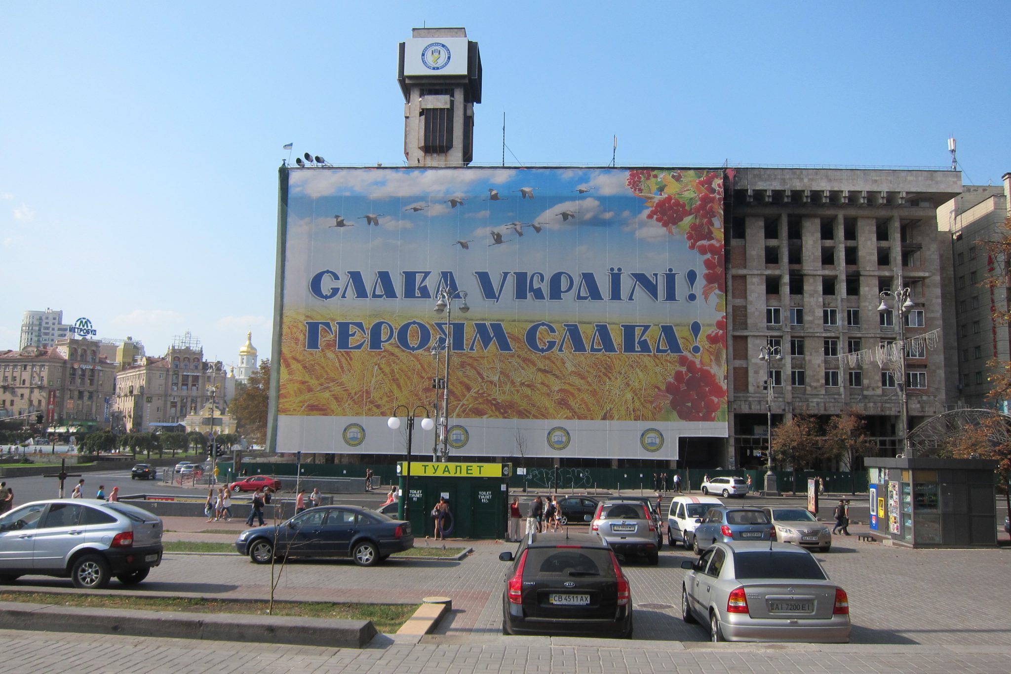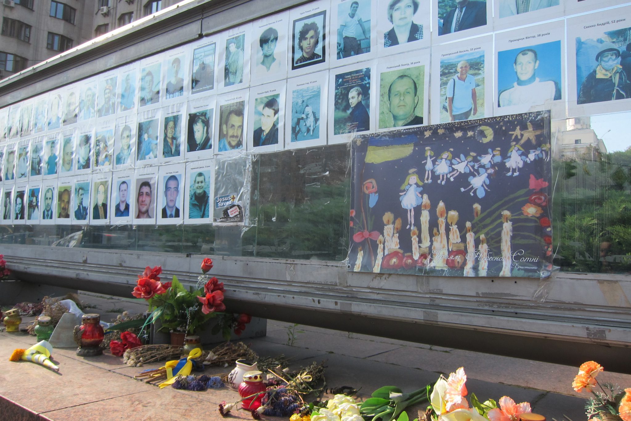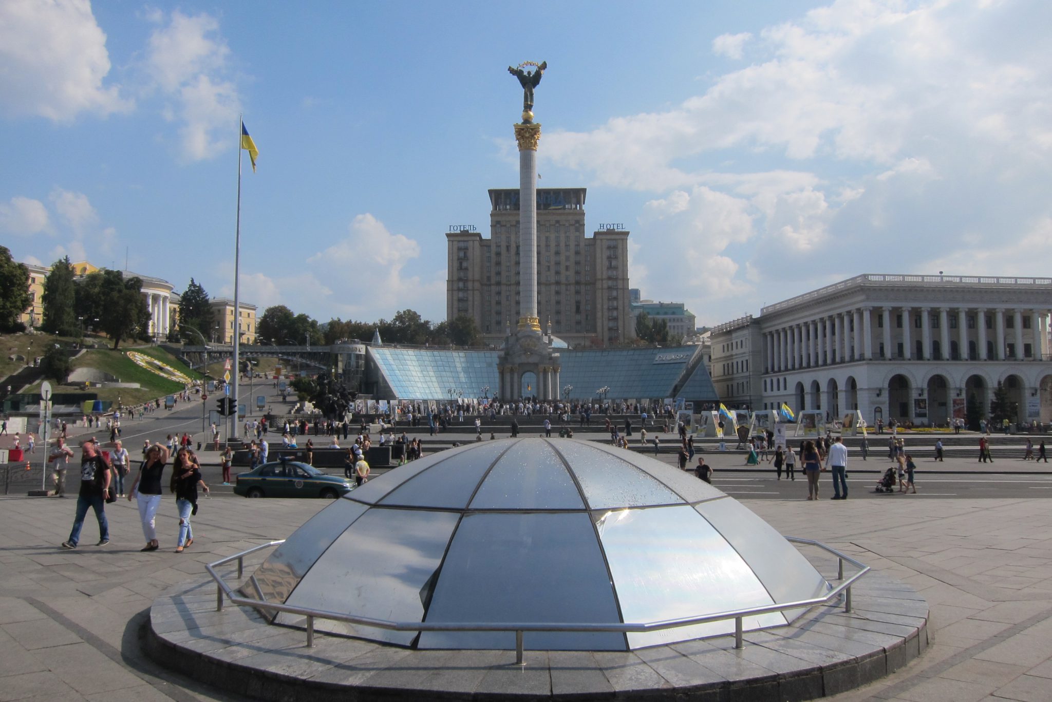 Iesākumā dodos uz Maidanu. Apsēžos tieši tai vietā, kur sēdēju pirms dažiem gadiem, kad iepriekšējo reizi te viesojos. Pie globusa ir kilometru norādes līdz daudzām pasaules un Ukrainas pilsētām. Pamanu, ka sēžu tieši starp Doņecku un Luhansku. Apaļais izliekumus, pa kuru iepriekš sīkie skrēja augšup uz globusa apmales, vairs neeksistē, vismaz lielākā tā daļa. Kādreiz akurātais bruģis ir izdauzīts un tā gabali joprojām mētājas, atgādinot par notikušo. Tāpat kā bojā gājušo bildes, kuras ir daudzviet pilsētā. Bet sīkie te skaida arī tagad, arī baloži ir atgriezušies. Te atkal valda ikdienas dzīve, tomēr par notikušo liecina daudz kas. Vienu no centrālajām laukuma ēkām, kas cietusi visvairāk, tagad klāj milzu reklāmas plakāti, godinot kritušos. Tomēr plakāts nenosedz visu ēku, un vienas tās mala joprojām skatās uz laukumu tukšām logu acīm. Arī vārgi sadīgusī zālīte apstādījumos neslēpj stikla lauskas un melnās sprādzienu pēdas. Laukumu sedzošās flīzes ir ar daudzām plaisām, stikla māju konstrukcijās – caurumi. Laukumā arī izvietoti daudzi plakāti – daļa veltīta neseno notikumu hronikām, daļā atspoguļoti pierādījumi, kas apstiprina Krievijas darbības Ukrainā.