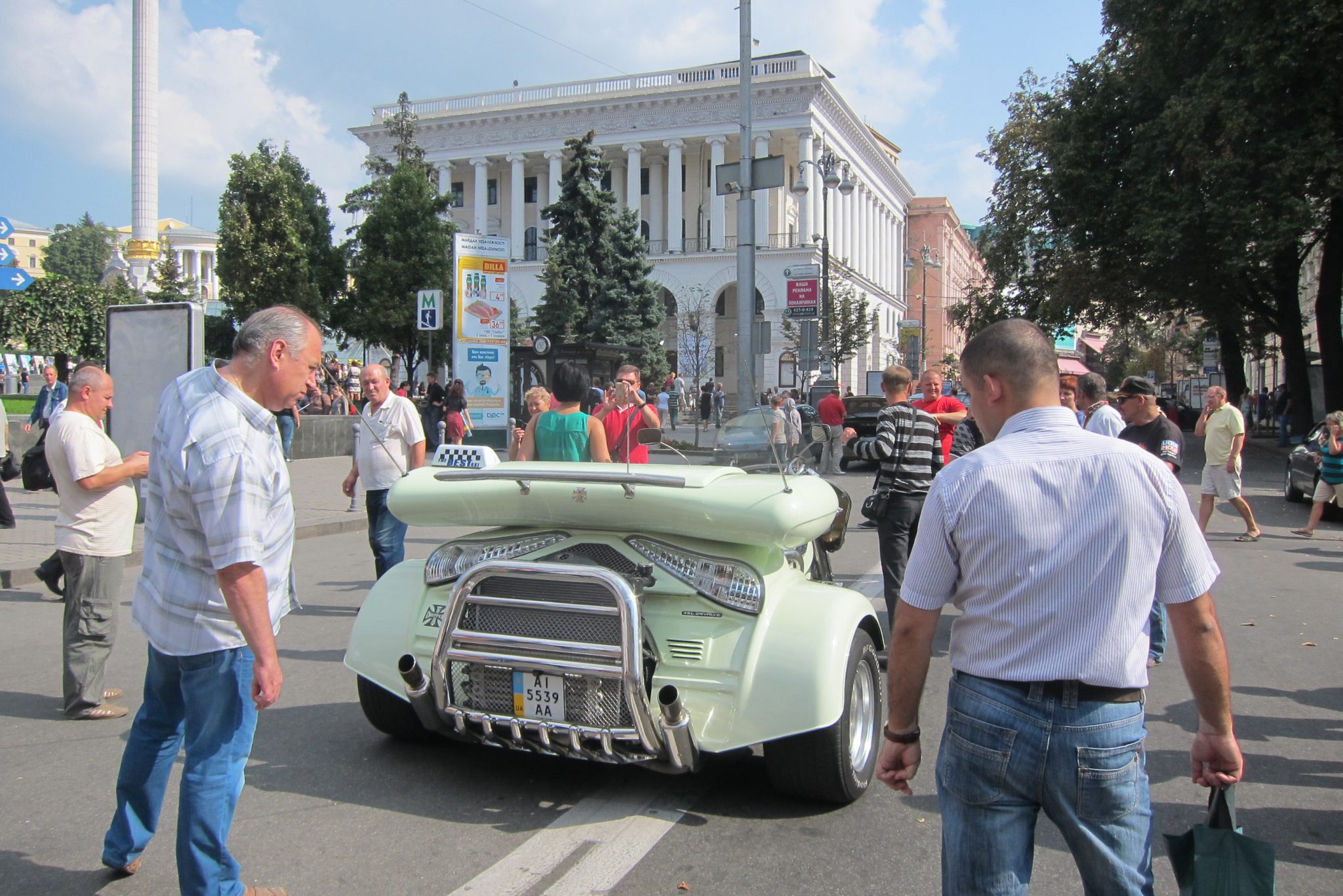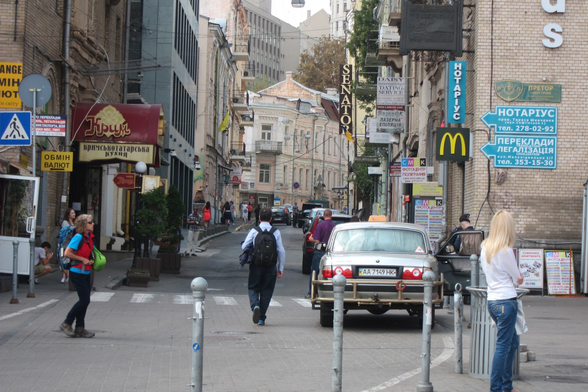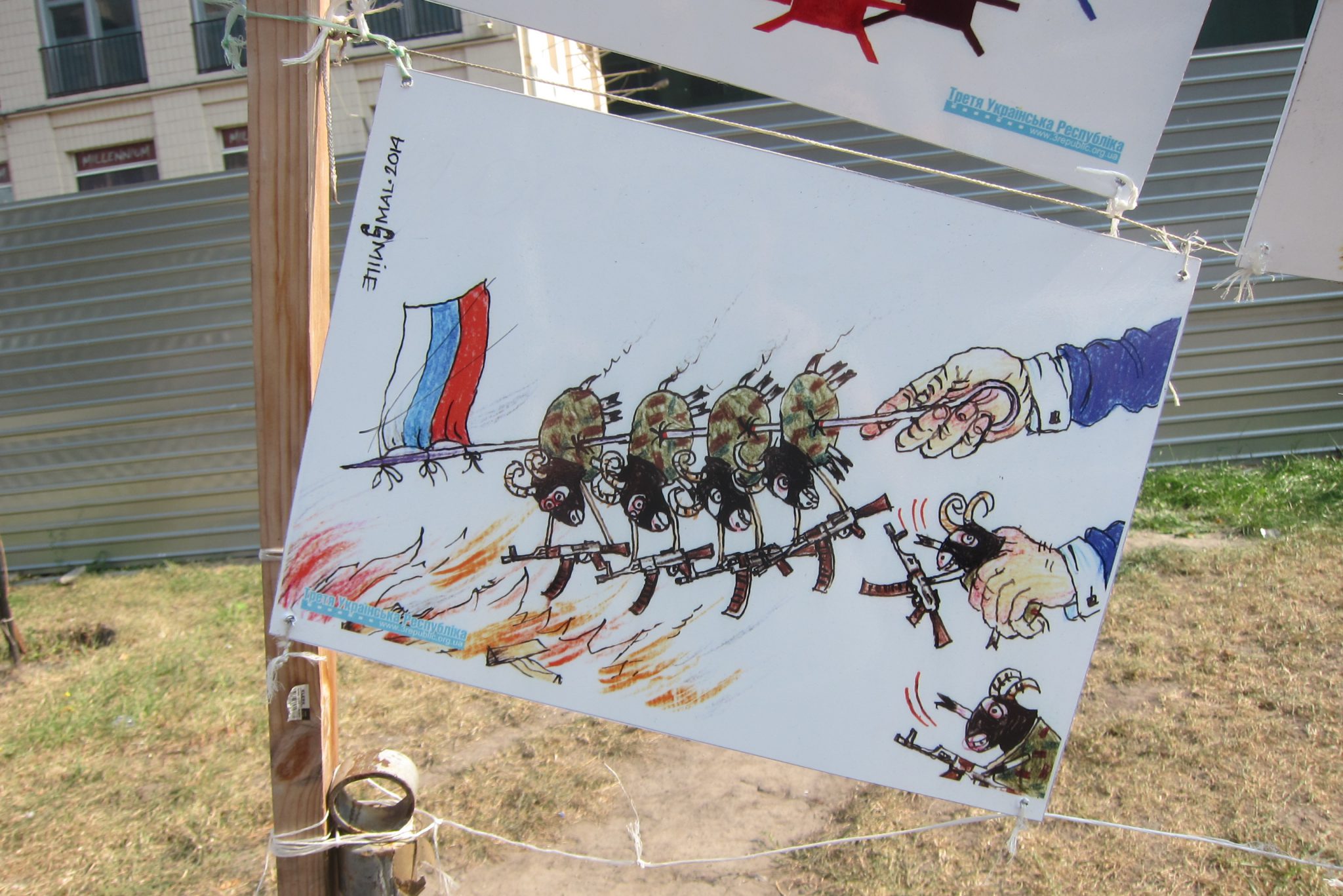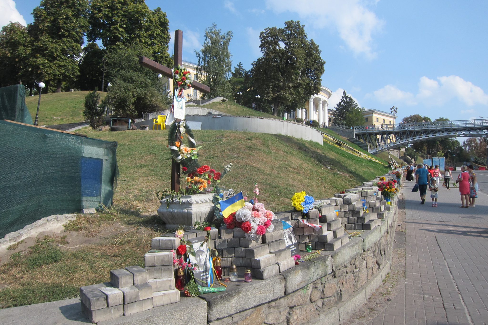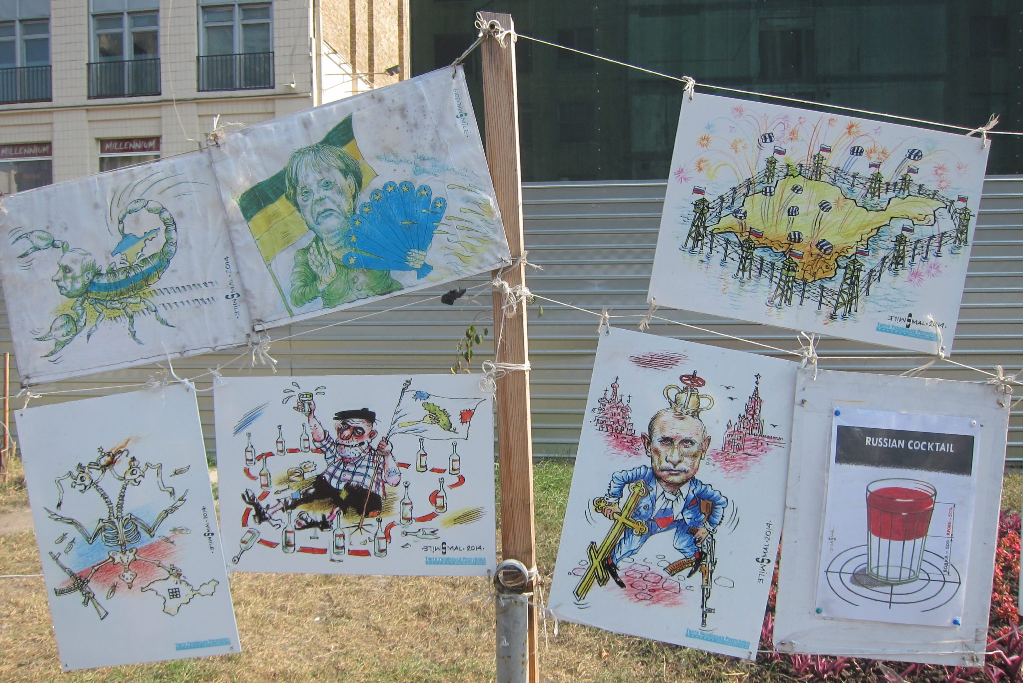 Iesākumā dodos uz Maidanu. Apsēžos tieši tai vietā, kur sēdēju pirms dažiem gadiem, kad iepriekšējo reizi te viesojos. Pie globusa ir kilometru norādes līdz daudzām pasaules un Ukrainas pilsētām. Pamanu, ka sēžu tieši starp Doņecku un Luhansku. Apaļais izliekumus, pa kuru iepriekš sīkie skrēja augšup uz globusa apmales, vairs neeksistē, vismaz lielākā tā daļa. Kādreiz akurātais bruģis ir izdauzīts un tā gabali joprojām mētājas, atgādinot par notikušo. Tāpat kā bojā gājušo bildes, kuras ir daudzviet pilsētā. Bet sīkie te skaida arī tagad, arī baloži ir atgriezušies. Te atkal valda ikdienas dzīve, tomēr par notikušo liecina daudz kas. Vienu no centrālajām laukuma ēkām, kas cietusi visvairāk, tagad klāj milzu reklāmas plakāti, godinot kritušos. Tomēr plakāts nenosedz visu ēku, un vienas tās mala joprojām skatās uz laukumu tukšām logu acīm. Arī vārgi sadīgusī zālīte apstādījumos neslēpj stikla lauskas un melnās sprādzienu pēdas. Laukumu sedzošās flīzes ir ar daudzām plaisām, stikla māju konstrukcijās – caurumi. Laukumā arī izvietoti daudzi plakāti – daļa veltīta neseno notikumu hronikām, daļā atspoguļoti pierādījumi, kas apstiprina Krievijas darbības Ukrainā.