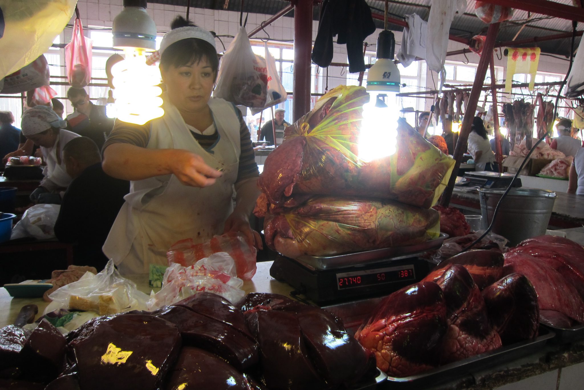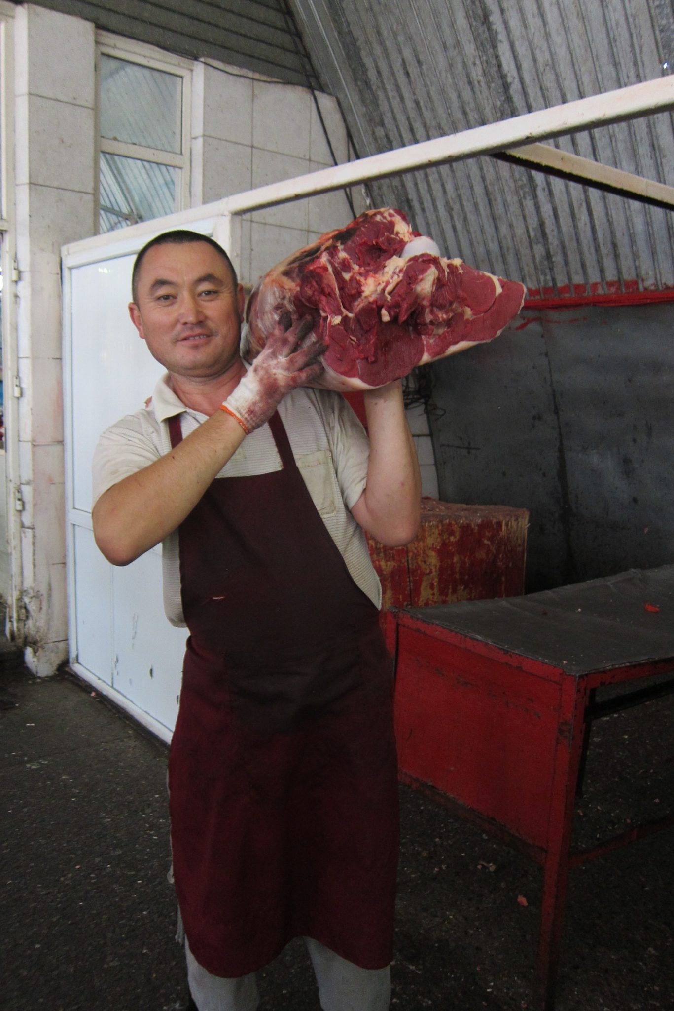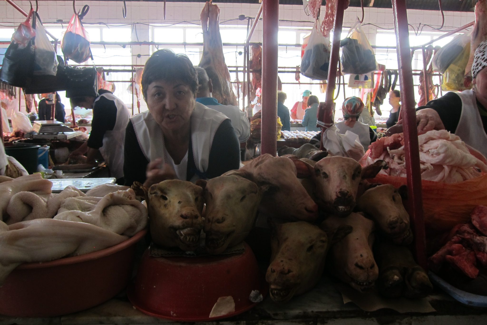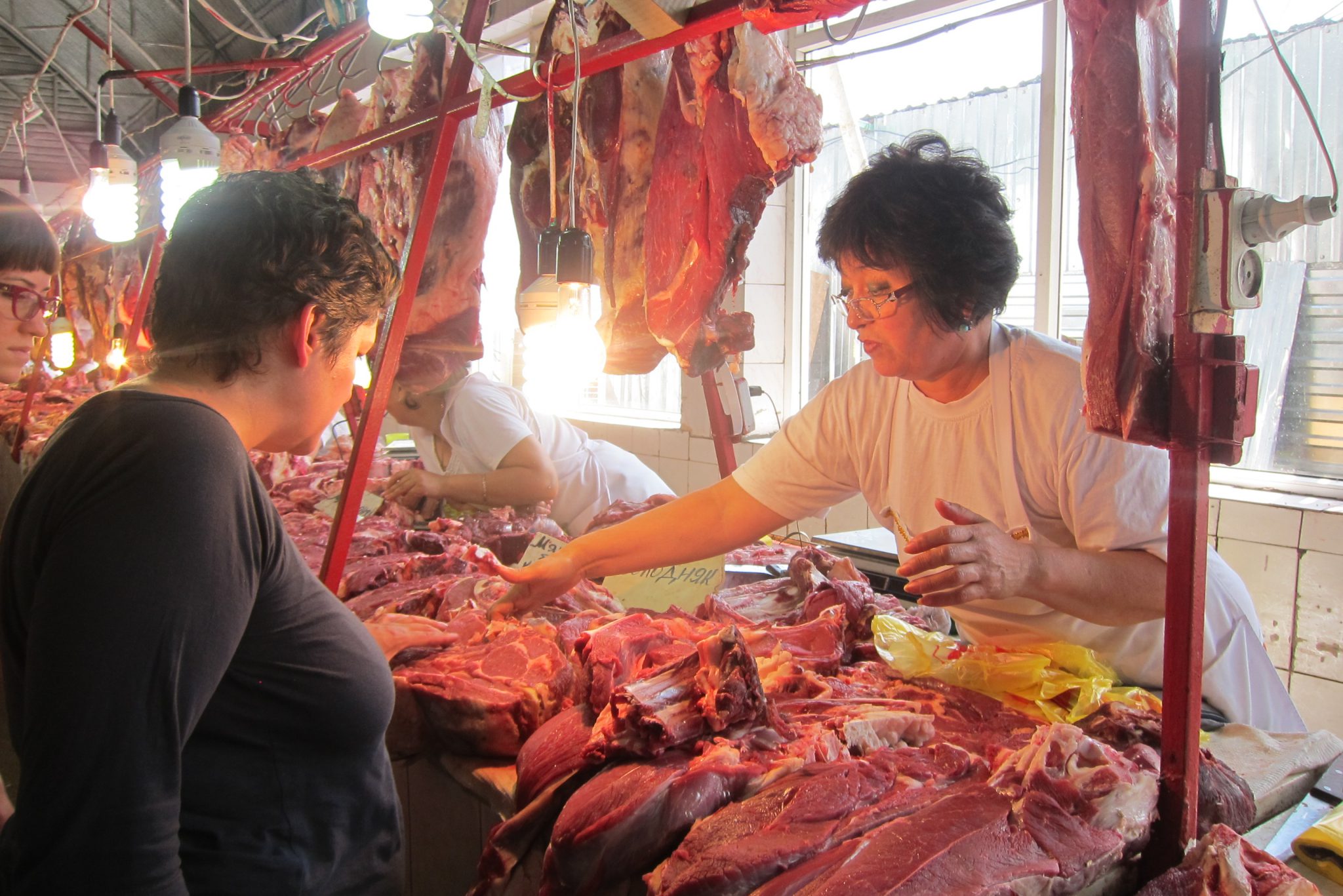 Daudzviet tirgū produkti tiek tirgoti tikai vairumā – avenes un zemenes jāpērk vismaz viena kaste, kurā ir teju 10 kilogrami. Tāpat ir ar āboliem, vīnogām, persikiem un citiem augļiem. Bet vietām tomēr var iegādāties arī pa kilogramam – es sapērku augļu kules, lai tuvākajās dienās būtu ar ko mieloties. Arī Aņa ar mammu iepērkas – somā tiek liktas milzu zaļumu buntes, marinēti salāti un dažādi gaļas produkti. Pastaiga pa gaļas paviljonu šeit ir visiespaidīgākā, jo pamatā tiek tirgota nevis pati gaļa, bet gan tās subprodukti, tai skaitā tādi, kurus pie mums neredz. Kamēr Aņas mamma ar lietpratēja skatienu izvēlas produkciju, es fotografēju pa labi un pa kreisi – gan pašus produktus, gan cilvēkus. Īpaši man acīs iekrīt kāda meitene. Ja pārsvarā pārdevējas ir tādas kārtīgas tirgus sievas, tad šī meitene izskatās kā trausls eņģelis, kas šeit nonācis pārpratuma pēc. Jau rakstīju Tviterī – viņai baletu dejot vai dzeju lasīt piestāvētu. Kad lūdzu atļauju viņu nofotografēt, meitene samulst, bet piekrīt. Kopumā es šeit reti prasu atļauju fotogrāfijām, cilvēkiem patīk, ka viņus bildē. Vairāki gaļas vīri paši uzprasās un lūdz, lai es šos nofotografēju. Par ko ne, to arī daru.