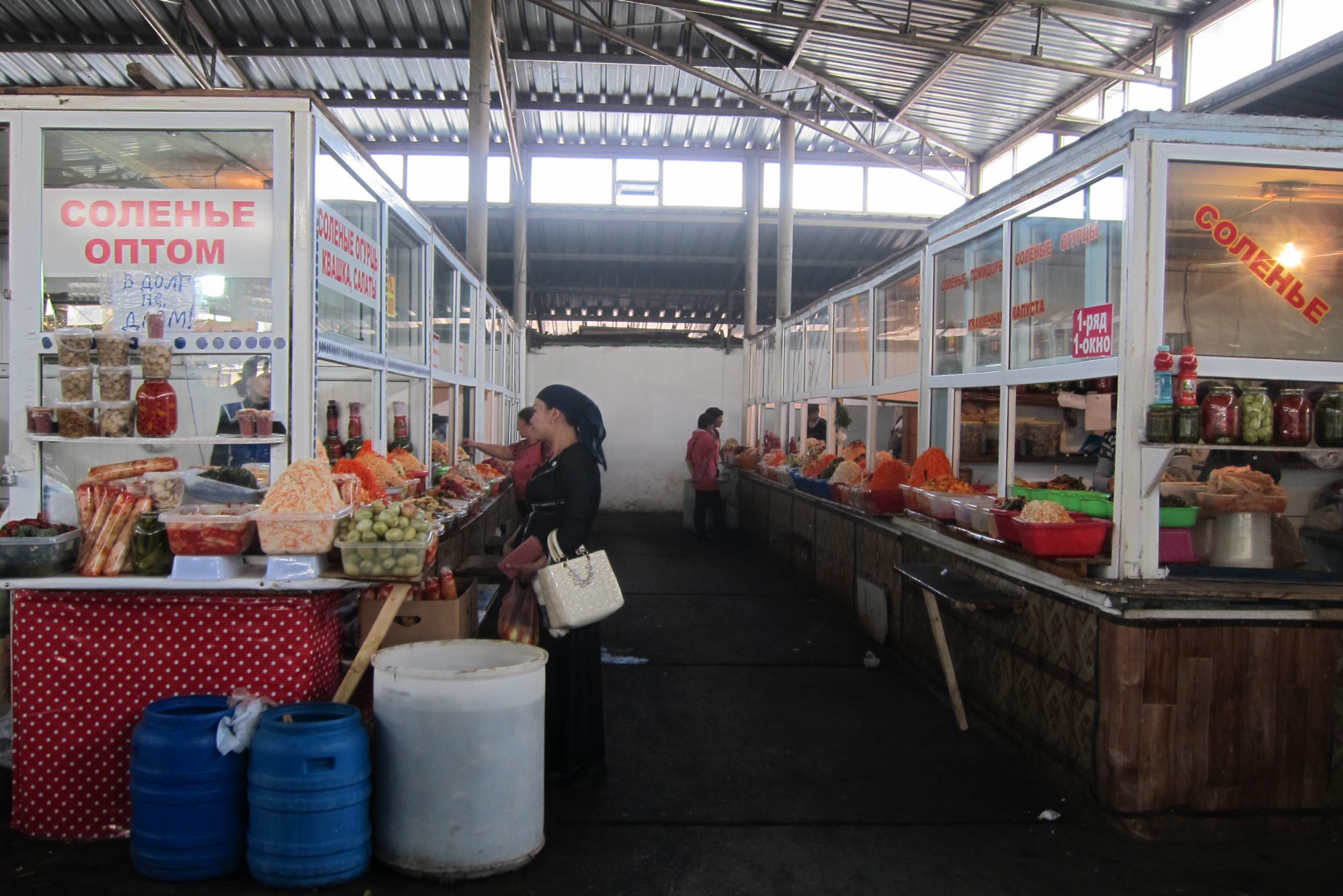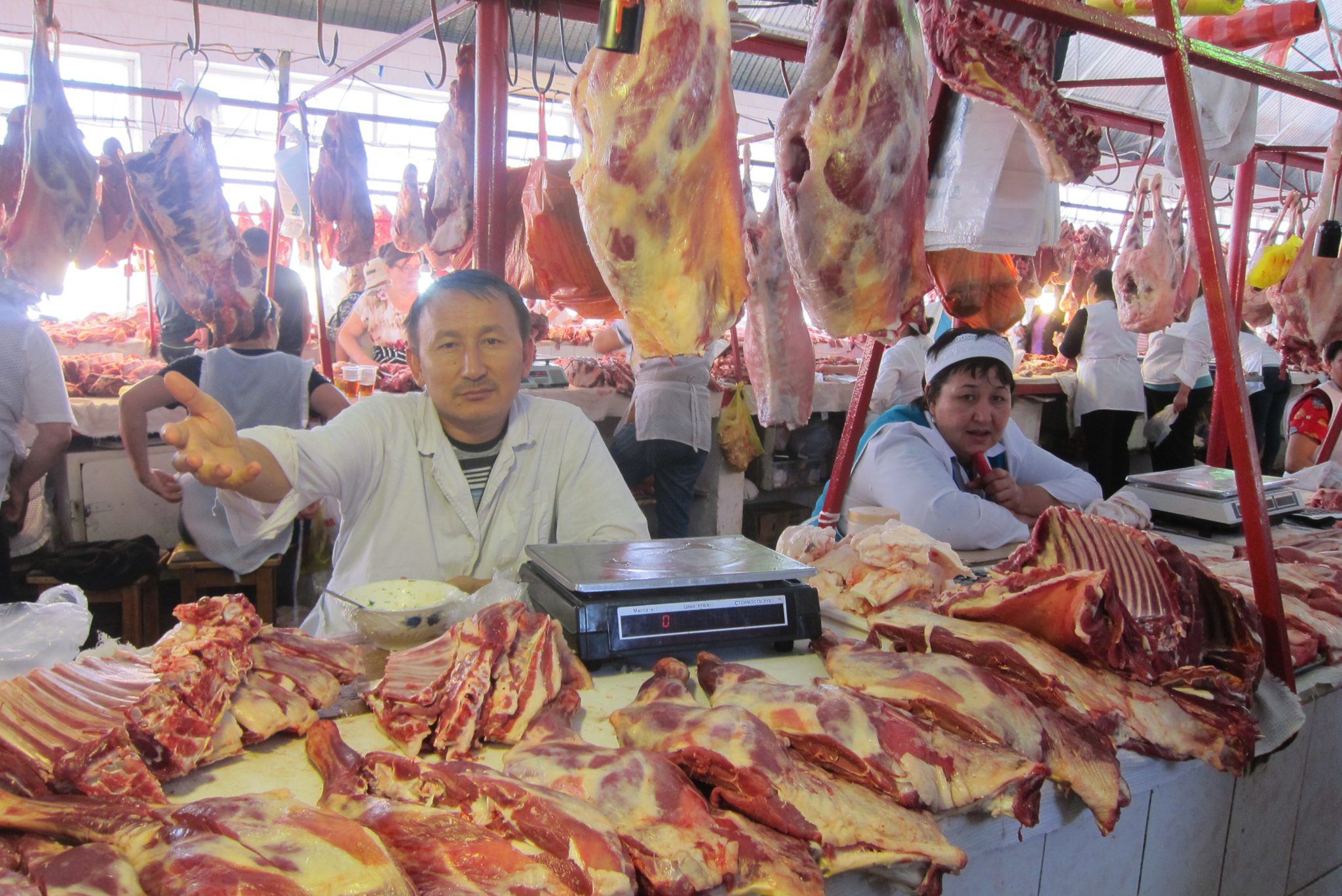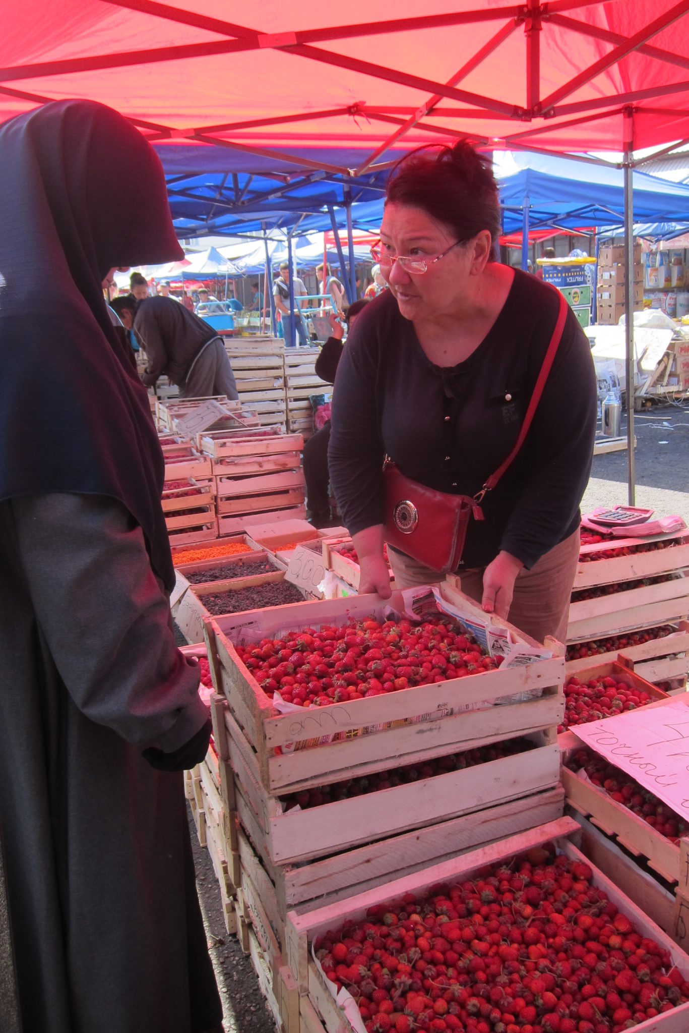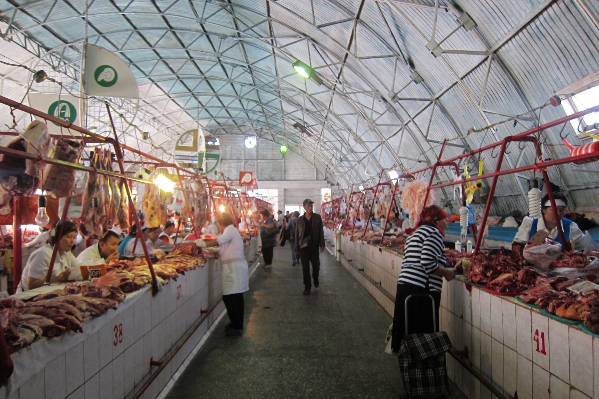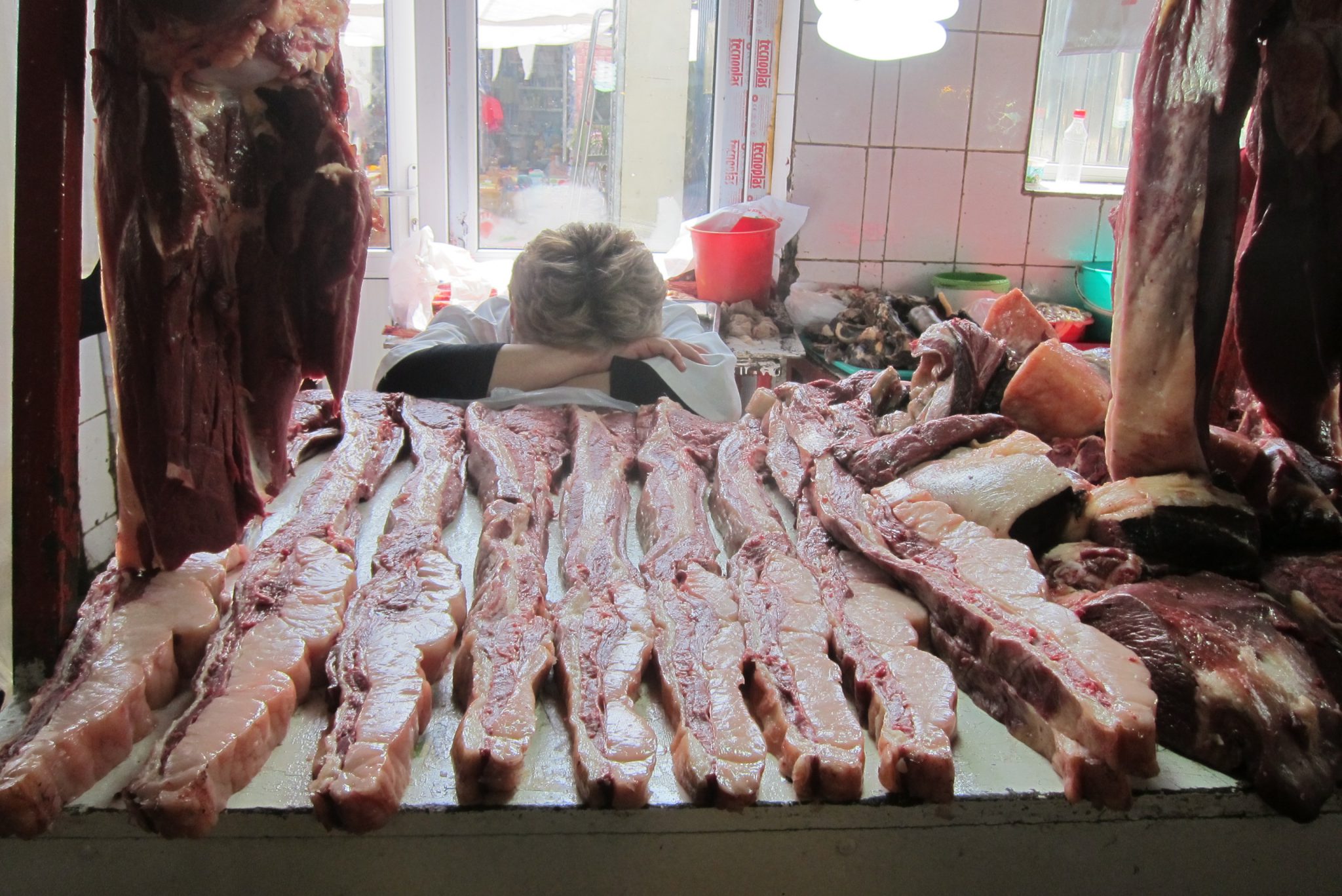 Daudzviet tirgū produkti tiek tirgoti tikai vairumā – avenes un zemenes jāpērk vismaz viena kaste, kurā ir teju 10 kilogrami. Tāpat ir ar āboliem, vīnogām, persikiem un citiem augļiem. Bet vietām tomēr var iegādāties arī pa kilogramam – es sapērku augļu kules, lai tuvākajās dienās būtu ar ko mieloties. Arī Aņa ar mammu iepērkas – somā tiek liktas milzu zaļumu buntes, marinēti salāti un dažādi gaļas produkti. Pastaiga pa gaļas paviljonu šeit ir visiespaidīgākā, jo pamatā tiek tirgota nevis pati gaļa, bet gan tās subprodukti, tai skaitā tādi, kurus pie mums neredz. Kamēr Aņas mamma ar lietpratēja skatienu izvēlas produkciju, es fotografēju pa labi un pa kreisi – gan pašus produktus, gan cilvēkus. Īpaši man acīs iekrīt kāda meitene. Ja pārsvarā pārdevējas ir tādas kārtīgas tirgus sievas, tad šī meitene izskatās kā trausls eņģelis, kas šeit nonācis pārpratuma pēc. Jau rakstīju Tviterī – viņai baletu dejot vai dzeju lasīt piestāvētu. Kad lūdzu atļauju viņu nofotografēt, meitene samulst, bet piekrīt. Kopumā es šeit reti prasu atļauju fotogrāfijām, cilvēkiem patīk, ka viņus bildē. Vairāki gaļas vīri paši uzprasās un lūdz, lai es šos nofotografēju. Par ko ne, to arī daru.
