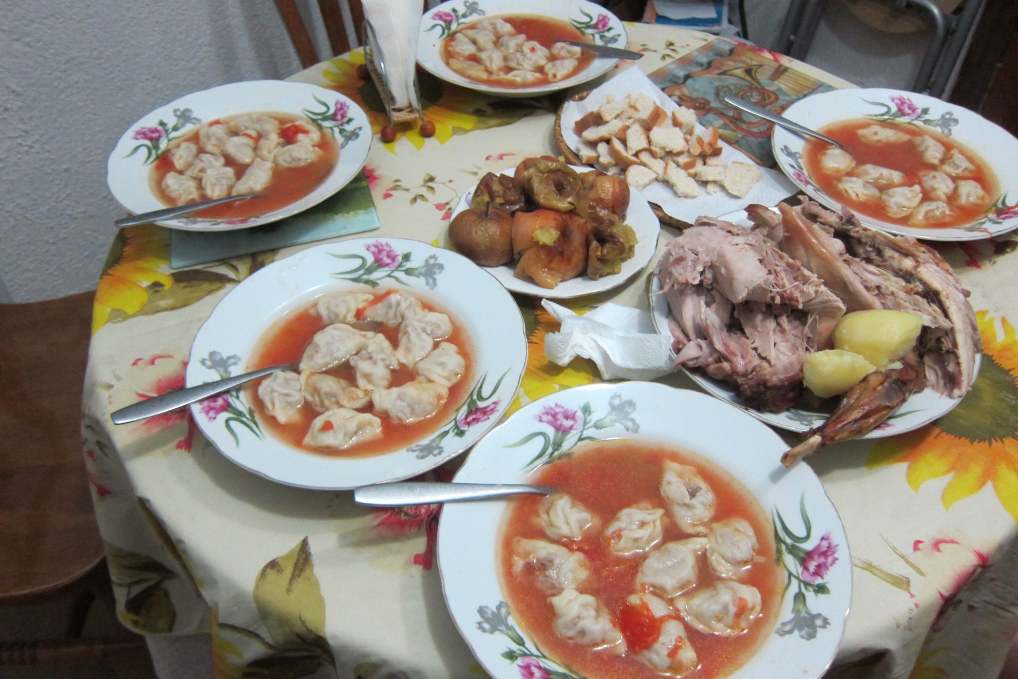 Bet satikušies esam un braucam ciemos pie Aņas vecvecākiem, jo vectēvam šodien ir dzimšanas diena. Ko mēs tur darām? Nekad neuzminēsiet. Ēdam. Sākumā pelmeņu zupu, tad gaļu, tad pašceptus eklērus, ābolkūku, arbūzu. Mani jau brīdināja, ka Stānās jārēķinās ar lielu izēšanos un tā tas arī ir. Un viss ir tik garšīgs – pagaidām Kazahstānā neesmu vēl ēdusi neko, kas man neietu pie dūšas. Vecvecāku mājā pa istabu skraidelē labi audzināts trusis – tas priecīgi laiza visiem kājas un viņa vienīgais niķis ir vadu graušana, tāpēc vienā istabas stūrī šis netiek laists. Un, protams, visu laiku grib tikt tieši tur. Vēl vecmāmiņai ir ievērības cienīgs Botāniskais dārzs gan dārzā, gan istabā – tur ienākas pat kafijas pupiņas. Uz atvadām apskatām milzu trušus, kas dzīvo mājas pagalmā. Tad viss, ko neesam varējuši apēst, tiek mums iestumts līdzi, un varam braukt mājās.