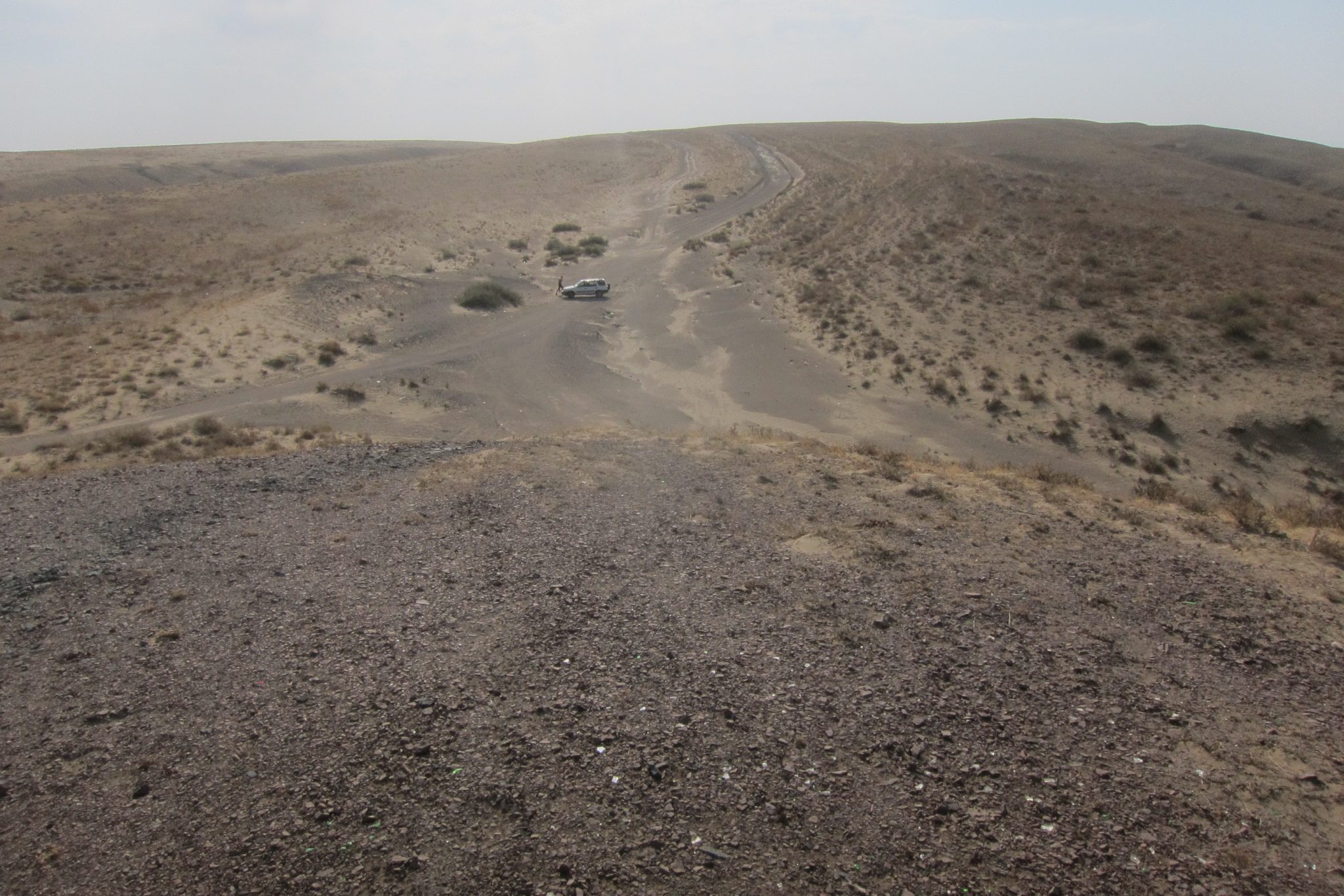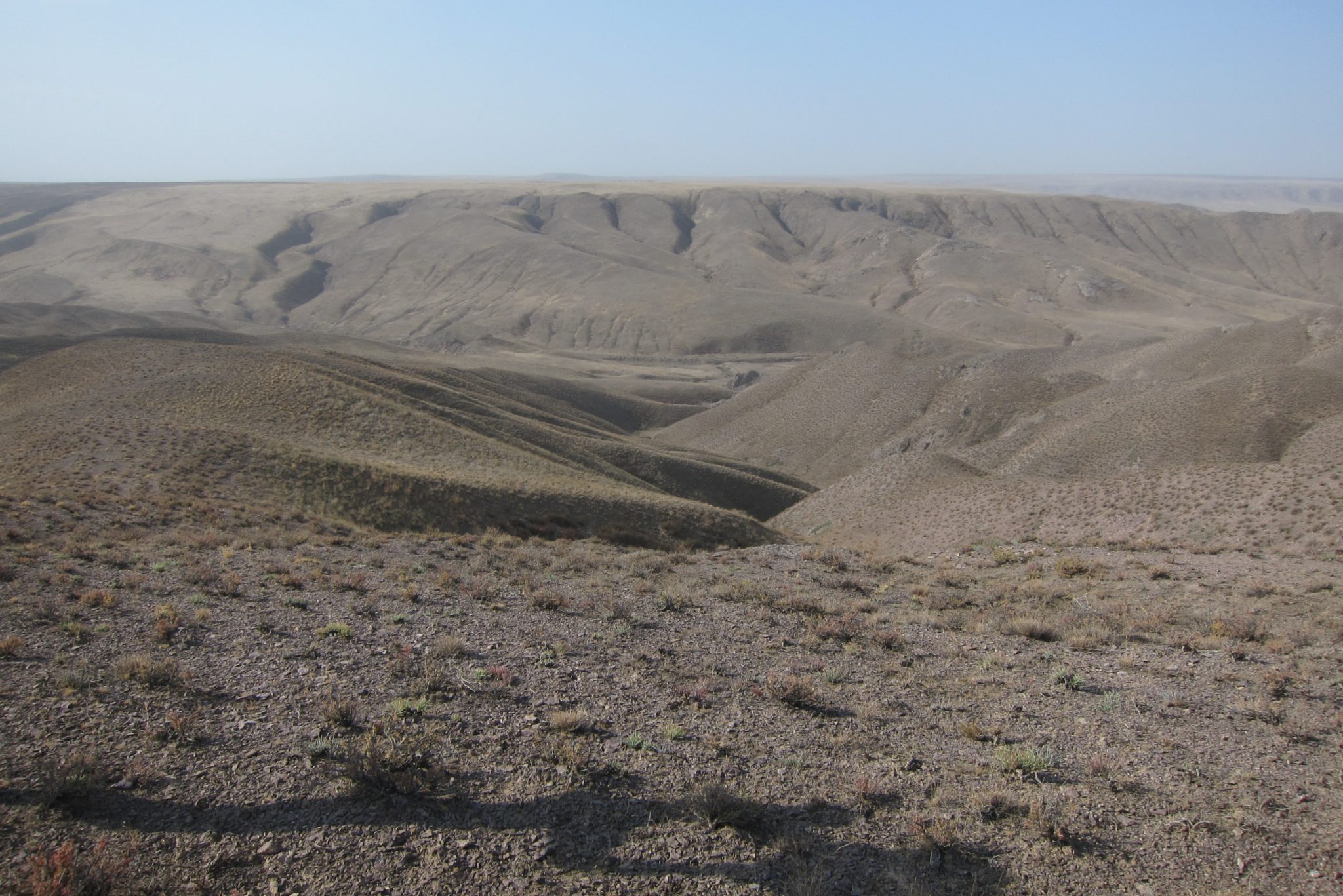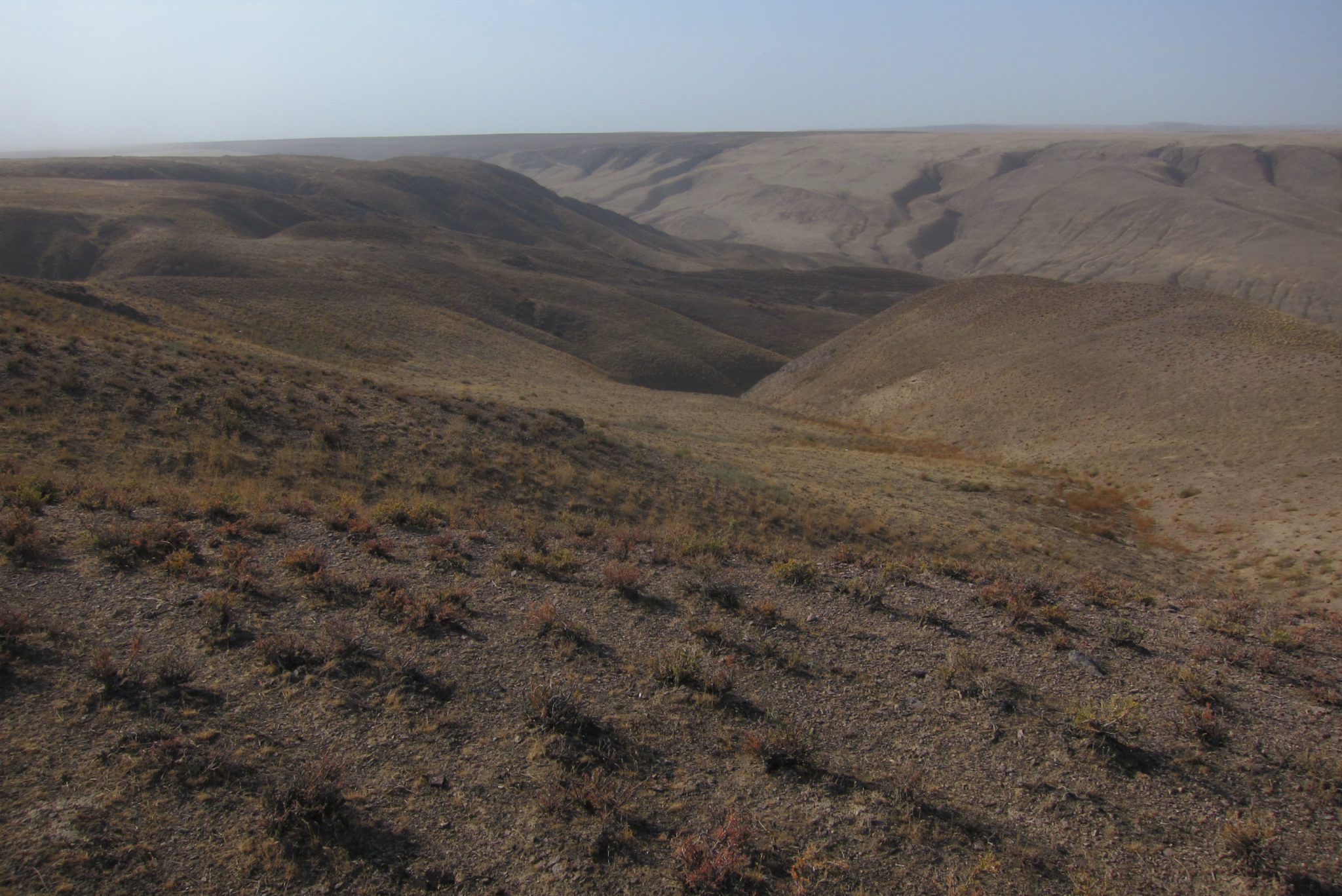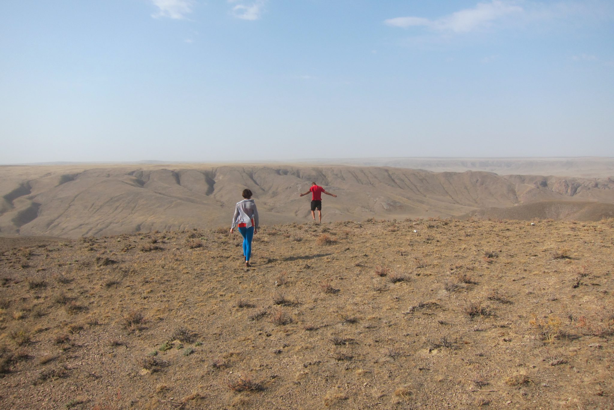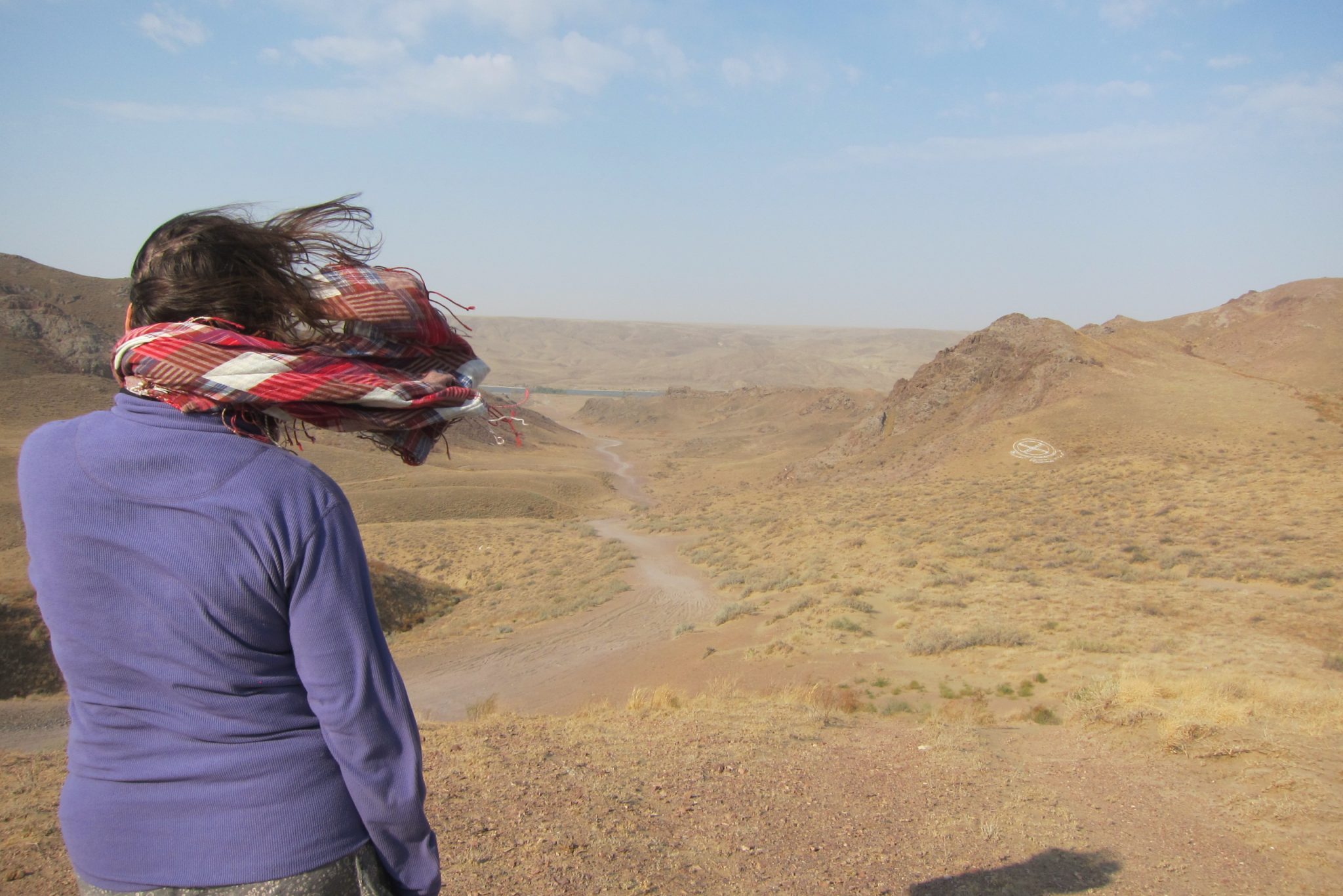 Sarunas un grumbuļainais ceļš mani ir tomēr iemidzinājis un pamostos, kad esam uz vāji pamanāma zemes ceļa stepes vidienē. Aizkratāmies līdz kalna malai, kur sākas stāvs nobrauciens lejup. Eksperti aiziet izpētīt tālāko ceļu. Lēnām iztraušos no mašīnas un man uzreiz aizcērtas elpa. Mežonīgs vējš, kas nes pretī smilšu mākoņus, pārsteidz mani nesagatavotu.