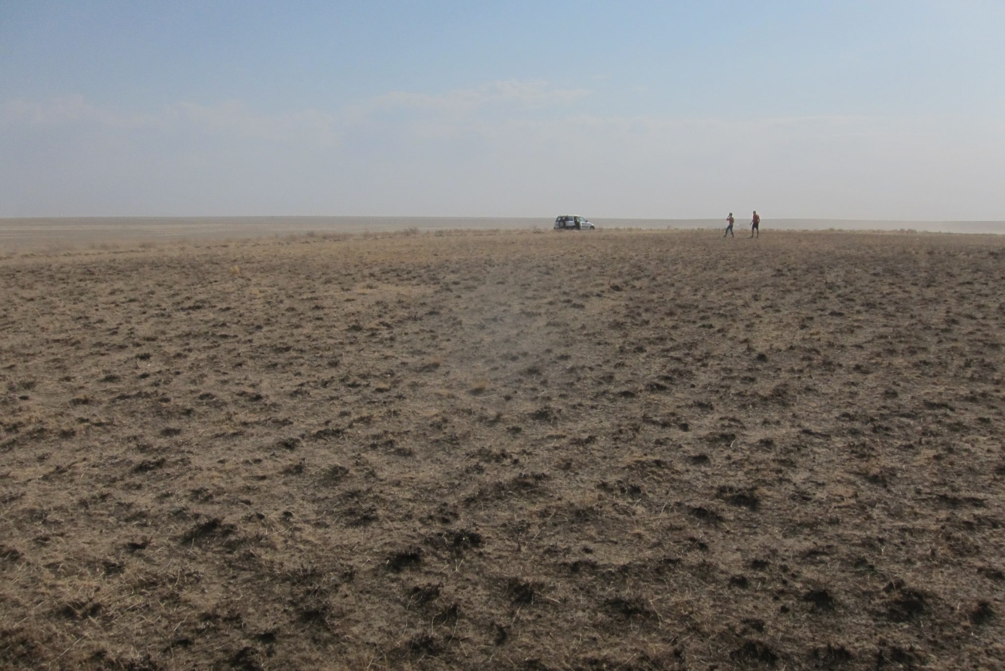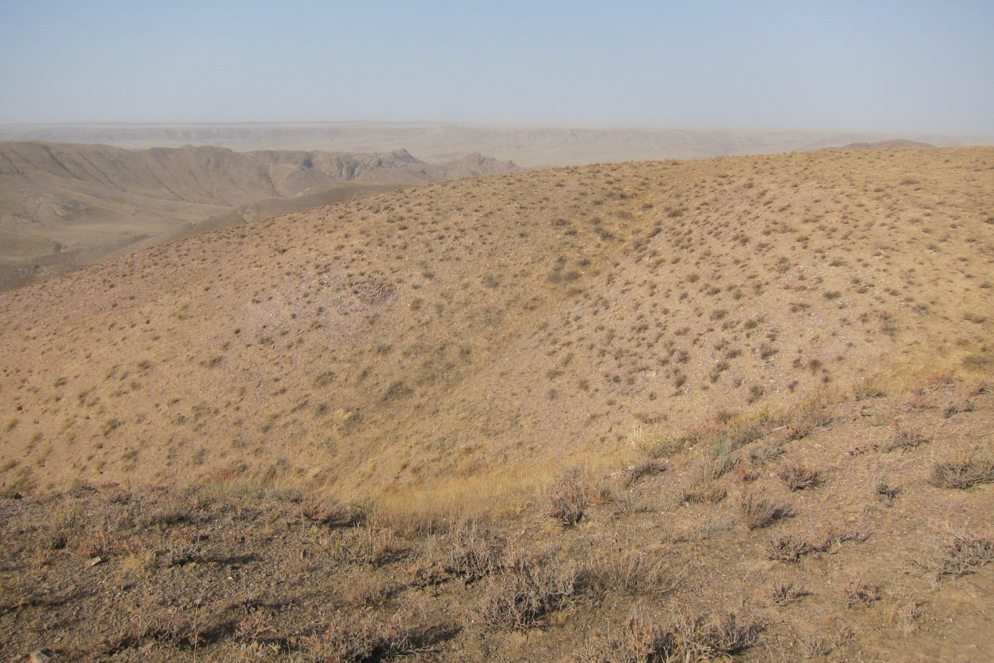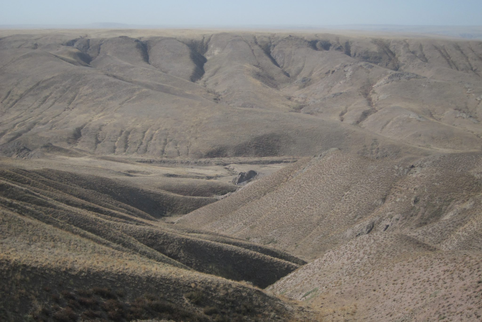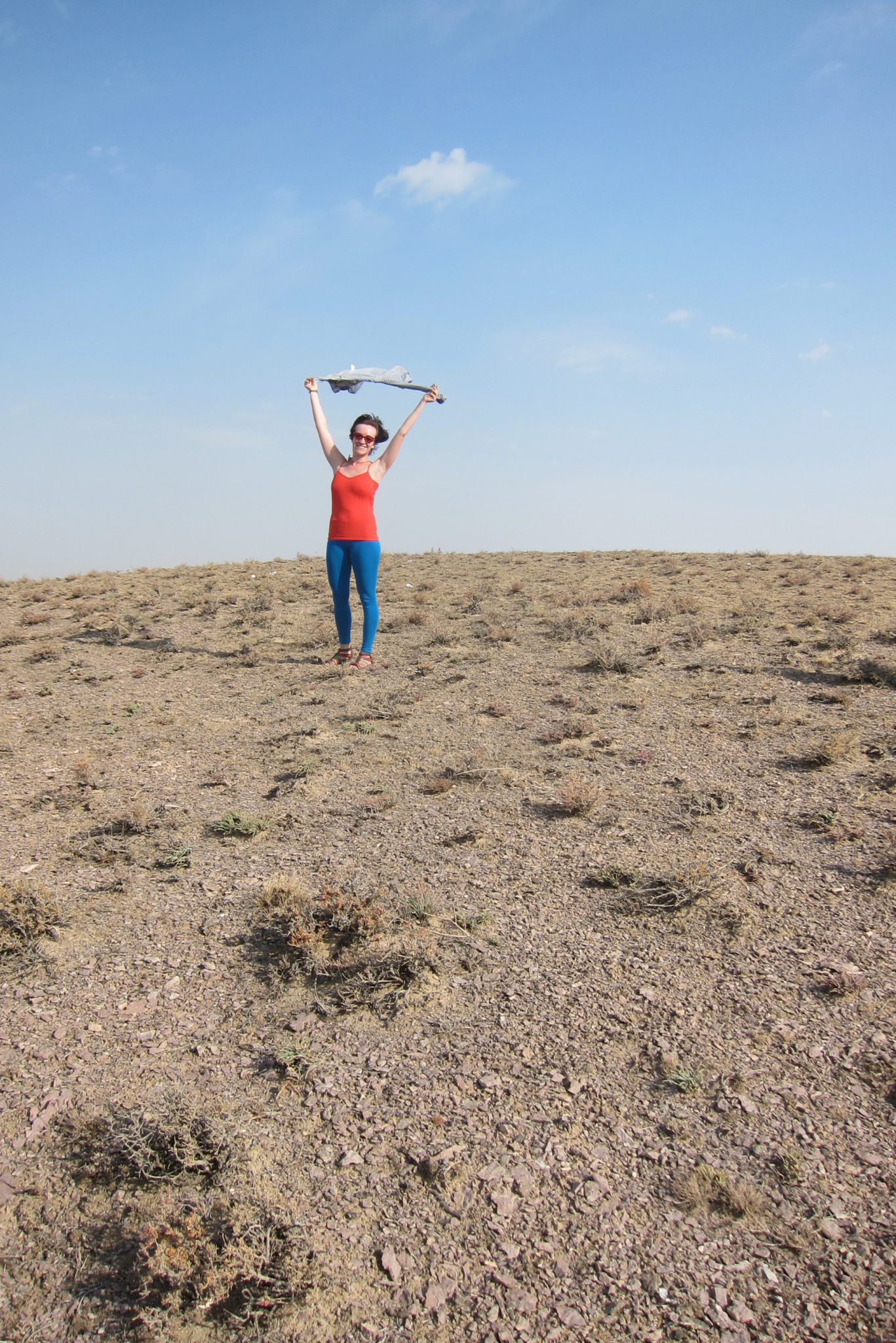 Sarunas un grumbuļainais ceļš mani ir tomēr iemidzinājis un pamostos, kad esam uz vāji pamanāma zemes ceļa stepes vidienē. Aizkratāmies līdz kalna malai, kur sākas stāvs nobrauciens lejup. Eksperti aiziet izpētīt tālāko ceļu. Lēnām iztraušos no mašīnas un man uzreiz aizcērtas elpa. Mežonīgs vējš, kas nes pretī smilšu mākoņus, pārsteidz mani nesagatavotu.