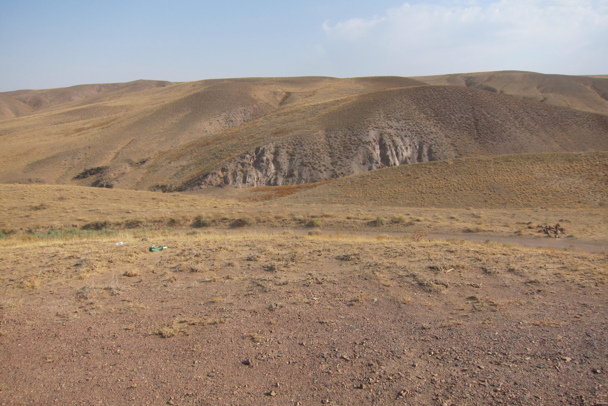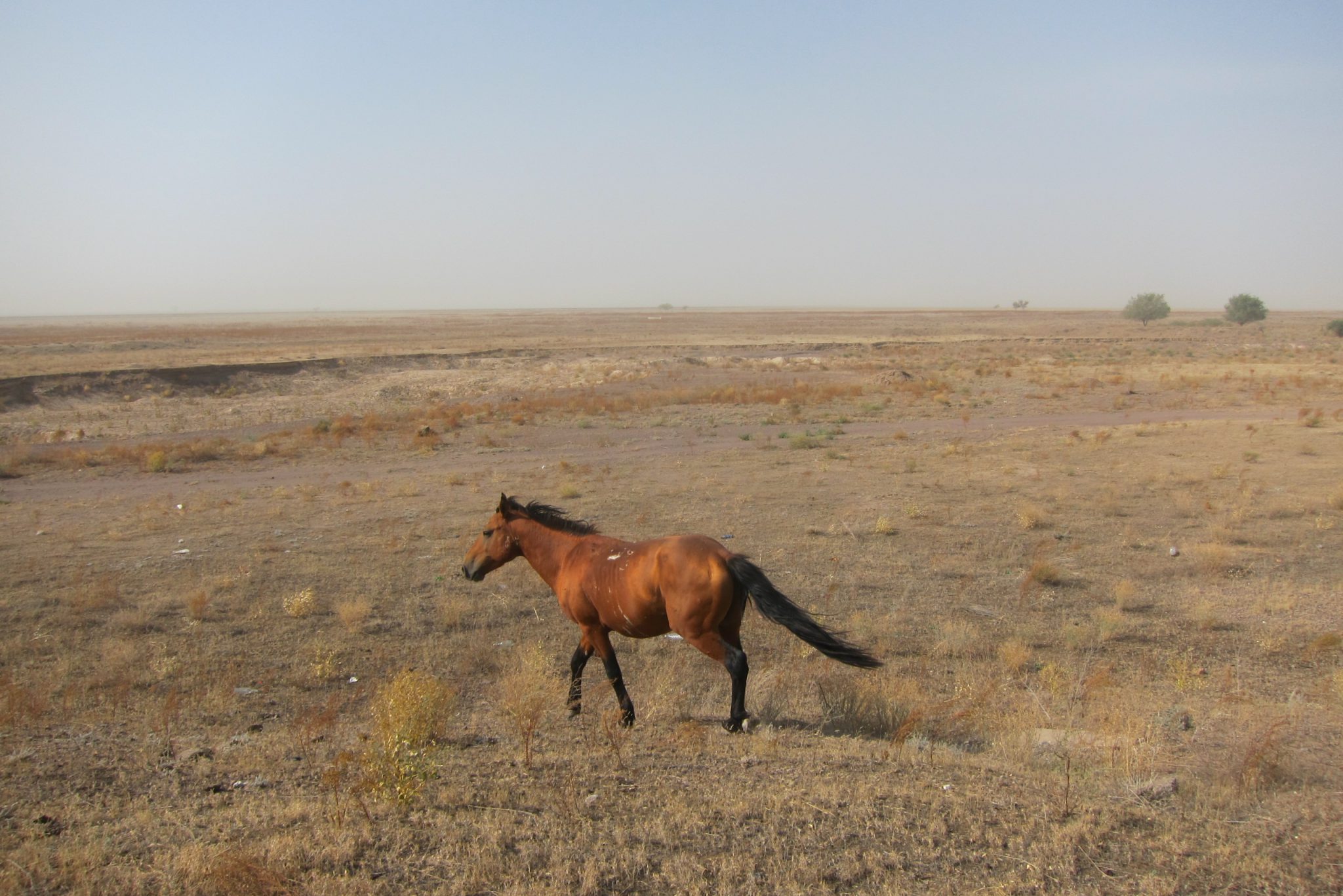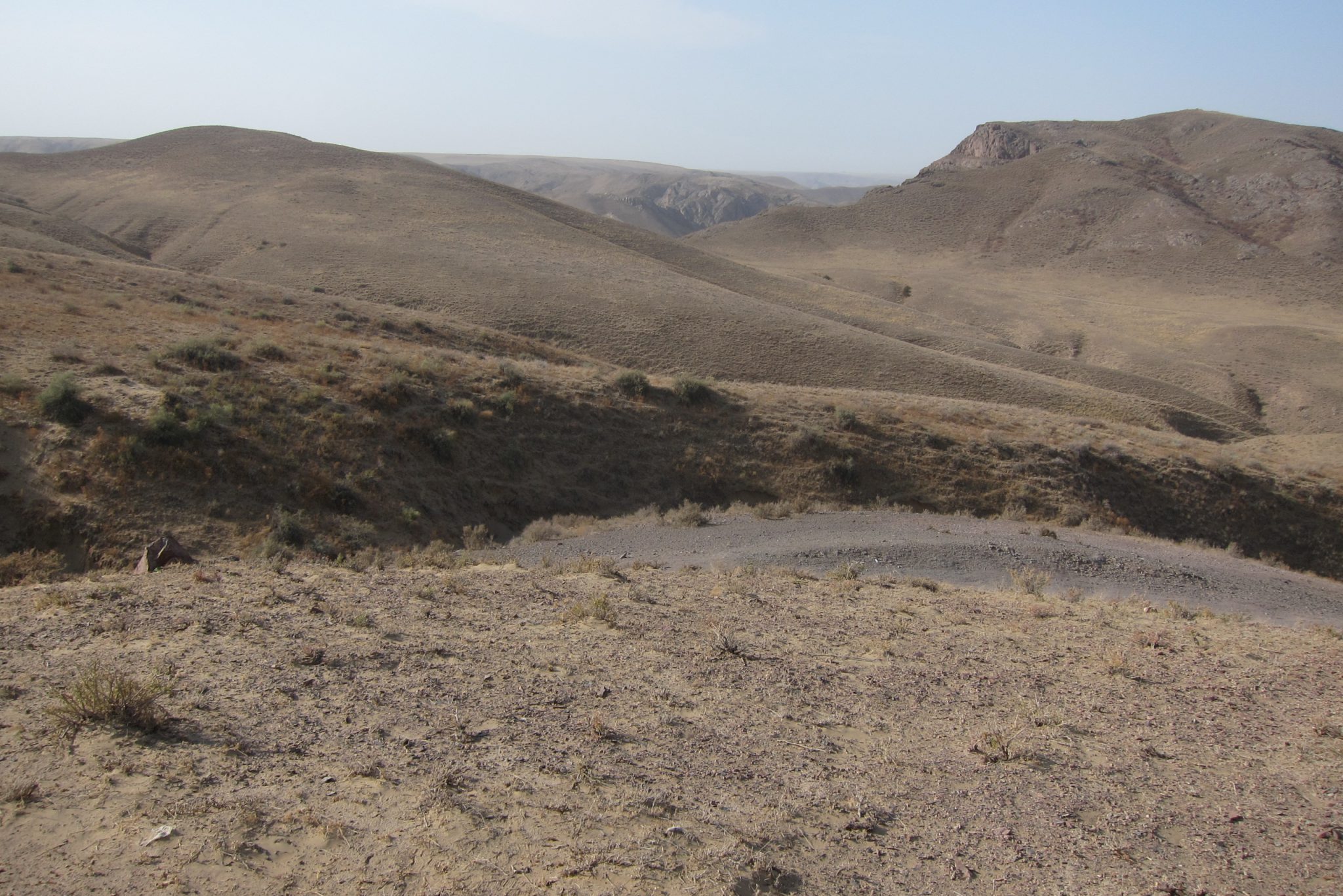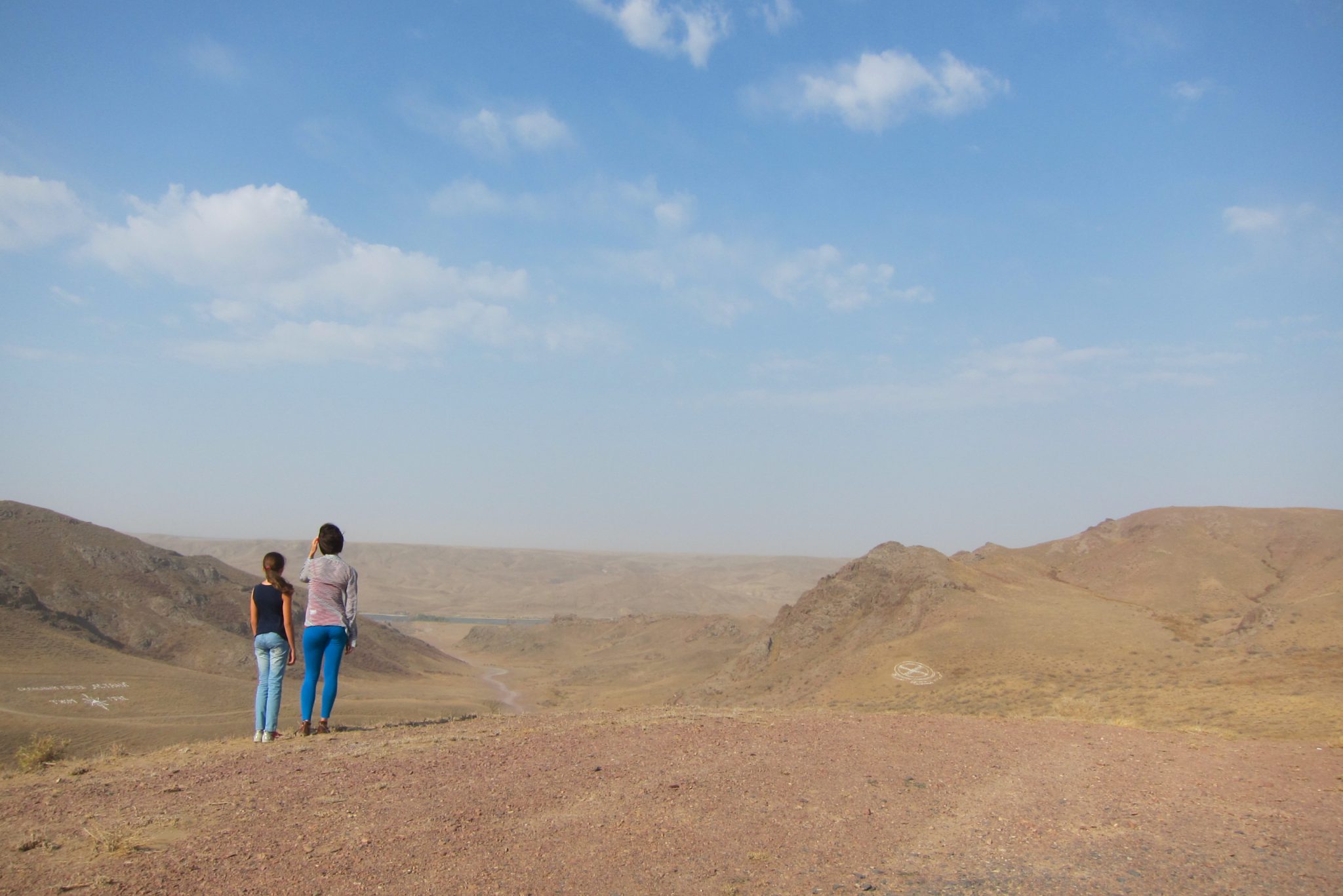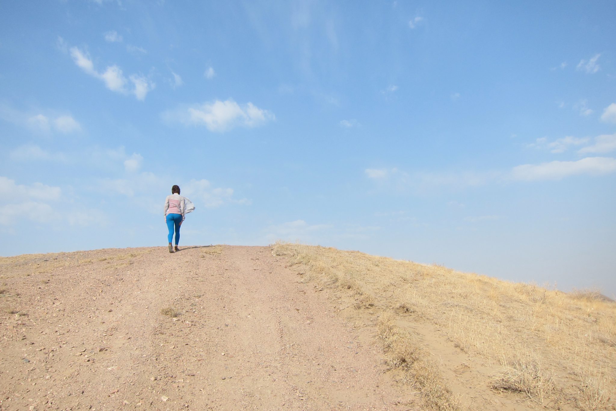 Sarunas un grumbuļainais ceļš mani ir tomēr iemidzinājis un pamostos, kad esam uz vāji pamanāma zemes ceļa stepes vidienē. Aizkratāmies līdz kalna malai, kur sākas stāvs nobrauciens lejup. Eksperti aiziet izpētīt tālāko ceļu. Lēnām iztraušos no mašīnas un man uzreiz aizcērtas elpa. Mežonīgs vējš, kas nes pretī smilšu mākoņus, pārsteidz mani nesagatavotu.