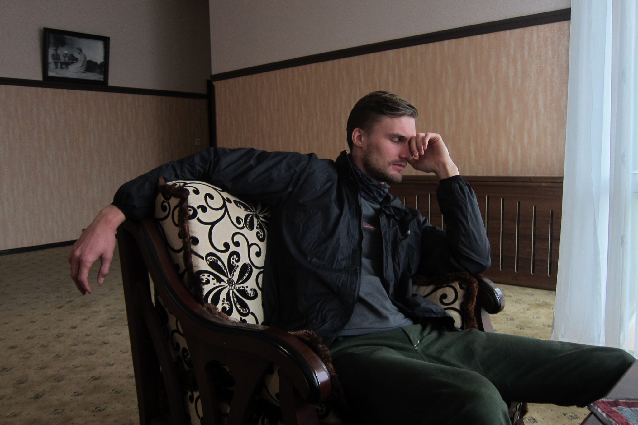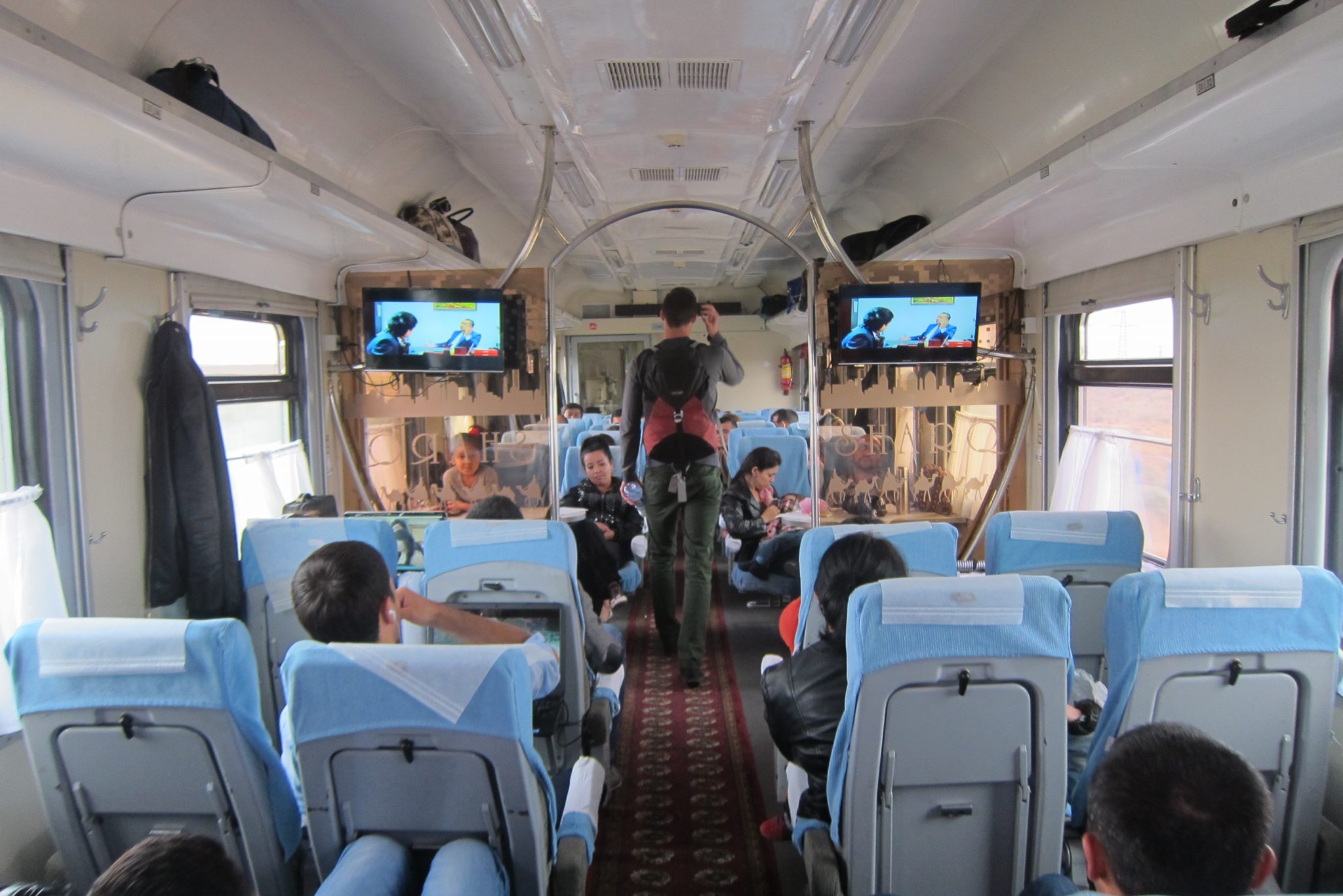 Kolīdz vilciens uzsāk ceļu, dodamies uz restorāna vagonu brokastīs. Lai līdz tam tiktu, jāiziet cauri kādiem pieciem parastajiem vagoniem. Vilciens raustās un šūpojas, tāpēc brīžos, kad jāiet cauri tamburiem, sajūta nav omulīga. Man vēl nekas – jāuzmanās tikai no horizontāliem šķēršļiem, bet Ivaram, kas ir galvas tiesu garāks par mani, arī no vertikāliem. Restorāna vagons gan pagaidām tukšs un kluss, tomēr pēc brīža mums izdodas tikt pie karstas tējas, kafijas un brokastīm – ceptām olām ar sintētiskiem cīsiņiem. Paēduši, līgojam atpakaļ uz savu vagonu un cenšamies mazliet pagulēt. Par veselīgu miegu to nenosauksi, bet kā nebūt pasnaužam.