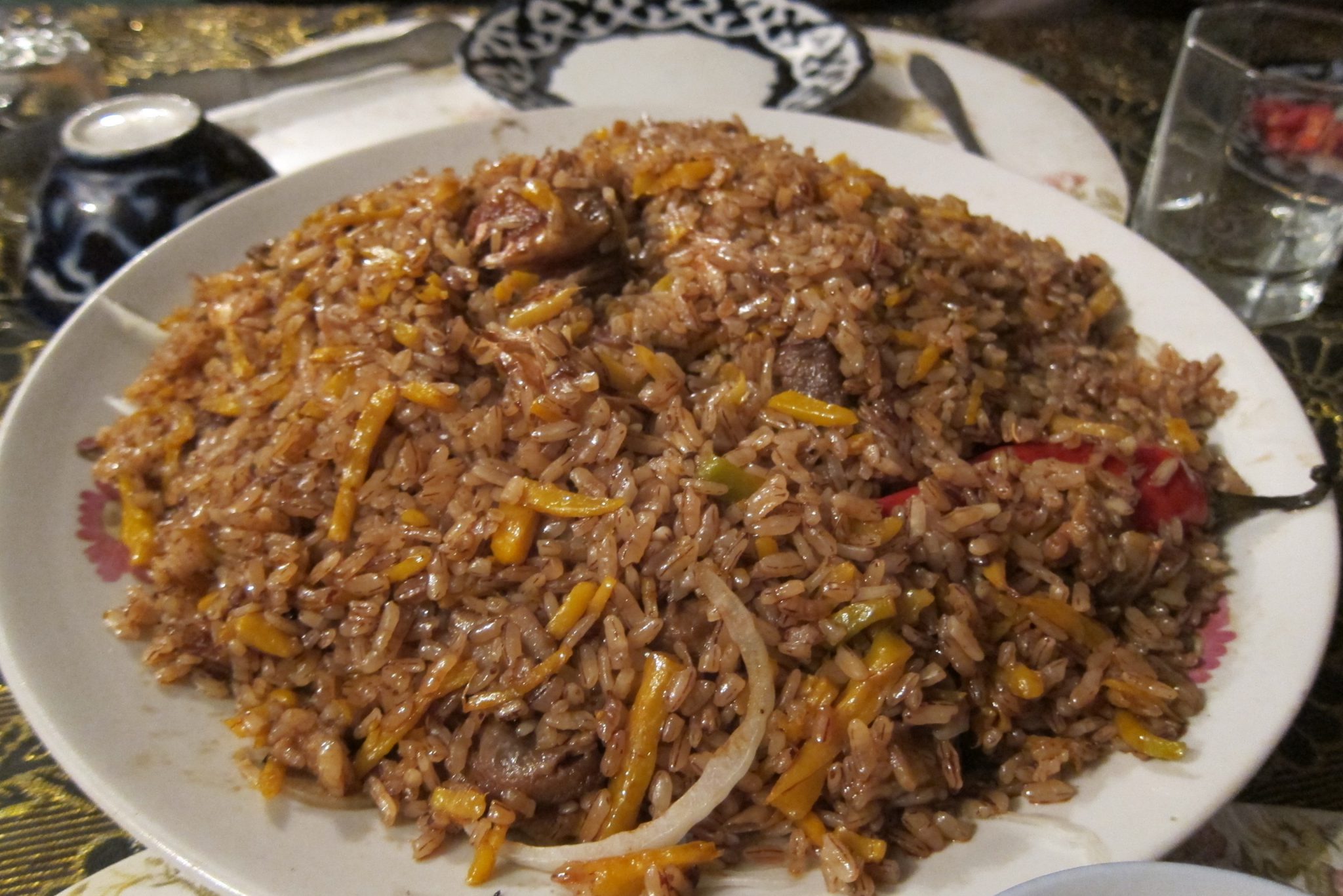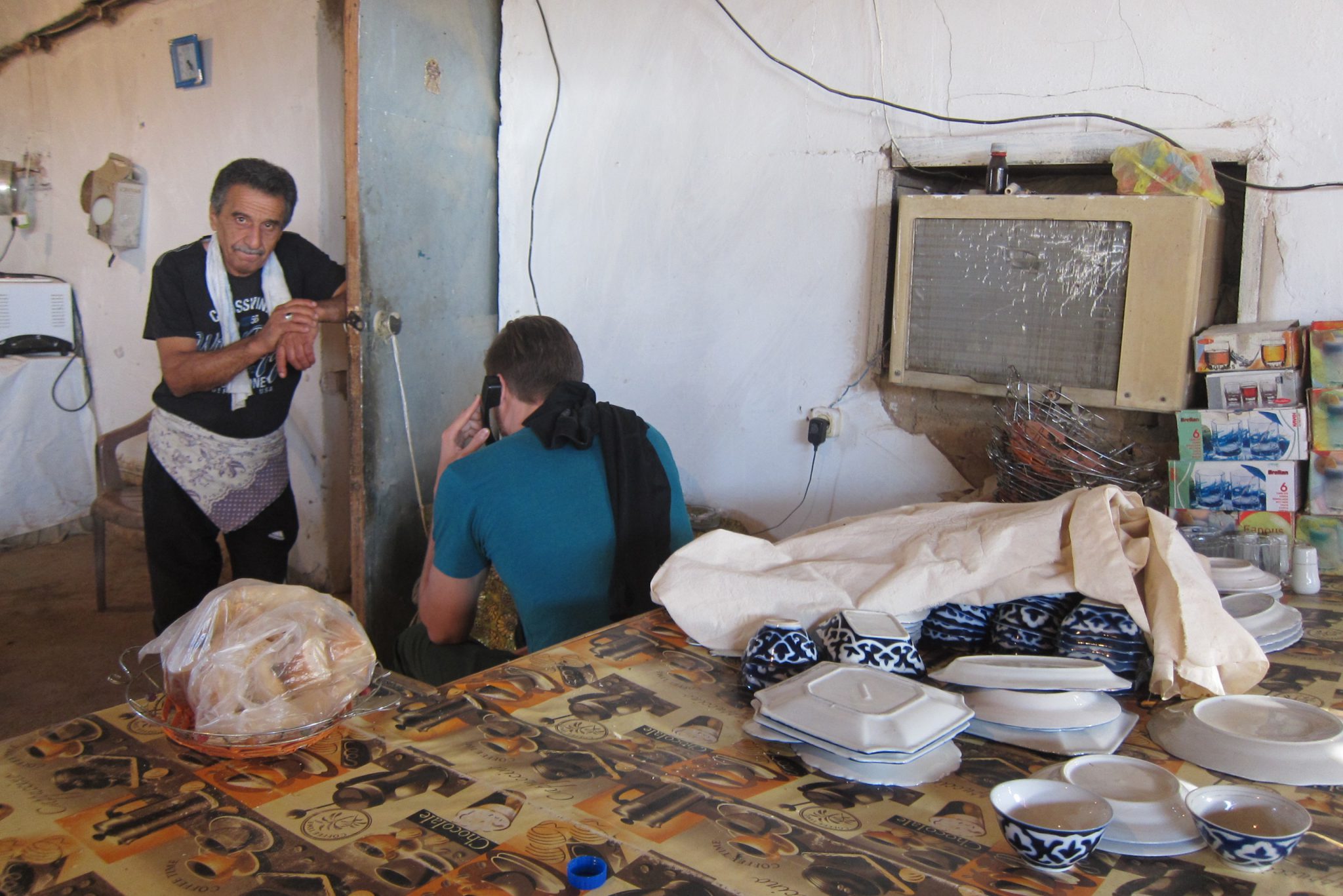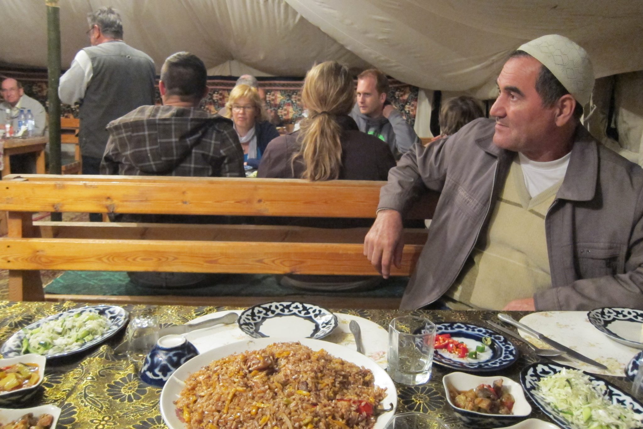 Pasūtām zaļo tēju un samsu. Tos atnes runātīga sieva un, uzzinājusi, ka esam no Latvijas, uzskata par savu pienākumu divos teikumos izklāstīt savas brāļa sievas, kas esot no Igaunijas, dzīvesstāstu. Iemīlējās uzbekā, apprecējās. Četrus bērnus uzaudzināja. Vispār piedzima seši, bet divi nomira. Viņa ģērbās biksēs un viņai bija spēks lielajā krāsnī mīklas plāceņu mest un ļepjoškas izcept. Tad izšķīrās un ar visiem bērniem aizbrauca atpakaļ uz Igauniju. Vot tak.