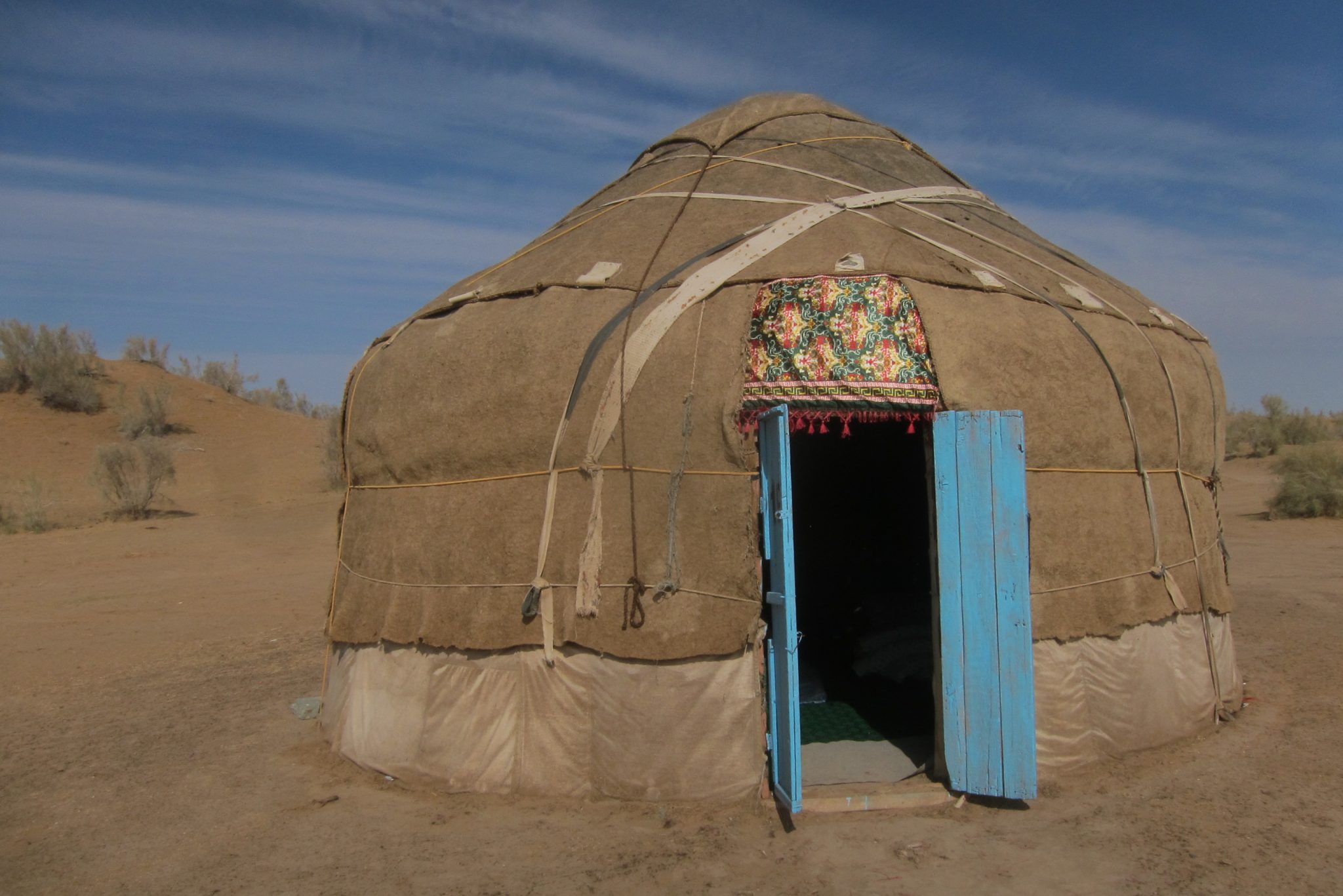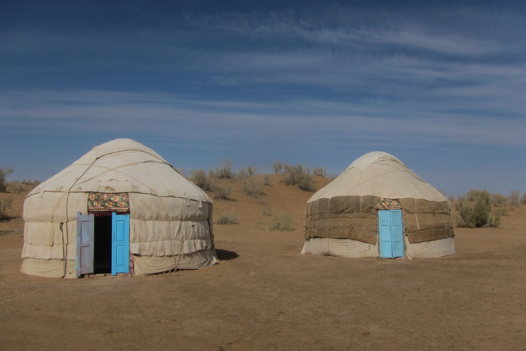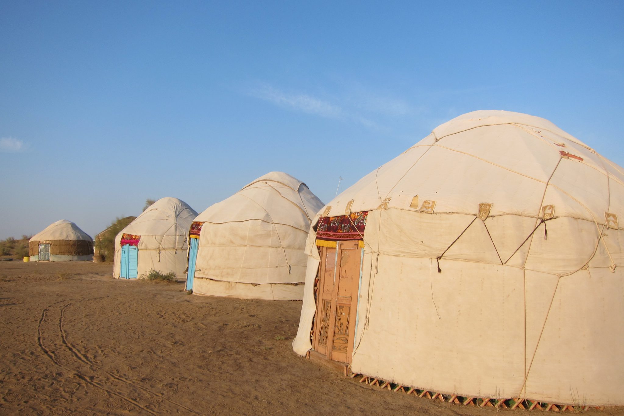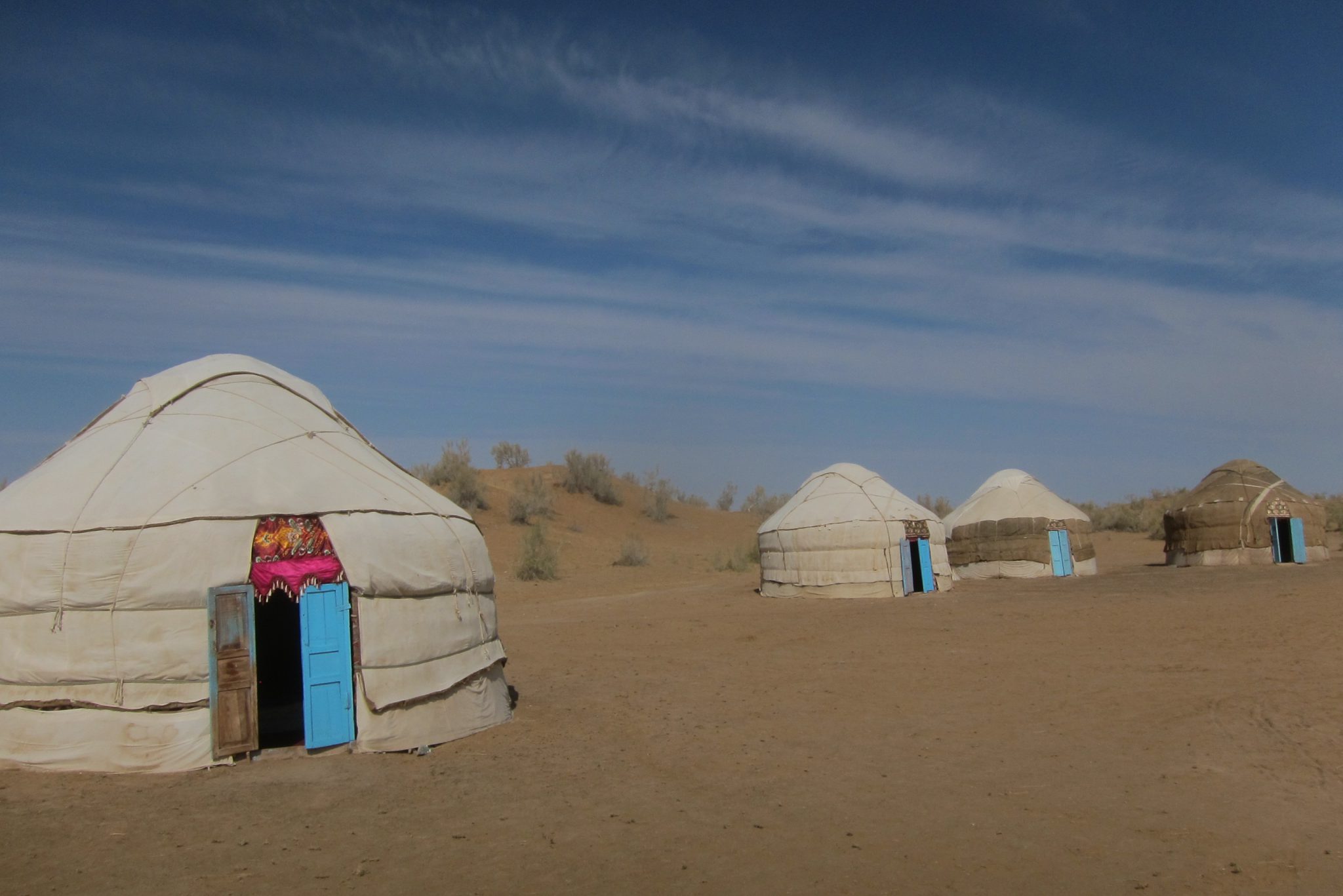 Šādi kratāmies pa vientuļo šoseju līdz kādam krustojumam, kur ieraugām cerīgu ceļa norādi “Aidar yurt camp”. Tomēr mūsu intelektuālis griež uz otru pusi un prasa kādam krieviski runājošam pārim ceļu uz starptautisku viesnīcu. Jēziņ. Es paralēli jautāju šiem, vai tā jurtu nometne ir tālu. Nē, tepat vien esot. Šoferis vēl brīdi stīvējas, ka nezinot ceļu, bet mēs viņam liekam braukt tieši turp. Jurtu nometne ir redzama jau no ceļa un drīz piestājam pie pašas nometnes durvīm. Mūs mazliet skumdina, ka šeit jau priekšā stāv lielais tūristu autobuss, bet nu štrunts – jurtas šeit ir un tas ir galvenais.