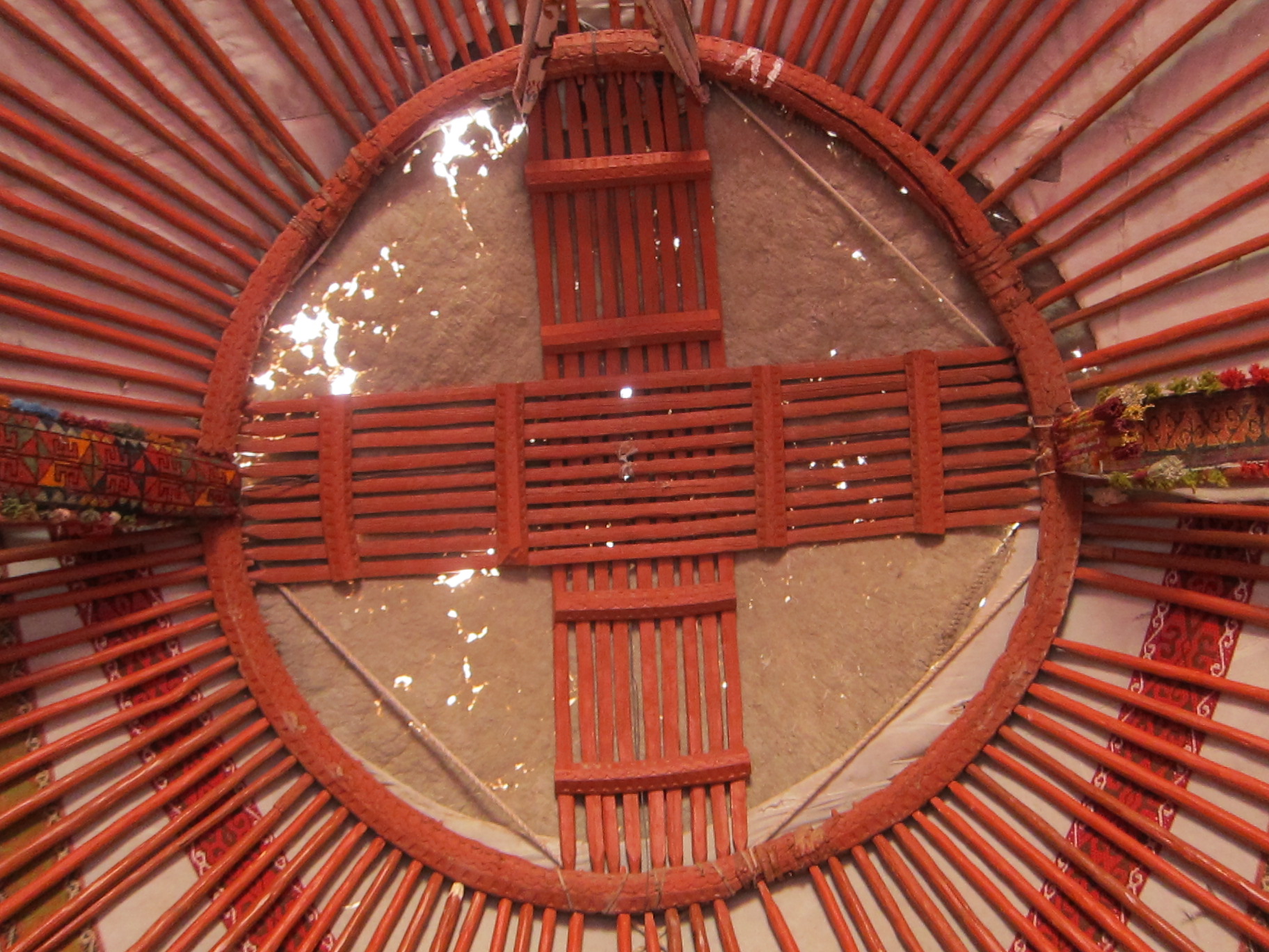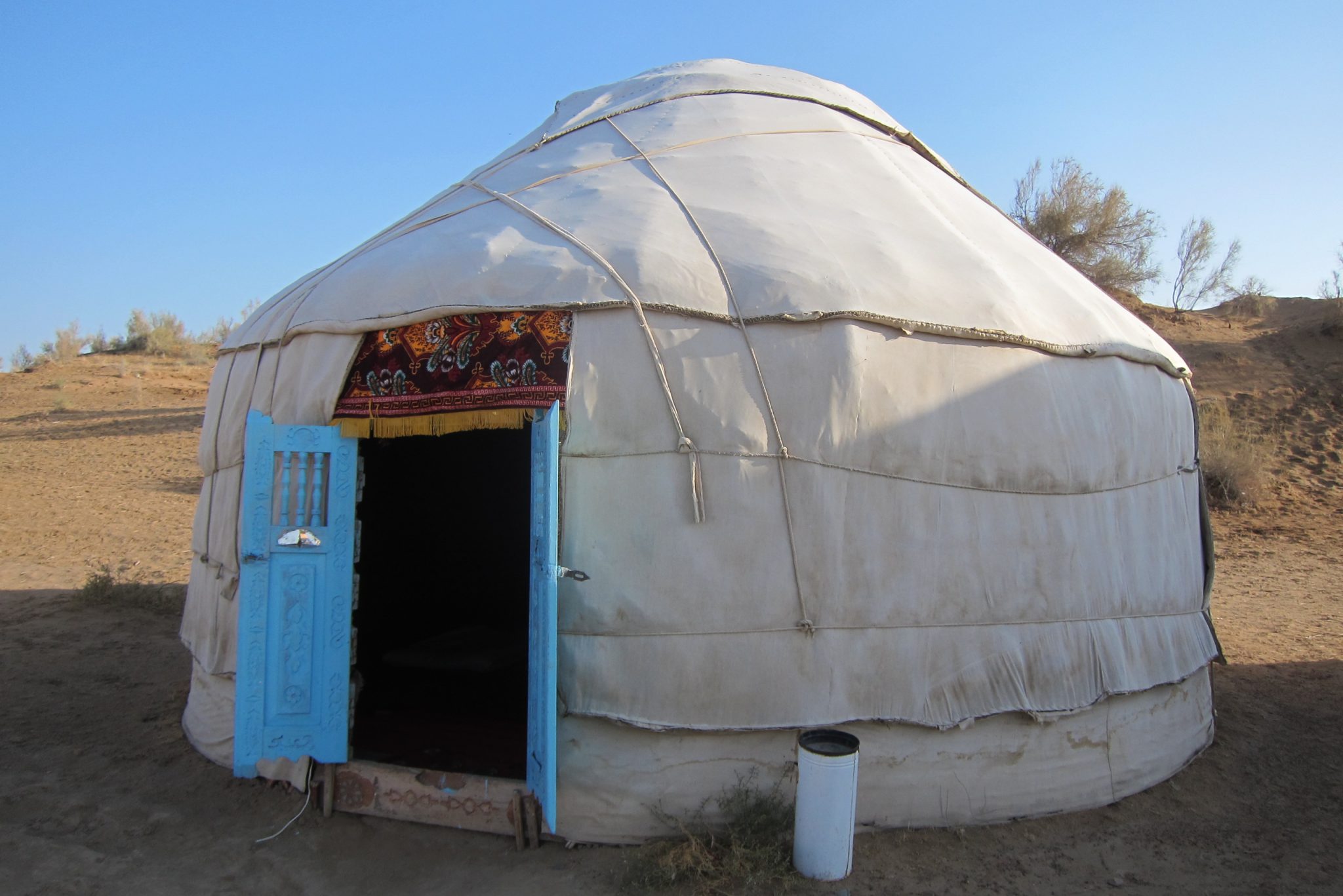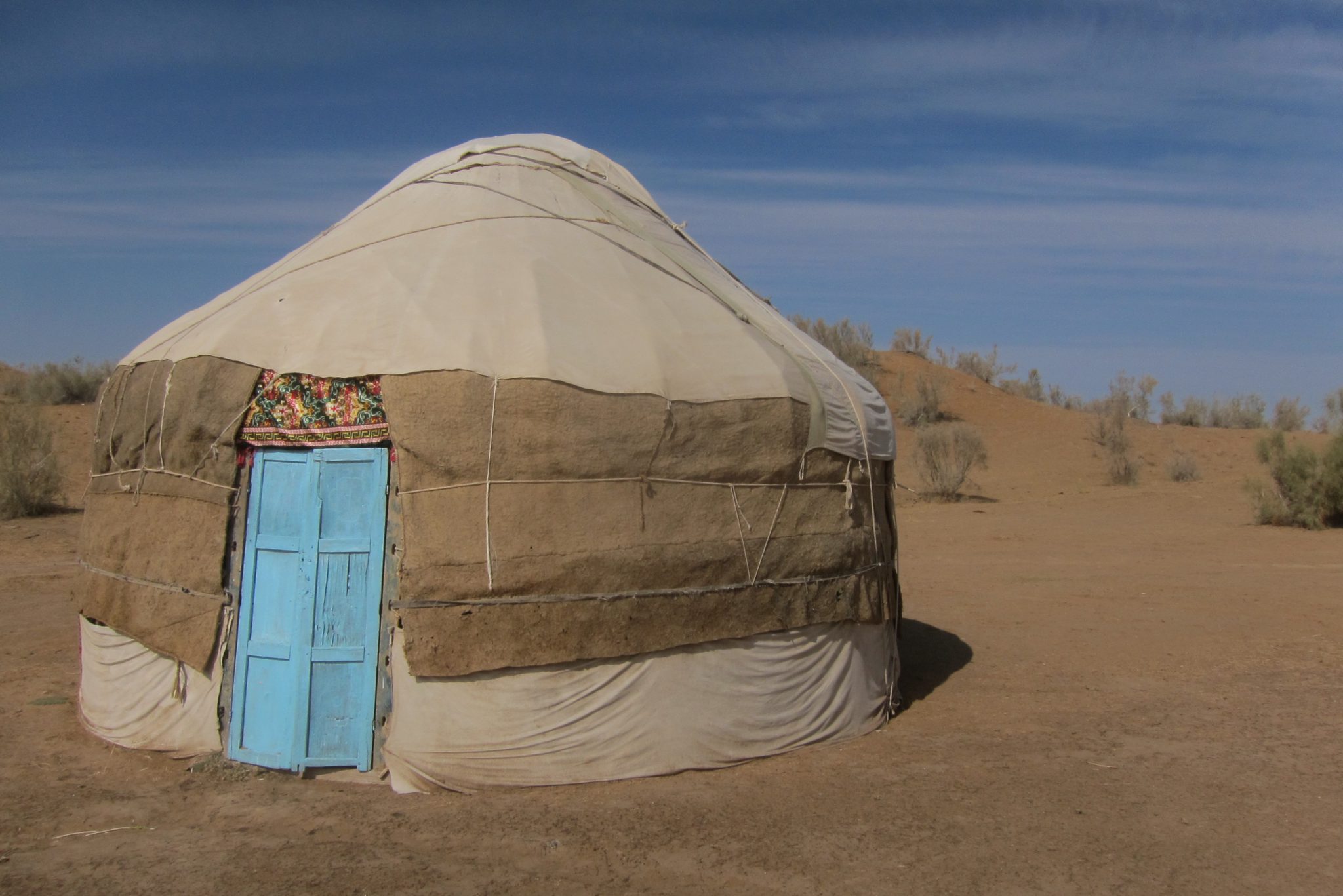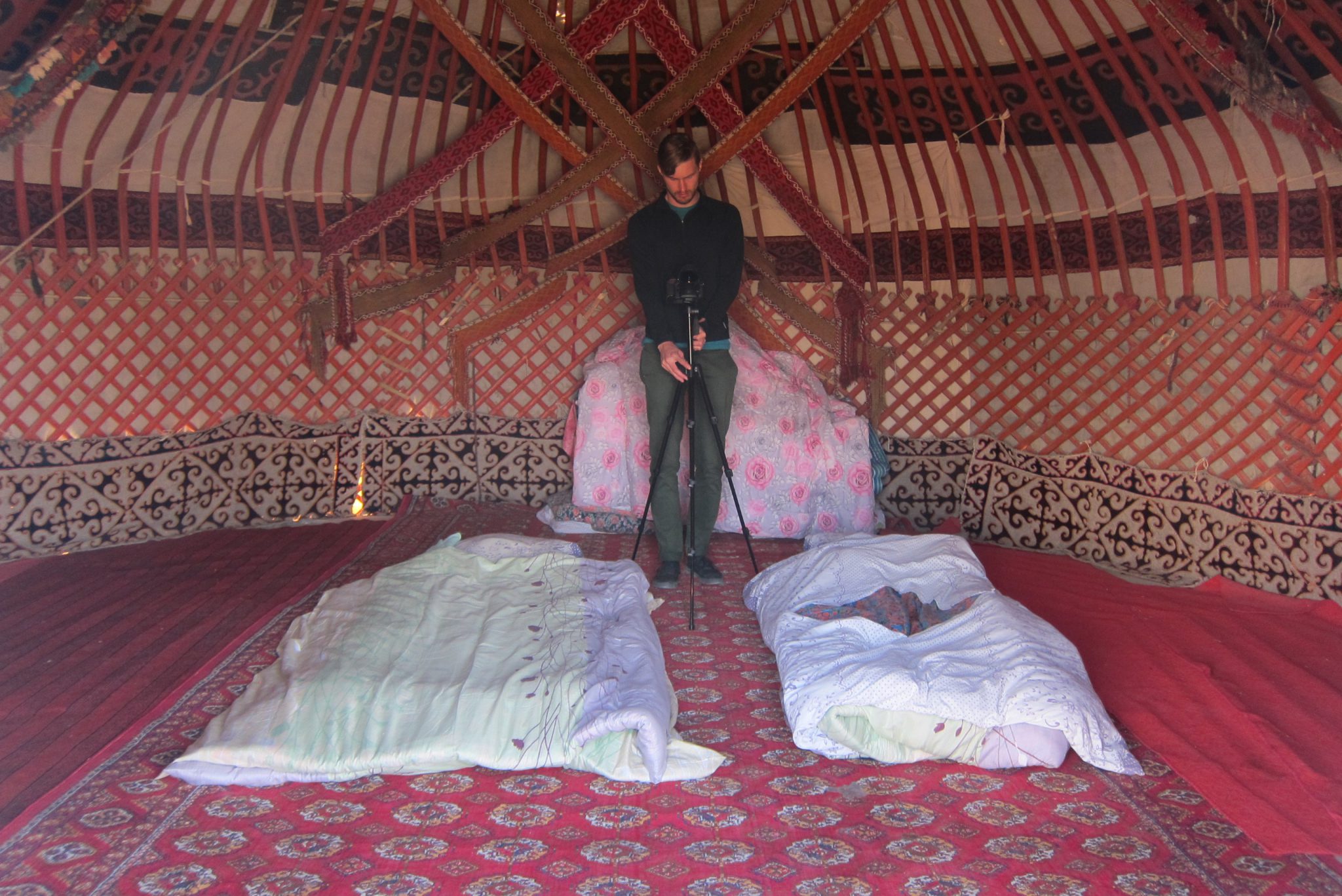 Šādi kratāmies pa vientuļo šoseju līdz kādam krustojumam, kur ieraugām cerīgu ceļa norādi “Aidar yurt camp”. Tomēr mūsu intelektuālis griež uz otru pusi un prasa kādam krieviski runājošam pārim ceļu uz starptautisku viesnīcu. Jēziņ. Es paralēli jautāju šiem, vai tā jurtu nometne ir tālu. Nē, tepat vien esot. Šoferis vēl brīdi stīvējas, ka nezinot ceļu, bet mēs viņam liekam braukt tieši turp. Jurtu nometne ir redzama jau no ceļa un drīz piestājam pie pašas nometnes durvīm. Mūs mazliet skumdina, ka šeit jau priekšā stāv lielais tūristu autobuss, bet nu štrunts – jurtas šeit ir un tas ir galvenais.
