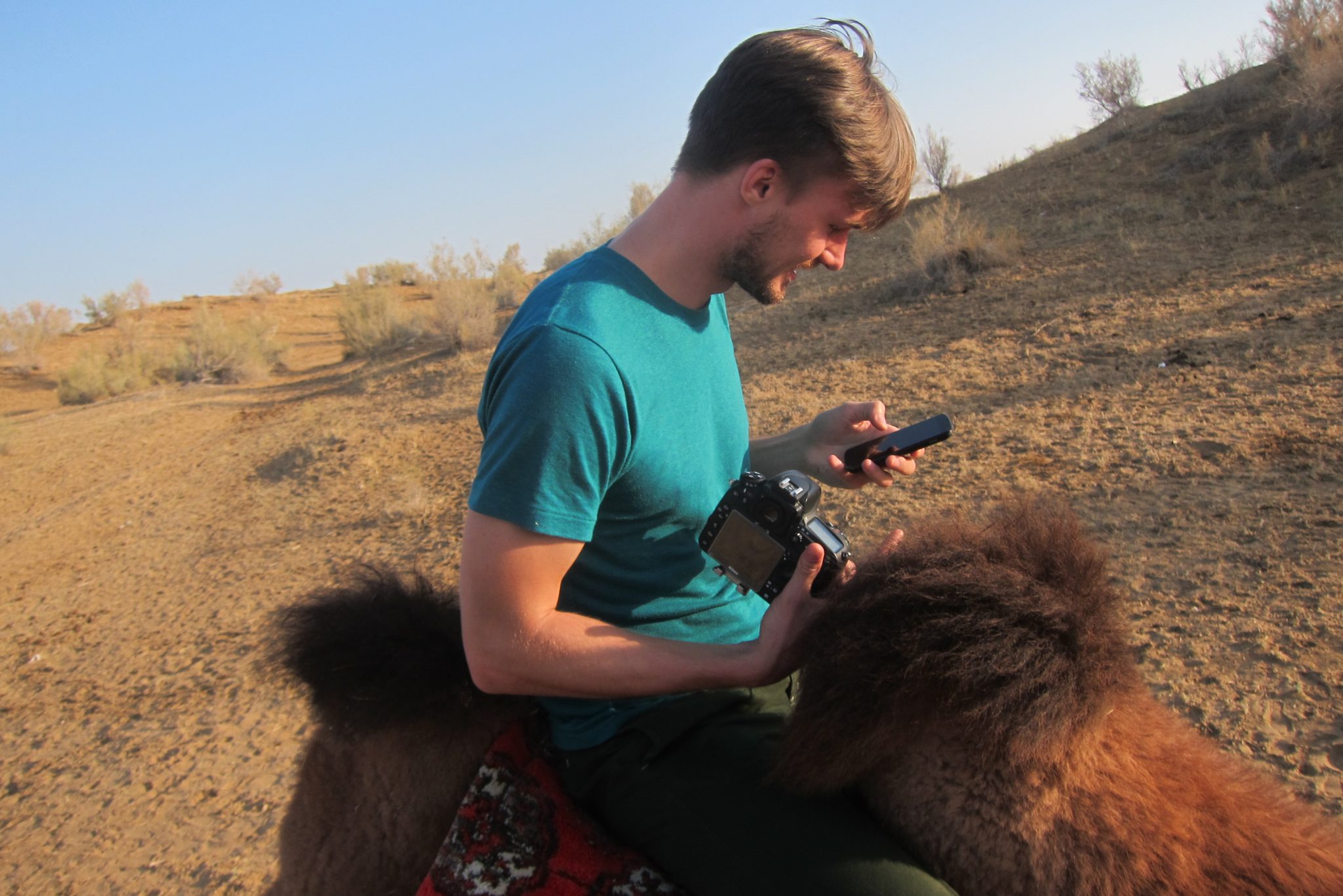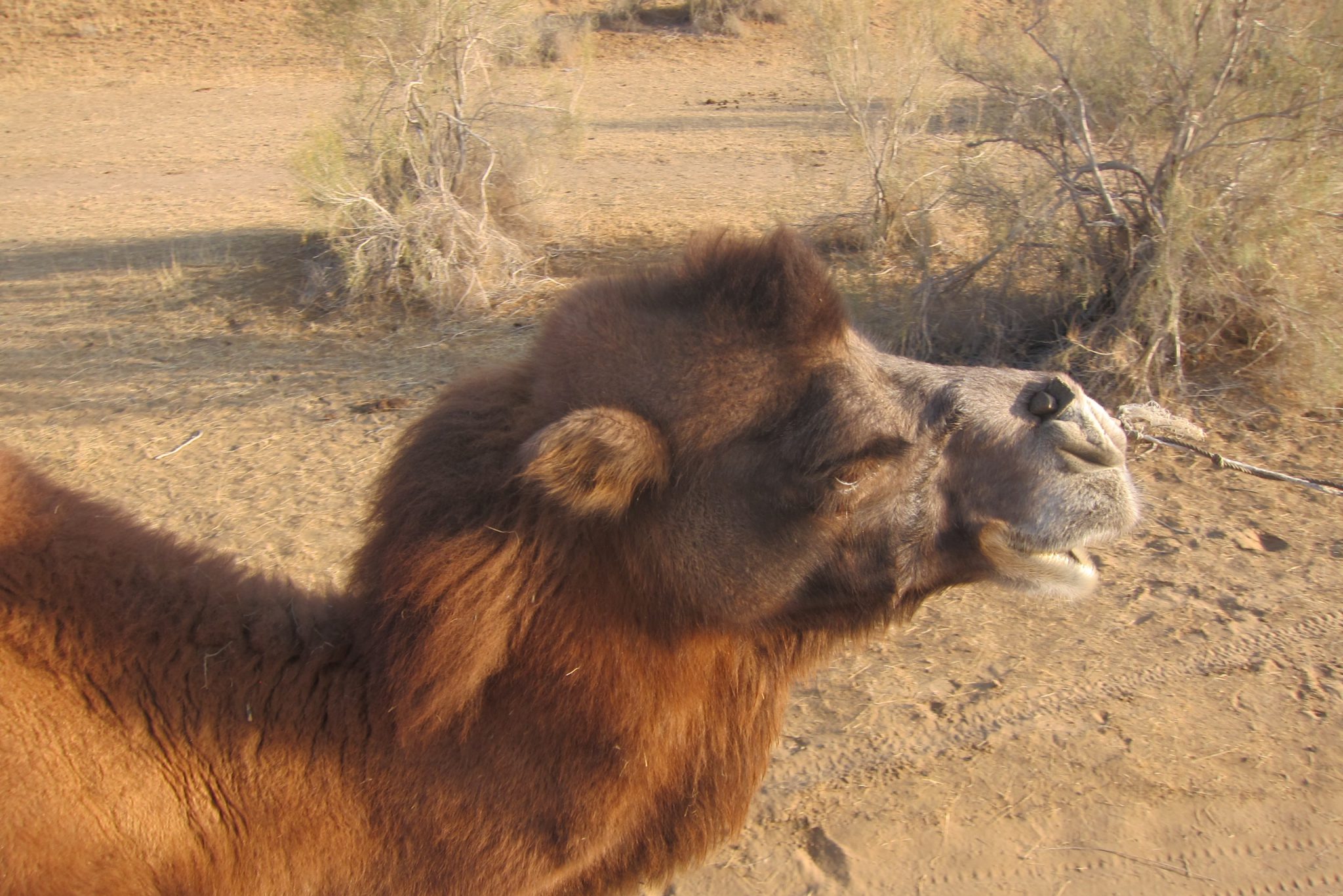 Tomēr no šī brīža mums sāk patikt dzīve. Jurta ir ļoti mājīga. Nolikuši somas, dodamies pie kamieļiem. Mēs kopumā neesam tādu izteikti tūristisku atrakciju cienītāji, bet dzīvnieki izskatās gana kopti un veselīgi – lai iet, mēģināsim pajāt. Grūtākais visā procesā ir uzkāpšana un nokāpšana, bet pati rāmā izjāde ir tīrais prieks. Starp diviem kupriem var sēdēt kā uz Harley Davidson – ērti un droši. Katrā ziņā uz zirga sajūta ir nestabilāka. Izmetam nelielu lociņu pa stepi, safocēšamies kopā un sataisām pašiņus. Tad laižam kamieļus brīvsolī un dodamies garākā pastaigā ar pašu kājām. Mūs brīdina rūpīgi sekot, kurp iesim – jau aiz pāris pauguriem jurtas neredz un stepe visur izskatās vienāda.