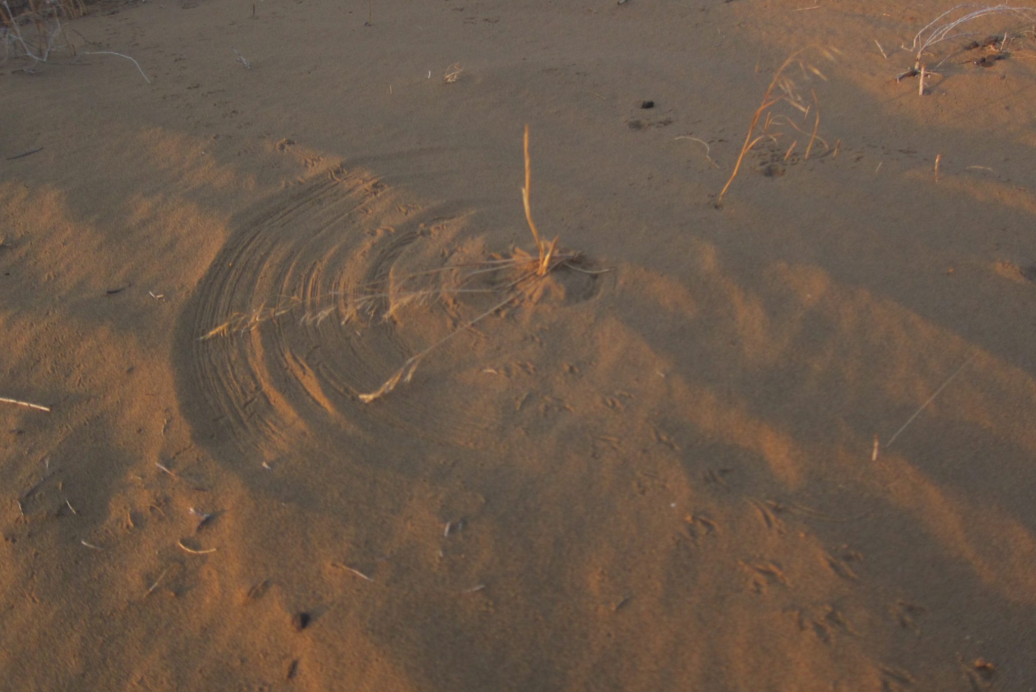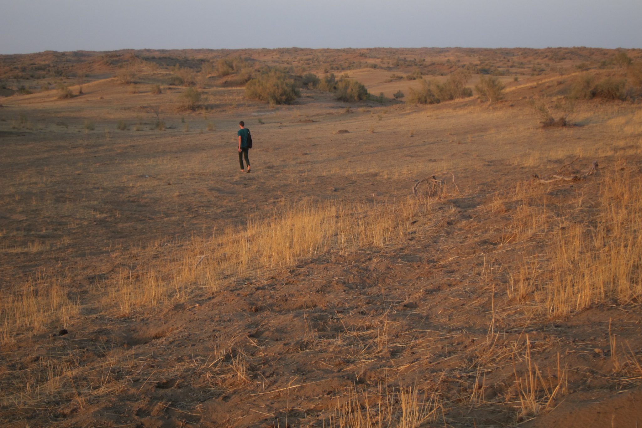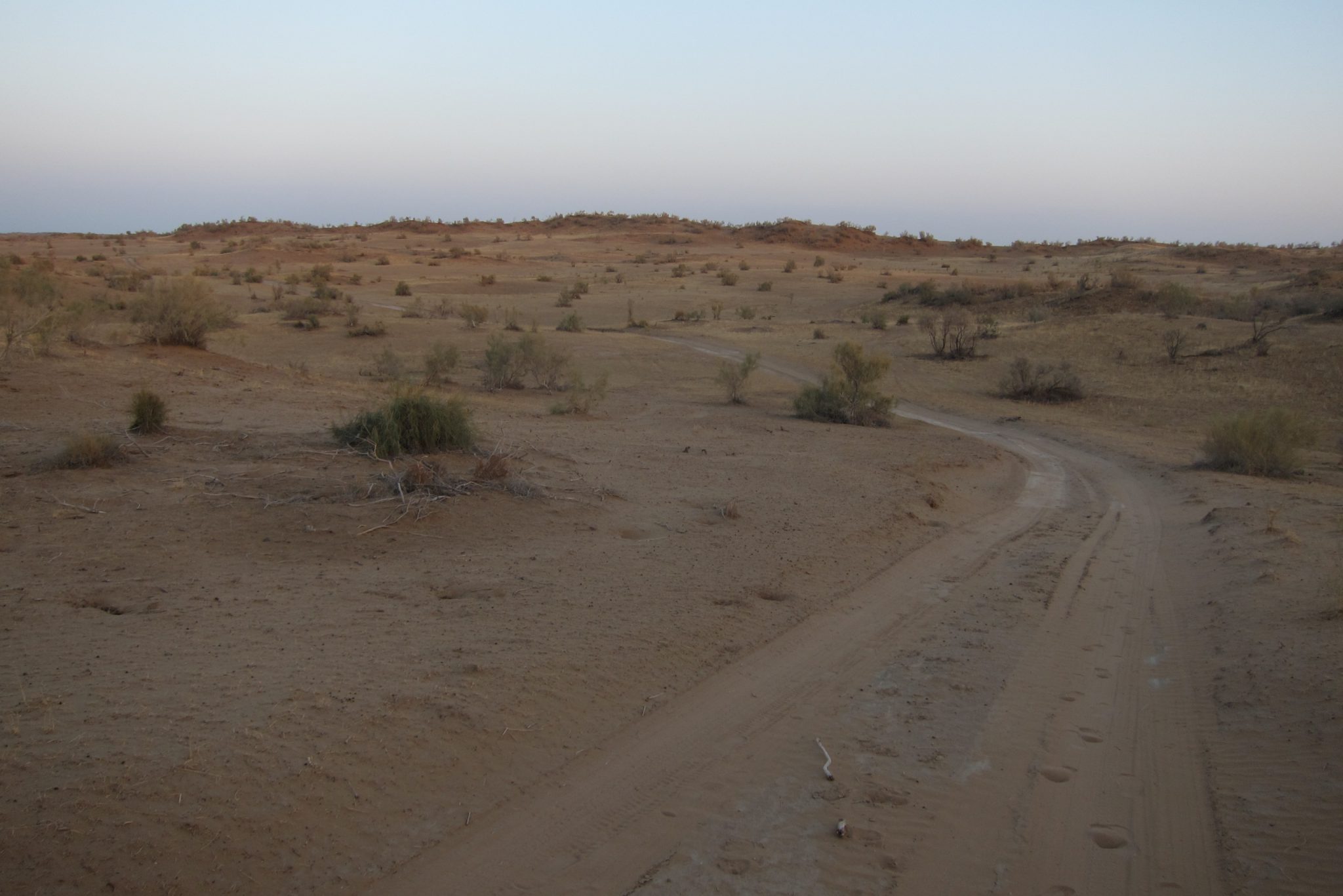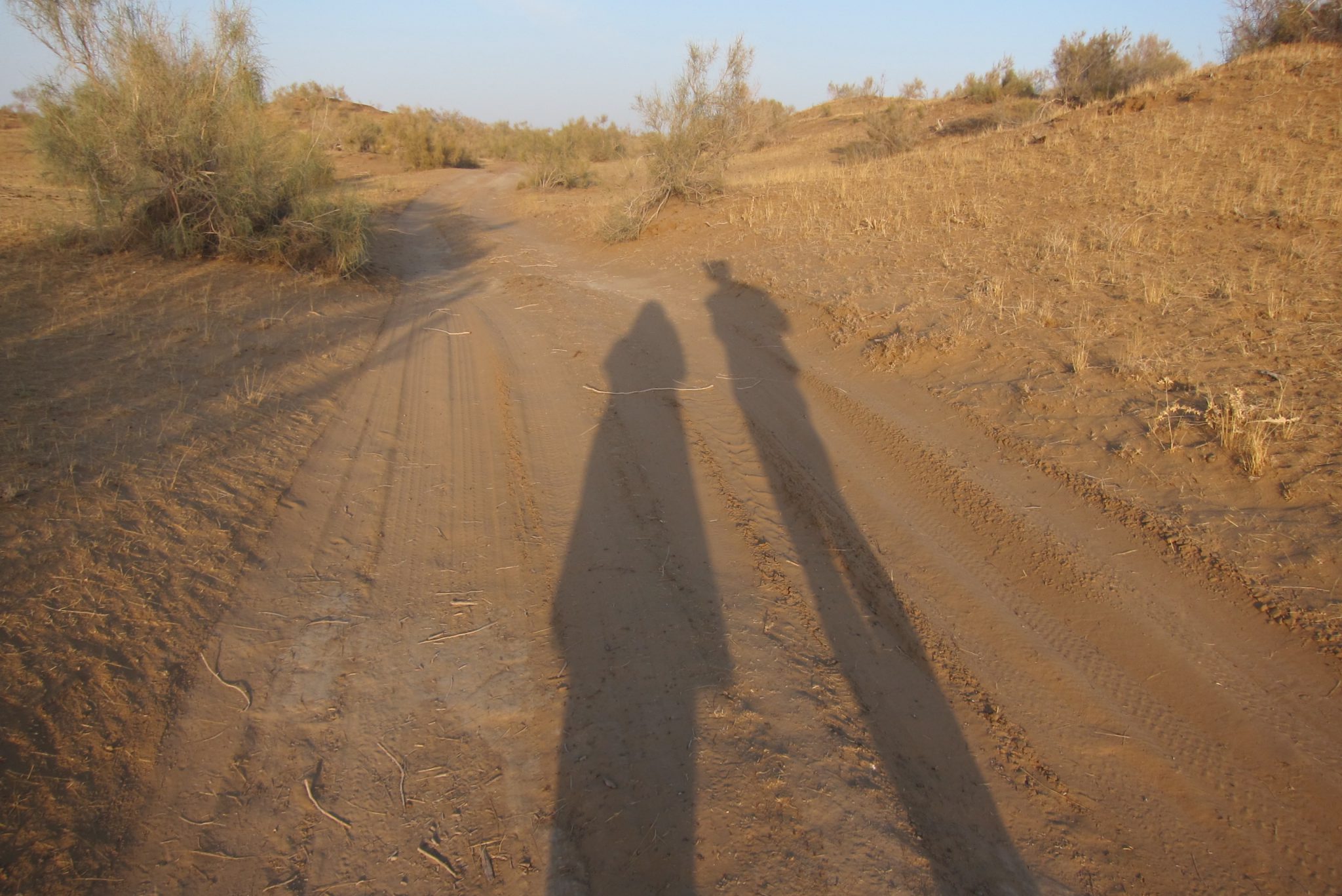 Mēs ejam pa ceļu, vērojot stepes pauguriņus saulrietā. Ik pa laikam ceļu šķērso kāda aša vabole, bet pa malām skraida žurkām līdzīgie dzīvnieciņi. Jā, tā ir taisnība – pēc pārdesmit minūtēm visa apkaime izskatās līdzīga, mūsu orientieris ir ceļš. (Un gps somā). Saule tuvojas horizontam un nolemjam, ka laiks griezties māju virzienā – drīz paliks auksti un gribas tikt galā pa gaismu. Vēl tikai uzrāpjamies tuvākajā kāpā un veramies apkārt. Otrpus kāpai redzami kapi, bet visur citur, cik tālu sniedzas skats – stepe, stepe, stepe. Atceļā vēl redzam kā gani uz moča pīpinot dzen mājup aitu baru.