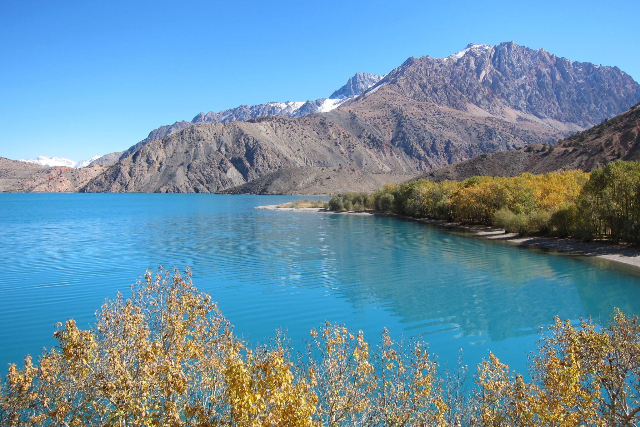 Drīz jau parādās arī pats Iskandarkulas ezers. Šoferis mūs aizved līdz tūristu bāzei ezera krastā un dod laiku pastaigai. Ejam caur lieliem dzelteniem kokiem ūdens virzienā. Sākumā tikai mazliet redzams ezera stūris, bet izgājuši klajākā vietā ieraugām to visā krāšņumā. Mūsu slavenajai Intuīcijai bija savi iemesli mūs iepriekšējā naktī ievest briesmīgajos apstākļos un izmest no gultas tādā agrumā.