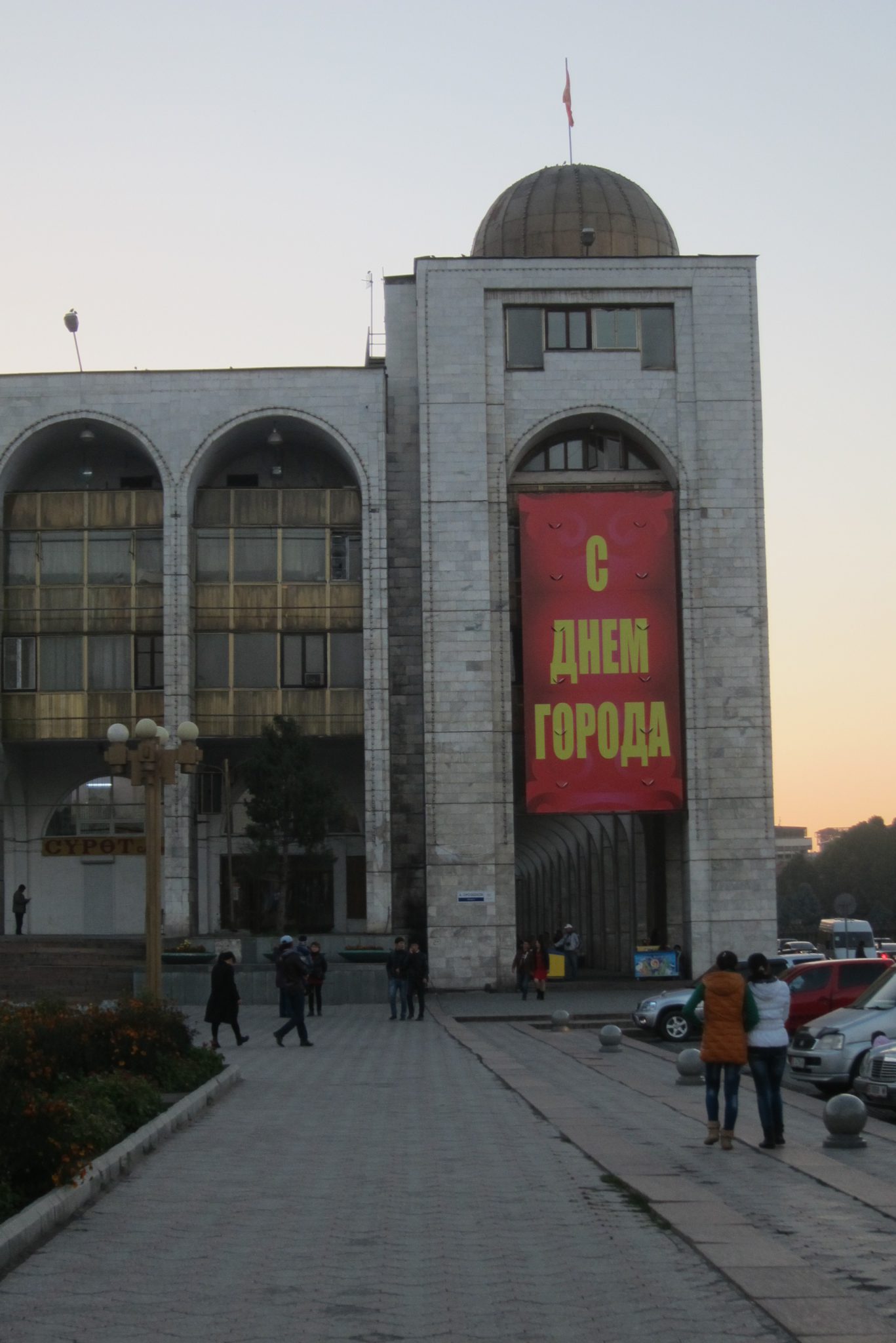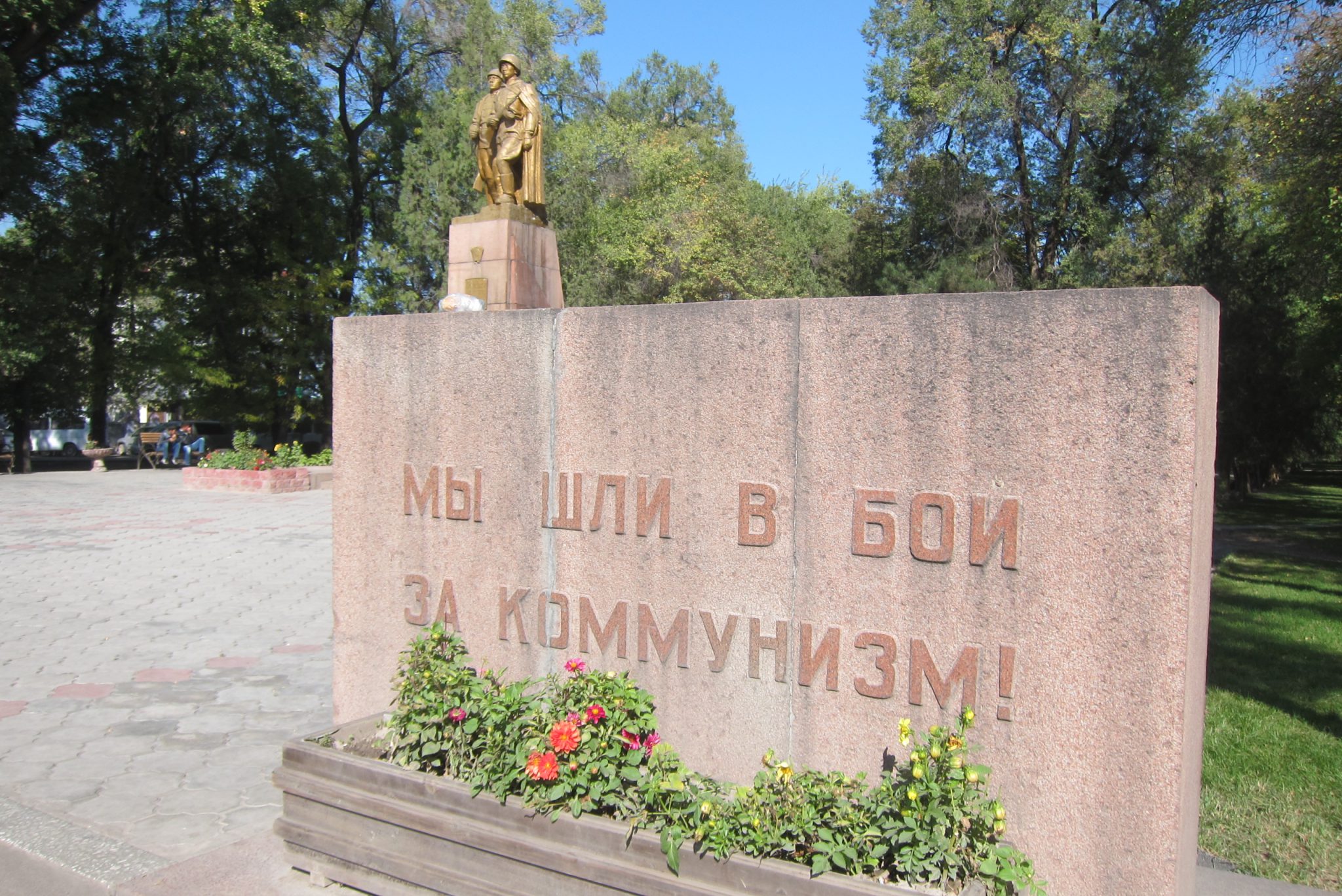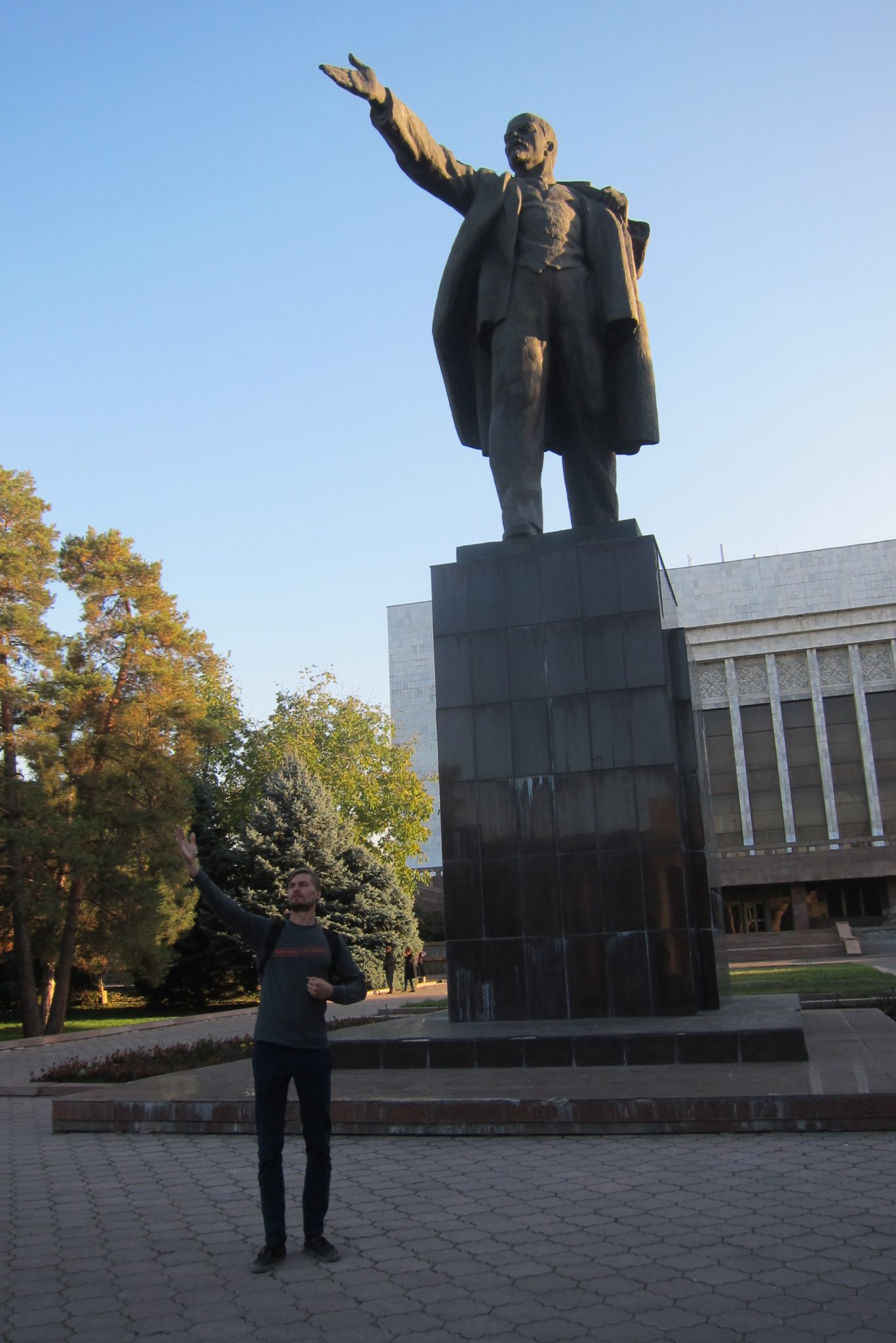 Iešaujam pietirgus stalovajā kaut ko apēst un atkal mūs uzrunā pankūkas – šodien būs pankūku diena, labi. Tad paņemam taksi līdz Ļeņina piemineklim, lai varu atrast vienu slēpni un atzīmēties Kirgizstānā. Ivaram šī nodarbe nešķiet diez ko saprātīga, bet ceļojot dažreiz nākas paiet solīti pretī otra interesēm. Vispār kopumā mums reti sanāk meklēt kompromisus, jo pārsvarā piekrītam viens otra viedoklim. Slēpni šoreiz atrodu ātri un tur negaidīti varu savākt veselus četrus “trackables”. Tad esam nopelnījuši labu kafiju – galvaspilsētās atsevišķās vietās tādu var atrast.