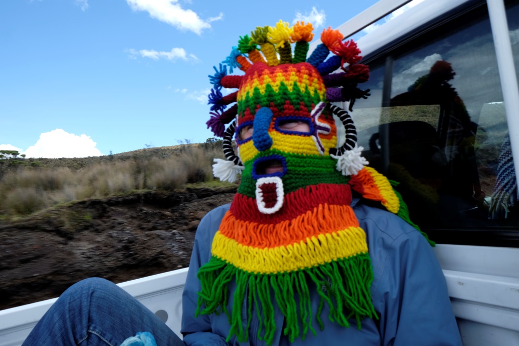 Auto mūs uzved līdz stāvvietai pie kalna un sarunājam pēc stundas pastaigas satikties tepat. Nelsons uzskrien kalnā kā briedis – priekš bolīvieša 4000 metri virs jūras līmeņa ir tīrā ikdiena. Kristīne ar Ulriku lēnām klunkurē augšup, es ar visu savu iedzīvi mugursomā velkos nopakaļus. Toties uzstādu jaunu personisko augstuma rekordu – 4500 metrus. Sabildējuši apkārtējo daili un viens otru, dodamies lejā. Tur, gaidot Nelsonu, kas vēl spriņģo pa kalnu, ieturam vieglu maltīti – man nav līdzi ēdiens, tāpēc uzskatu par piemērotu momentu tikt vaļā no vienas Laimas šokolādes tāfelītes. Soma būs par 100 gramiem vieglāka.