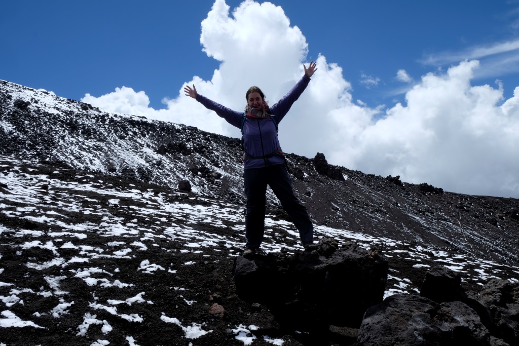 Lai tiktu pie vulkāna visiem jāpiereģistrējas, ko mēs arī godīgi izdarām, toties ieejas maksas nav vispār. Nu jau tuvojamies sniega klātajam milzu vulkānam un skati top aizvien elpu aizraujošāki. Priecājamies, ka sēžam atklātā telpā un varam bildēt cik gribas. To arī darām – bildējam kalnu, ceļu, viens otru. Un visu laiku atrodam par ko smieties. Lie-lis-ki!