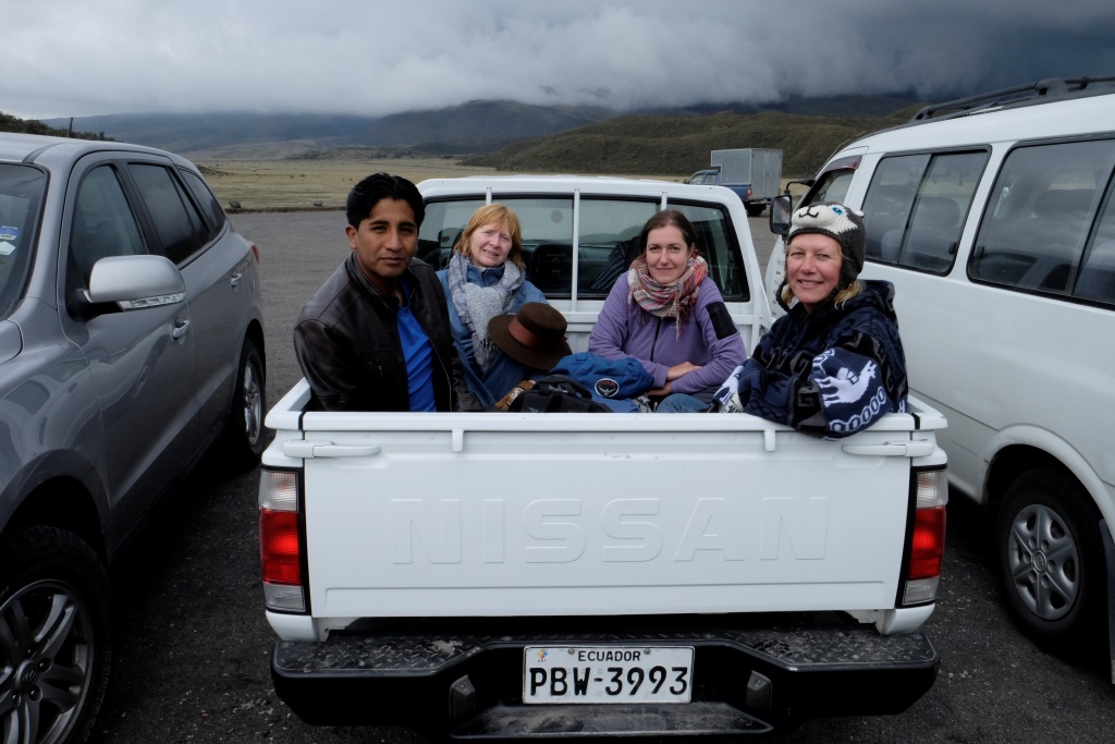 Jā, bet, pirms turpinām notikumu attīstību, iepazīstamies. Esam starptautiska sabiedrība. Vācija, Dānija un Bolīvija. Ulrika, Kristīne, Nelsons. Un Latvija. Es. Visi trīs dzīvo šeit Ekvadorā un ir transcendentālās meditācijas skolotāji. Ulrika ir visaktīvākā – viņa vienmēr atrodot īpašus kontaktus un izdevīgus darījumus. Arī šoreiz Ulrika uzņemas situācijas risināšanas iniciatīvu – sākumā viņa sazvana paziņu un grib sarunāt taksi no Latacungas. Diemžēl pazīstamais taksists aizbraucis visai tālu pavisam citā virzienā. Ulrika, ieraudzījusi stāvam kādu pikapu, pieiet pie tā un sāk šoferim skaidrot, ka mums vajadzīgs transports, esam gatavi pa visiem maksāt 40 dolārus (kas šeit ir gana laba nauda), vai viņš nebūtu gatavs mūs aizvest. Šoferis ir gatavs un mēs visi saklūpam piekabē.