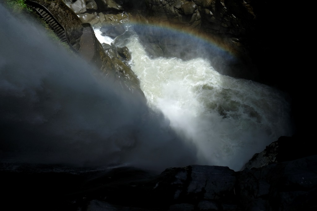 Pa ceļām pieturam pie klints, kurā jāsaskata Jēzus Kristus ģīmis, tad pie kanopi, tad pie vagoniņa, kas brauc uz ūdenskritumiem. Viss notiek ļoti lēnām un ļoti tūristiski. Nevar teikt, ka esam vīlušies, bet nu ir pieredzēti arī interesantāki izbraucieni. Beigās braucamais pietur pie upes – par 1,50 USD papildus (šitā viņiem ir baigā mode – tu samaksā par braucienu, bet visu laiku parādās papildus atrakcijas, par kurām jāpiemaksā „one dollar extra”) var doties pie ūdenskritumiem. Ja jau esam atraukuši, jādodas ir. Jau pēc daždesmit metriem var dzirdēt upes trakošanu un rodas sajūta, ka „tur kaut kam ir jābūt”. Jo tālāk ejam, jo neticamāki skati paveras. Pa šauru trošu tiltiņu nonākam līdz pagriezienam, kur var redzēt stāvu ūdens stabu triecamies zemē. Pa mazām kāpnītēm var nokāpt pat līdz ūdens šaltīm, un vērot kā baltā siena triecas tieši varavīksnē. Tagad gan mums ir mutes ciet – dēļ šī skata bija vērts tiekties šurp.