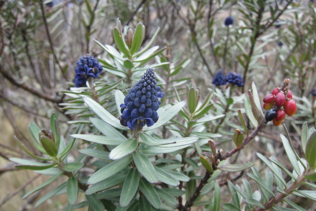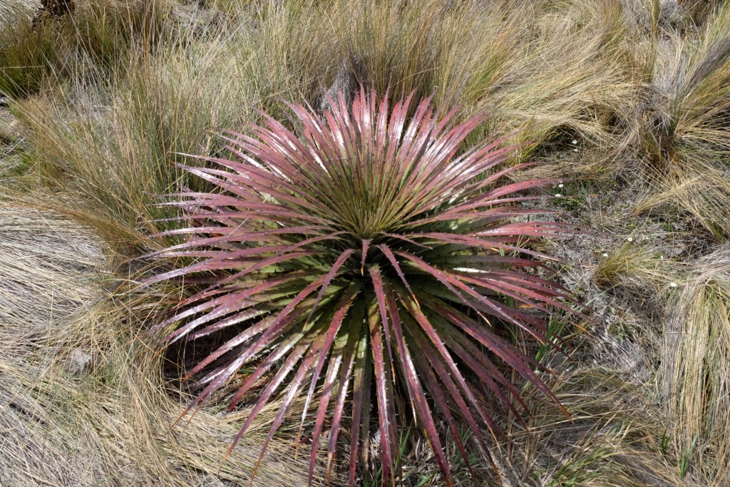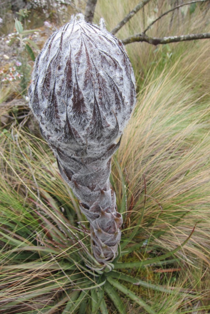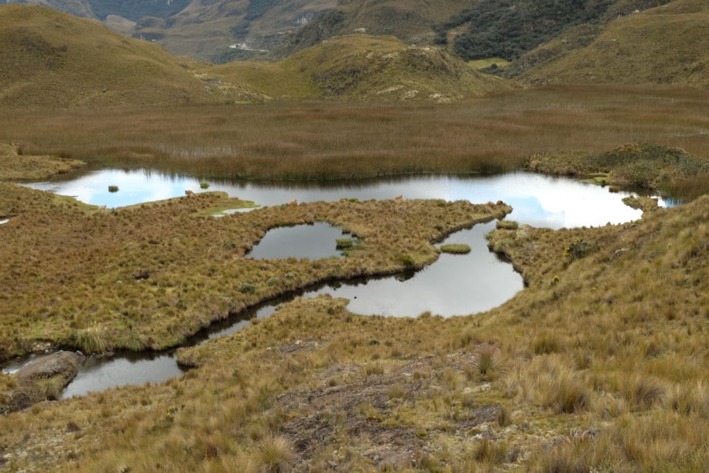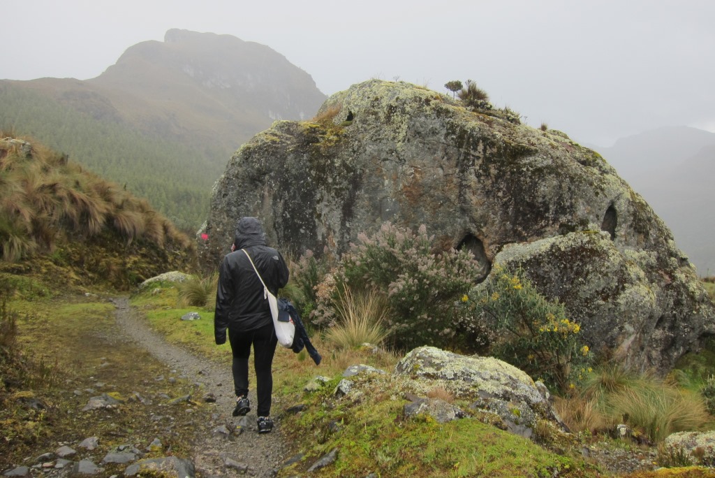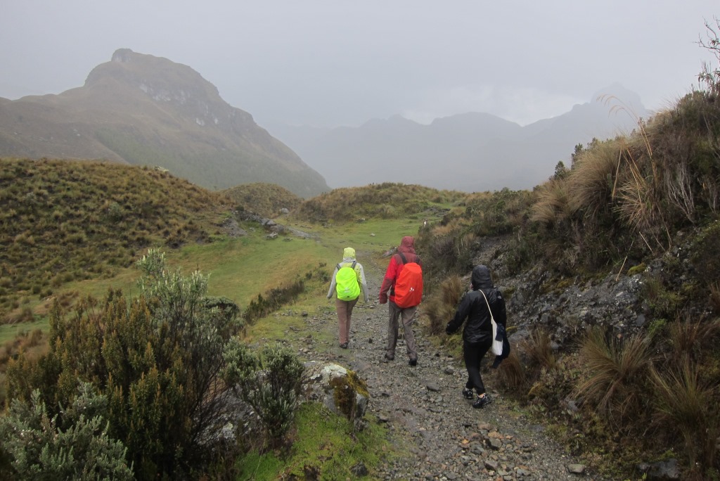 Kamēr mēs tā smuki sēžam, sāk līt – laiks vilkt ārā otru neiztrūkstošo Ekvadoras inventāru. Nu jau ejam uz priekšu daudz ātrāk – lietū nevar visu laiku fotografēt. Satiekam tikpat salijušu pāri no Vācijas un meklējam izeju no parka kopā. Kāda kalna galā ieraugām šoseju – nopriecājamies, ka taka uz to ved lejup.