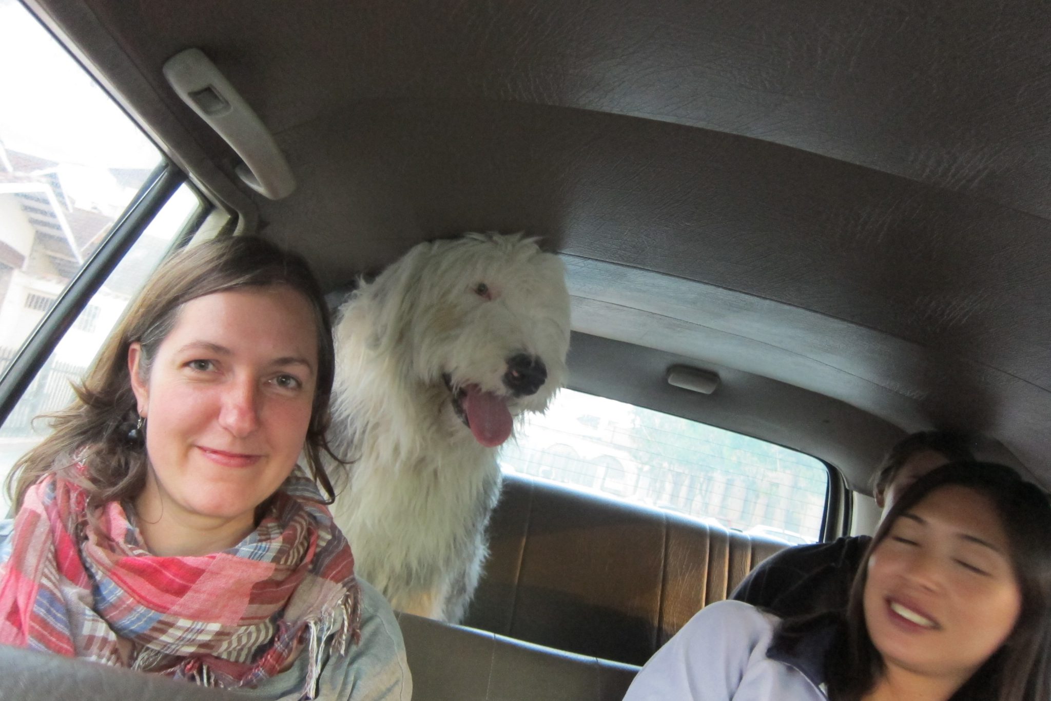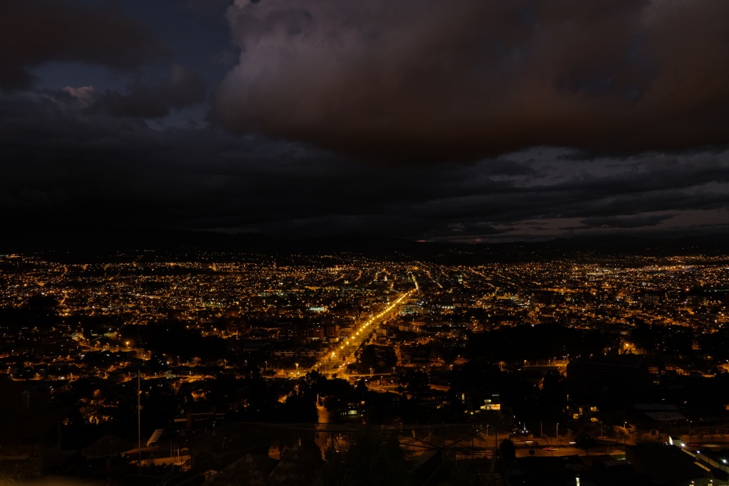 Lai arī jūtamies dikti sagurušas, no hosteļa saimnieka piedāvājuma izbraukt ar auto, lai apskatītu tumst sākušo pilsētu no kalna augšas, nevaram atteikties. Milzīga džipa aizmugurējā sēdeklī ielec spalvu kamols Vinss un hosteļa saimnieka meitene, vidējā sēdeklī es ar vēl pāris šejienes iemītnieki, pie stūres šoferis un priekšējā sēdeklī Amaija. Vinss negrib sēdēt un pie straujākiem bremzēšanas momentiem gāžas mums virsū ar visu savu masu. Ticis ārā no mašīnas, viņš priecīgs aizskrien savās darīšanās. Mēs mirkli papriecājāmies par naksnīgajām ugunīm, pamanāmies nosalt un dodamies atpakaļ.