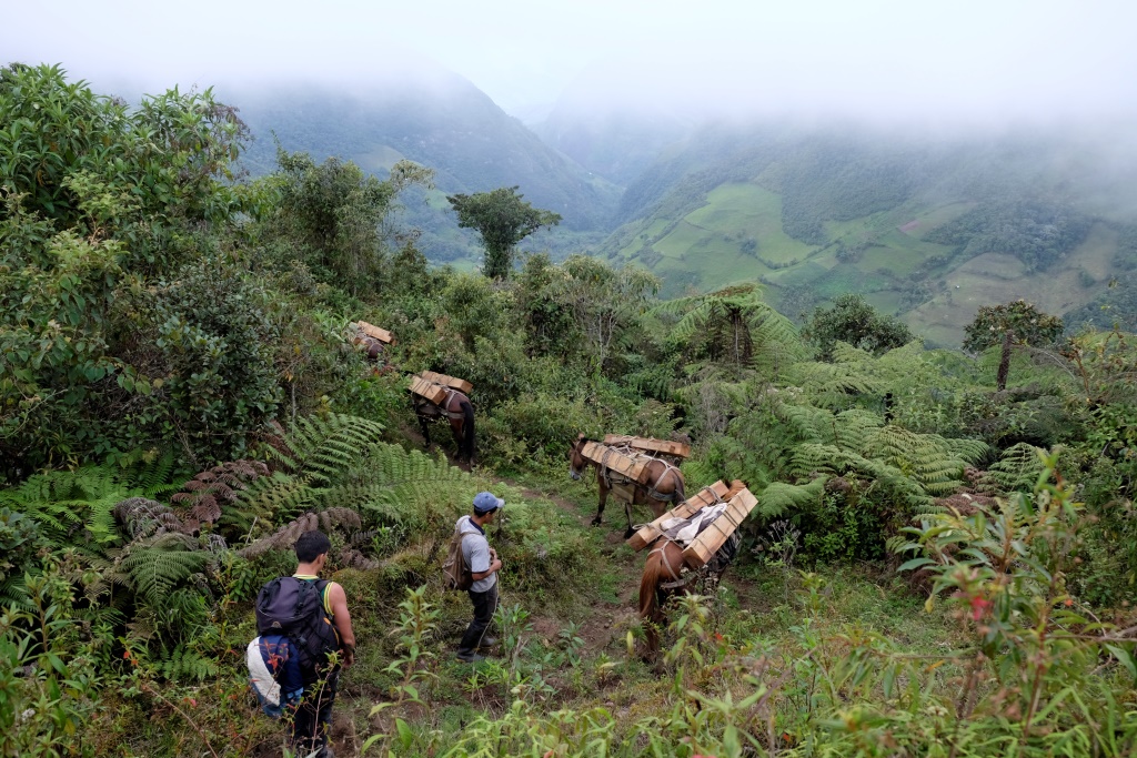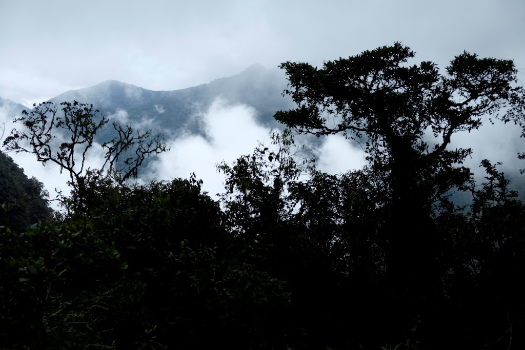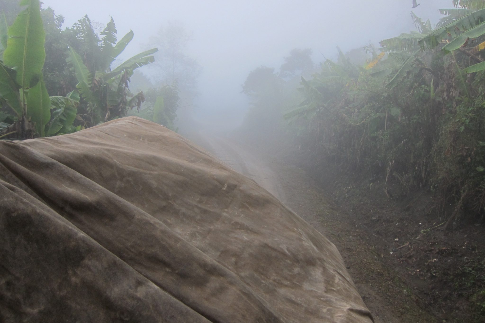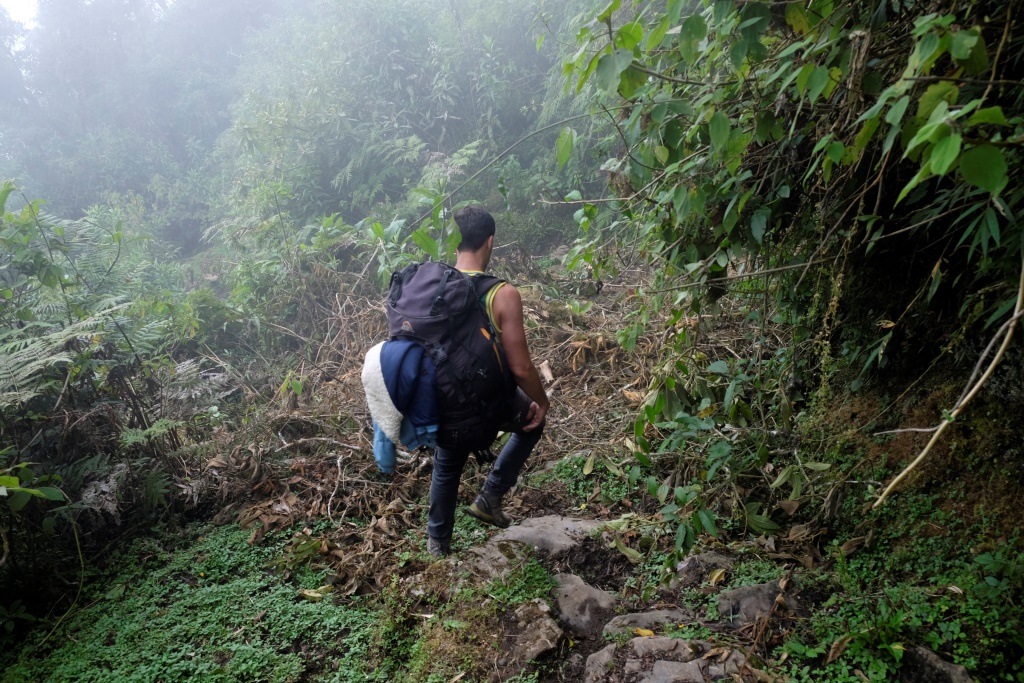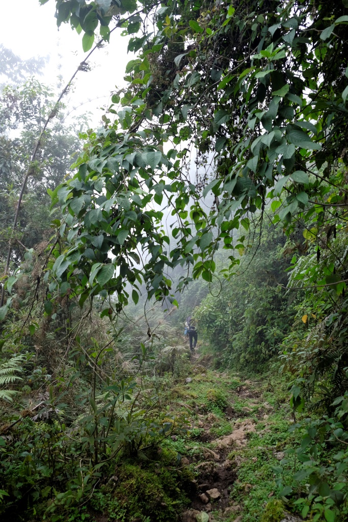 Lēzenais ceļa prieks nav ilgs, jau drīz taka atkal sāk vest kalnā. Šodienas apkaime gan krietni atšķiras no vakardienas – vakar gājām pa tipiskiem kalniem ar nelielu veģetāciju, bet šodien, par spīti vairāk kā 3000 metru augstumam, ejam pa džungļiem. Jo augstāk kāpjam, jo mitrāks kļūst. Tad mēs iebrienam mākoņos un caur miglu apkaimes džungļi izskatās vēl spocīgāk. Es negribu ēst brokastis, līdz neesam uzkāpuši līdz pārejai, bet netālu no kalna gala atrodu Čārliju, kurš vainīgi ēd avokado. „Man kaut ko vajadzēja apēst, ir teju pusdienlaiks”, viņš saka. Pirms mirkļa mums garām pagāja pāris vietējie uz zirgiem, šis apvaicājies, vai esmu vēl dzīva – pēc negulētās nakts mans kāpiena temps kļuvis vēl lēnāks. „Nemaz nepriecājies, esmu gan, tāpēc atdod manu pusi avokado”, ķircinu Čārliju un arī apsēžos ieturēties.