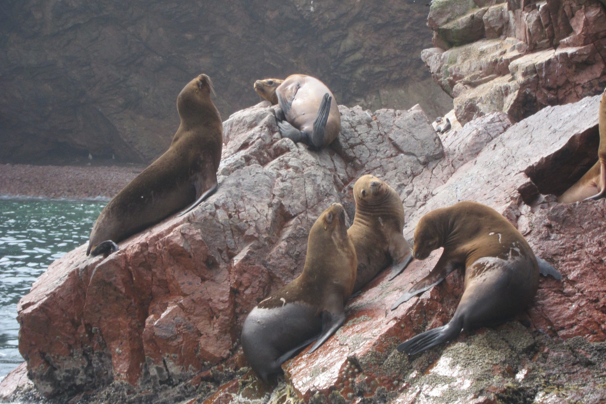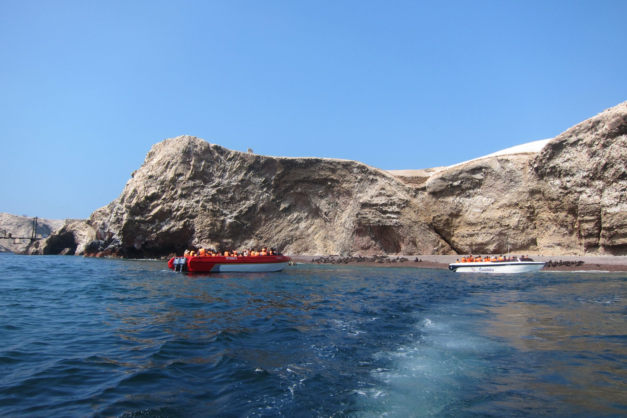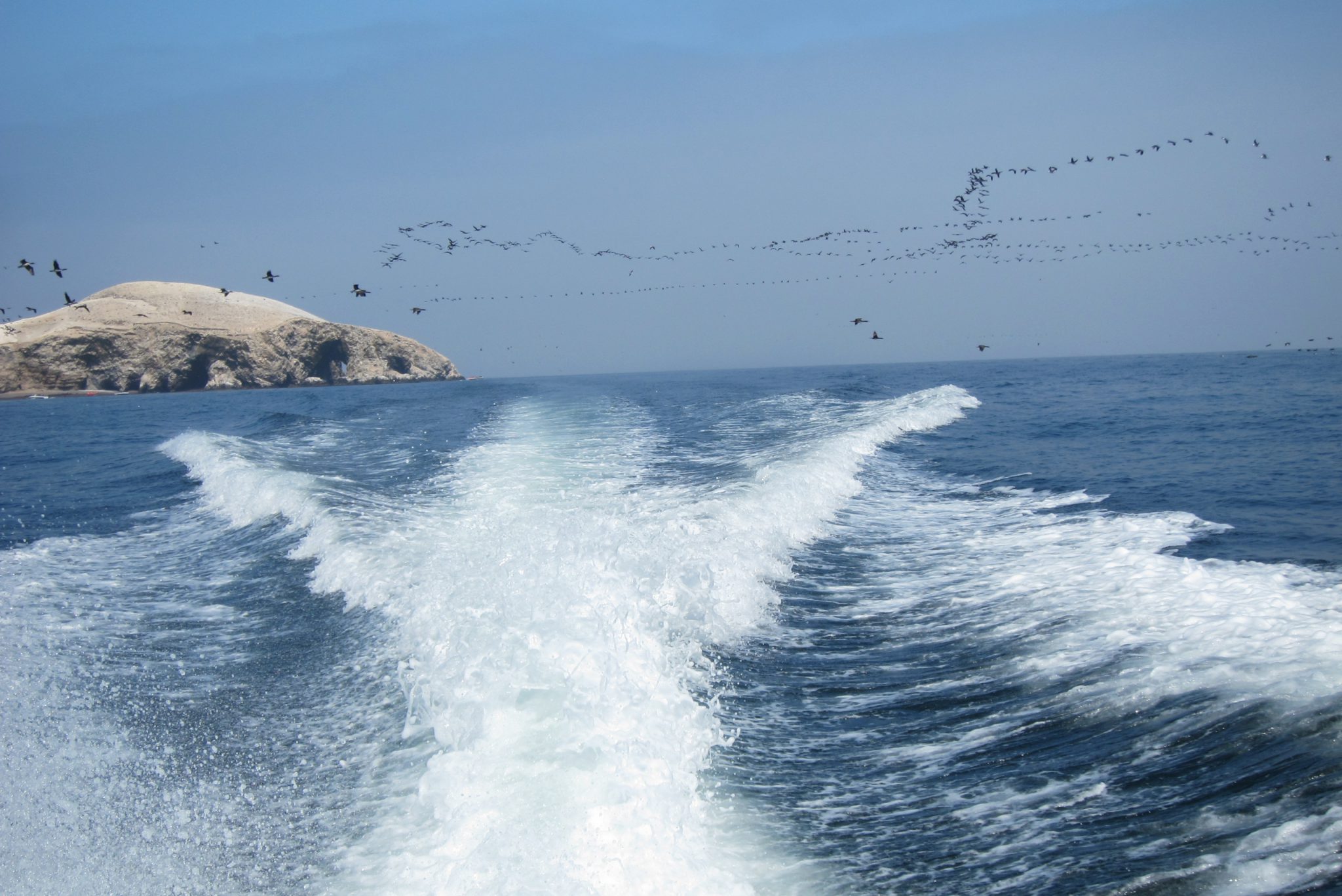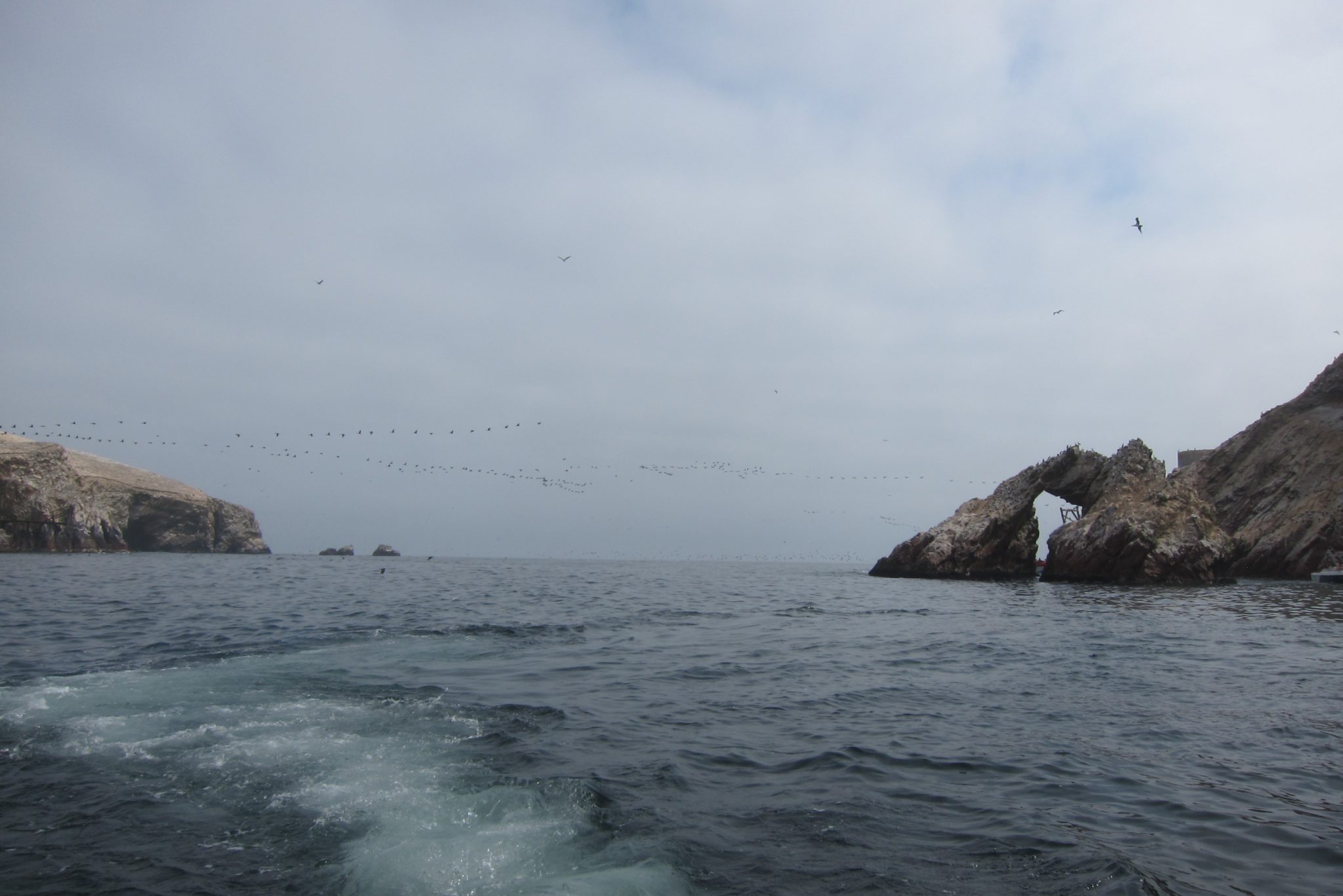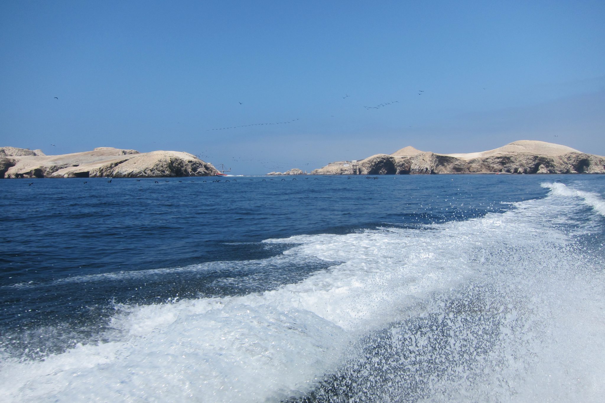 Pēc brokastīm ejam uz ostu, sasēžamies laivā un dodamies okeānā apskatīt salas un dzīvo radību. Sākumā laivas piestāj pie liela auga zīmējuma klintīs, tad dodamies uz tālākām salām, kuru malās satupuši pingvīni, jūras lauvas, pelikāni un citi putni, bet tuvāk ūdens līmenim vērojami lieli un mazi krabji. Mani šajā braucienā moka vainas apziņa – daudzās tūristu laivas, no kuru motoriem izplūst zilas dūmu vērpetes, noteikti nenāk par labu vietējai faunai.