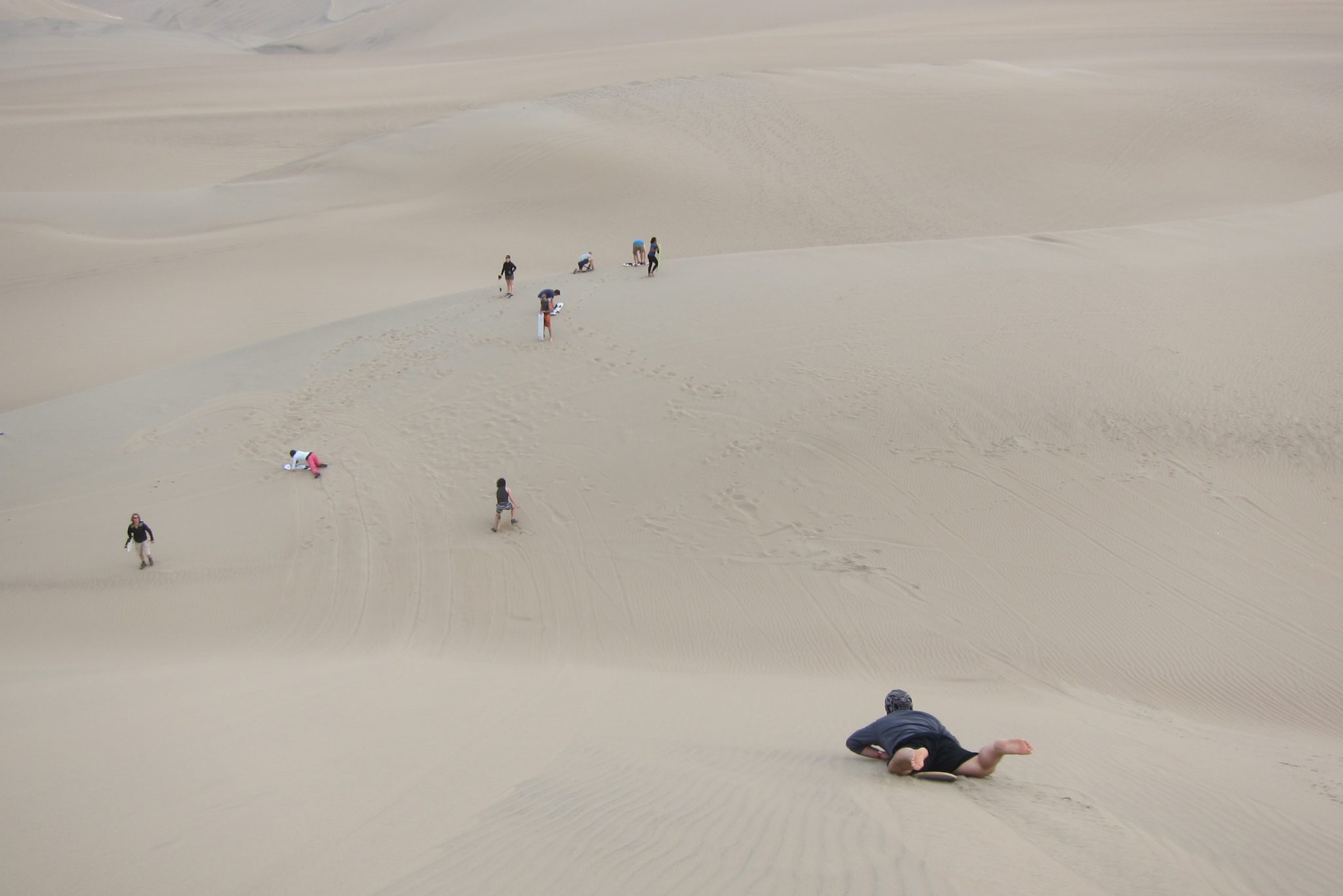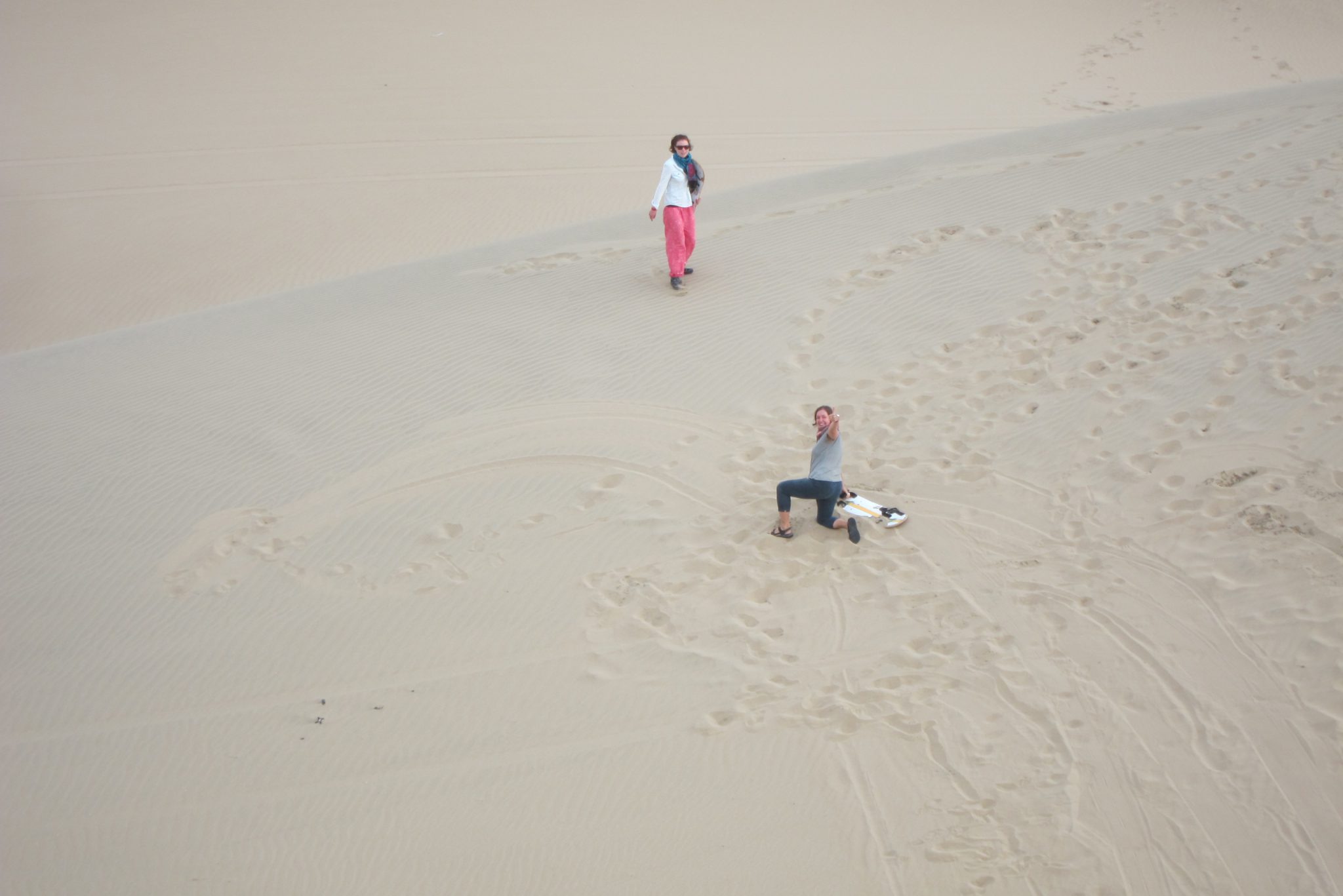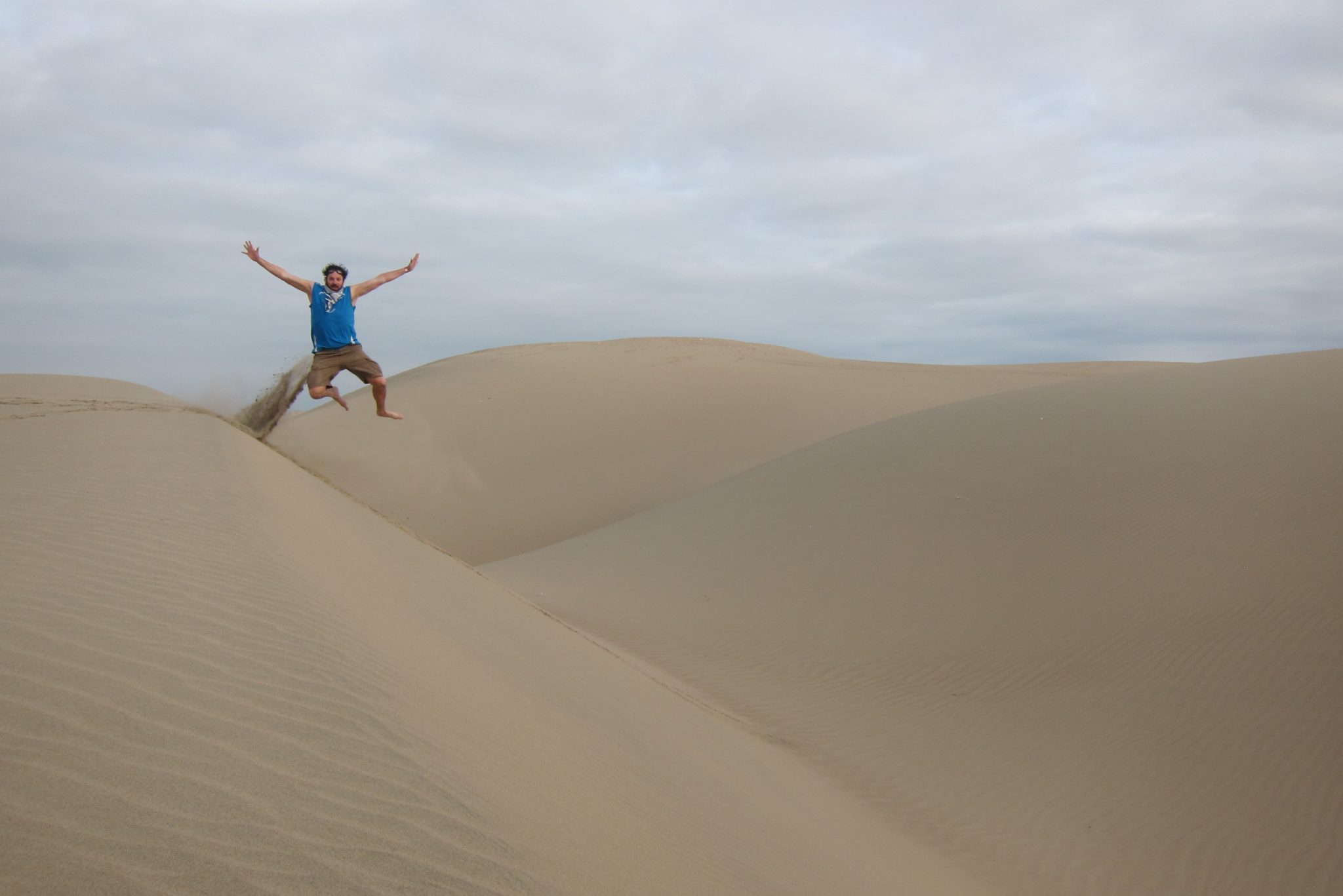 Sākam kāpt kalnā, kas ir aiz mūsu viesnīcas. Iesākumā iet tīri labi, bet tad smilšu siena top stāvāka un kājas slīd atpakaļ – jāliek lietā arī priekšējās ekstremitātes, lai tiktu uz priekšu. Augšā nonākam kārtīgi nomūrējušies ar smiltīm. Pastaigu turpinām pa kāpas kori, veroties uz visām pusēm. Vienīgi nožēlojam, ka nepaņēmām līdzi plastmasas maisu vai kādu citu plakni uz kuras šļūkt lejā. Bet arī lēkšot lieliem soļiem lejup ir gana jautri.