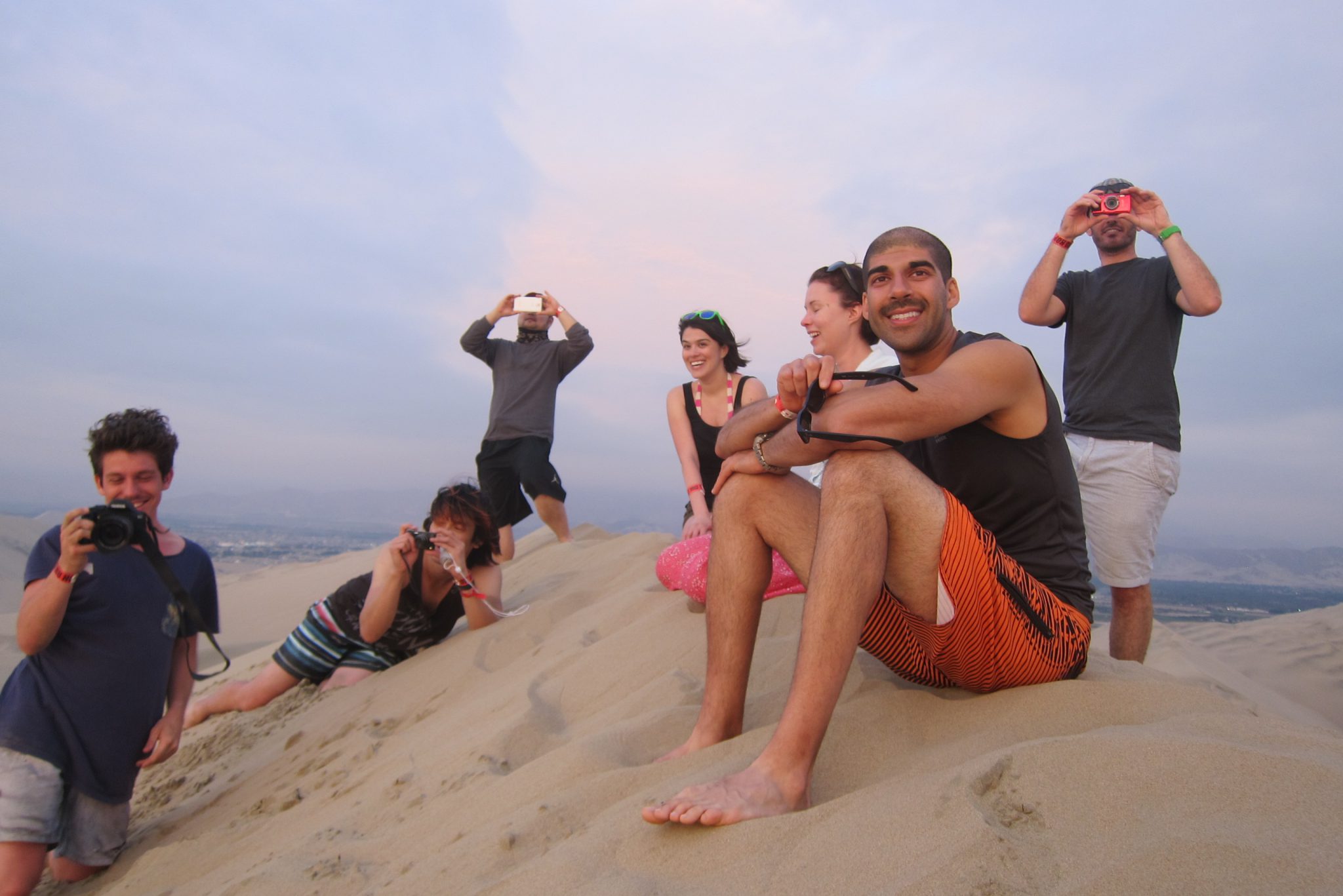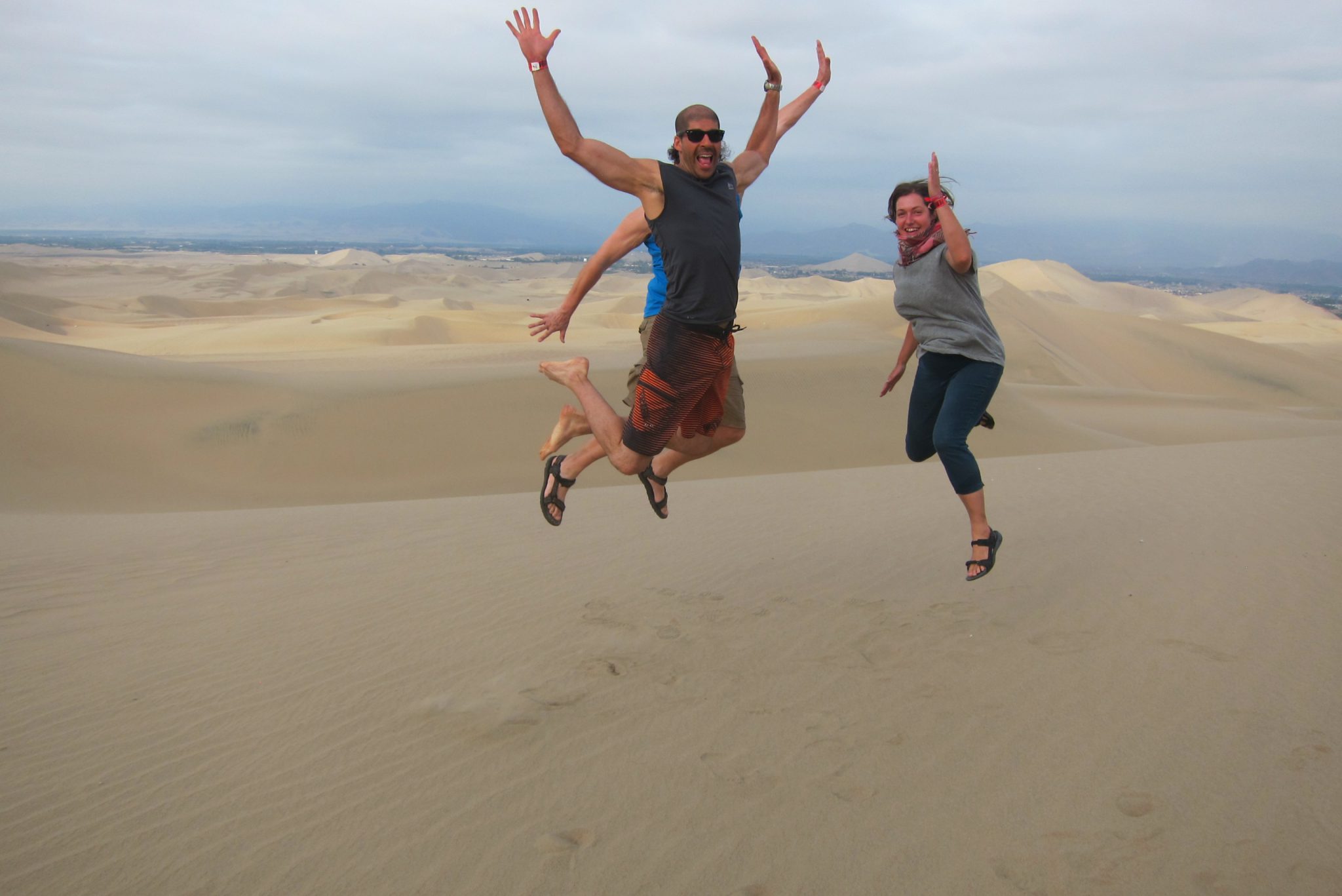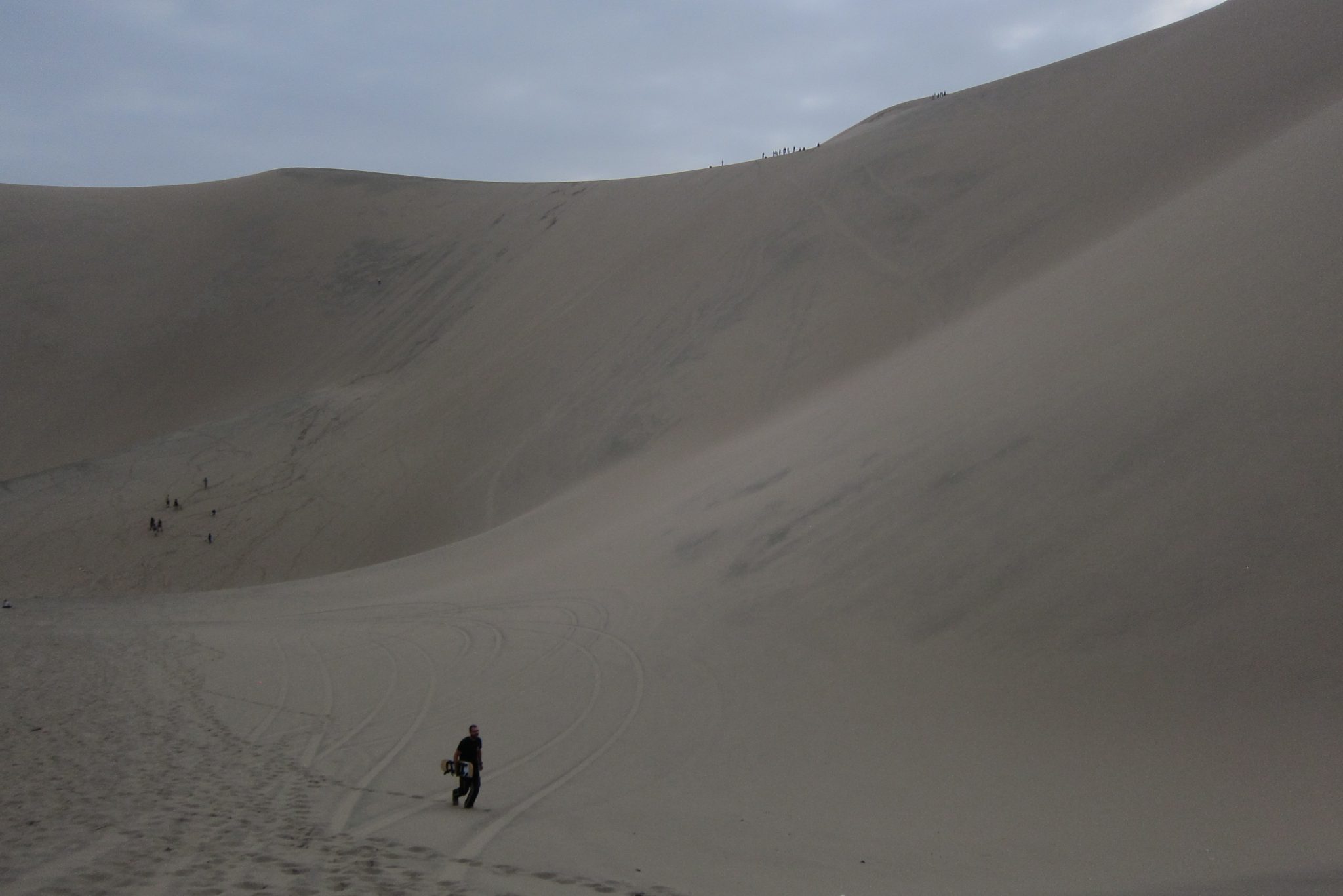 Sākam kāpt kalnā, kas ir aiz mūsu viesnīcas. Iesākumā iet tīri labi, bet tad smilšu siena top stāvāka un kājas slīd atpakaļ – jāliek lietā arī priekšējās ekstremitātes, lai tiktu uz priekšu. Augšā nonākam kārtīgi nomūrējušies ar smiltīm. Pastaigu turpinām pa kāpas kori, veroties uz visām pusēm. Vienīgi nožēlojam, ka nepaņēmām līdzi plastmasas maisu vai kādu citu plakni uz kuras šļūkt lejā. Bet arī lēkšot lieliem soļiem lejup ir gana jautri.
