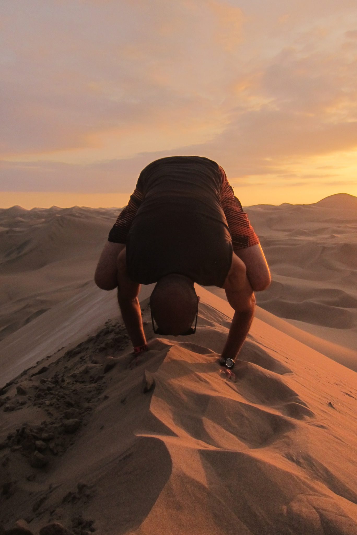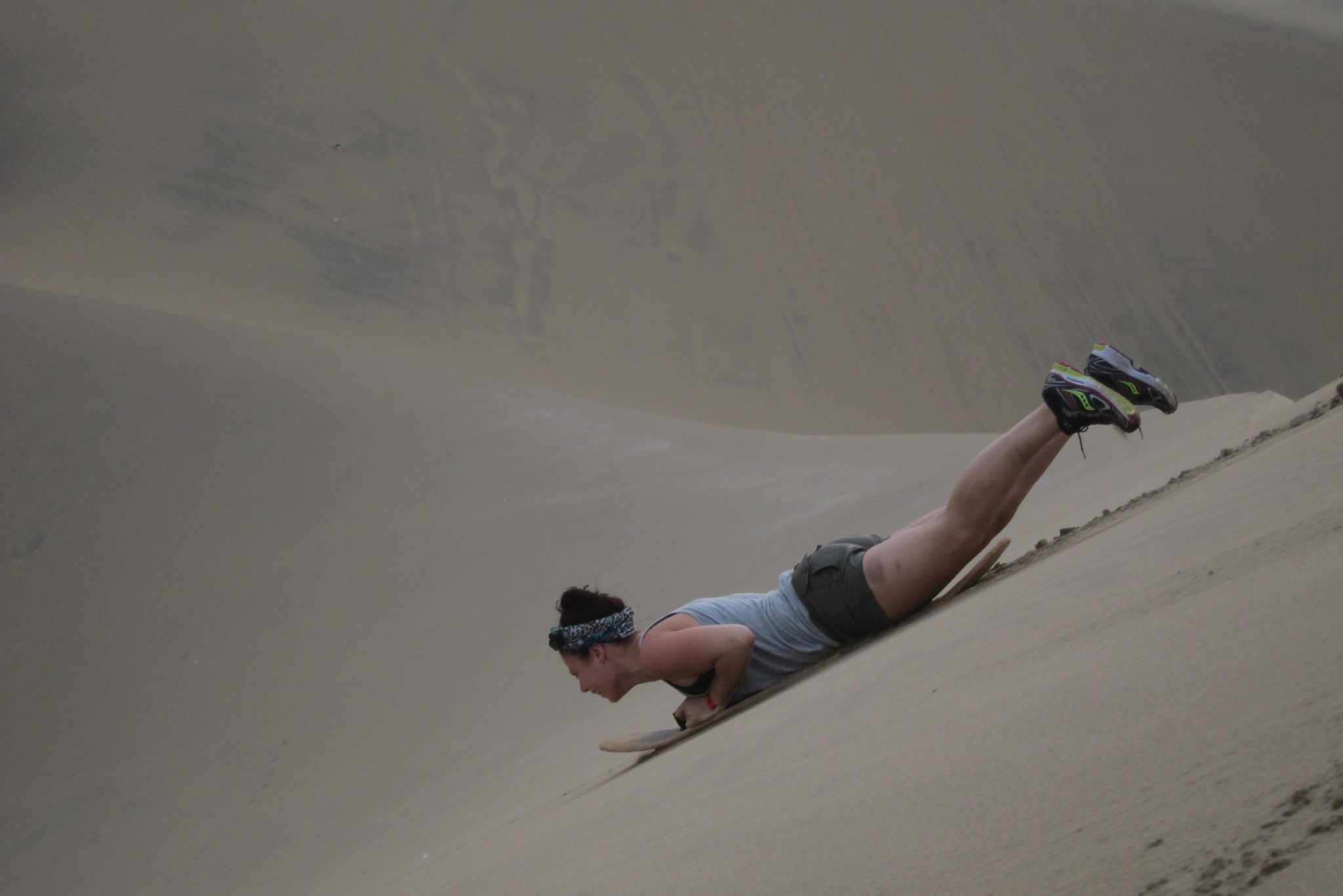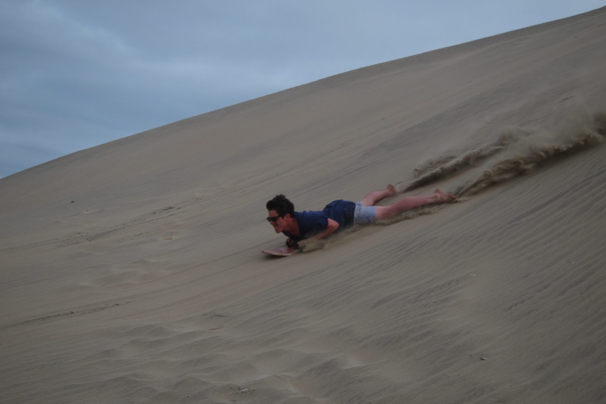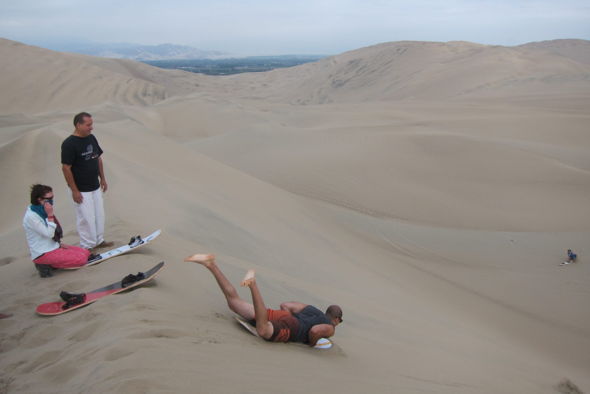 Stāvam pēdējā kalna galā – šoreiz īsti nevar redzēt kalna apakšu, nogāze ir gara un lejas pusē ir “lūzums”, aiz kura neredz kalna turpinājumu. Džouvī, īpaši nedomājot, uzsāk nobraucienu. Ātrums pieaug, smiltis put un, lai dzīve būtu vēl interesantāka, pamanām, ka kalna lejā ir tramplīni. Izskatās traki. Bet lejā jātiek ir un mēs, cits pēc cita, meklējot mazāk grubuļainu maršrutu, slīdam lejā. Iepriekš centos nebremzēt, gluži pretēji – attīstīt lielāku ātrumu, bet šoreiz pirmo kalna daļu šļūcu, ierakusies ar sandalēm smiltīs. Tāpat ātrums nav nekāds mazais un kalna lejas daļā jau lidoju kā raķete. Trāpu arī uz pāris tramplīniem, diezgan ekstrēma sajūta. Bet lejā tiekam visi un bez nopietniem savainojumiem – mikrotraumas gan ir vairākiem. Ali, piemēram, ir pamanījies nobrāzt ādu no divu kājas pirkstu virspuses.
